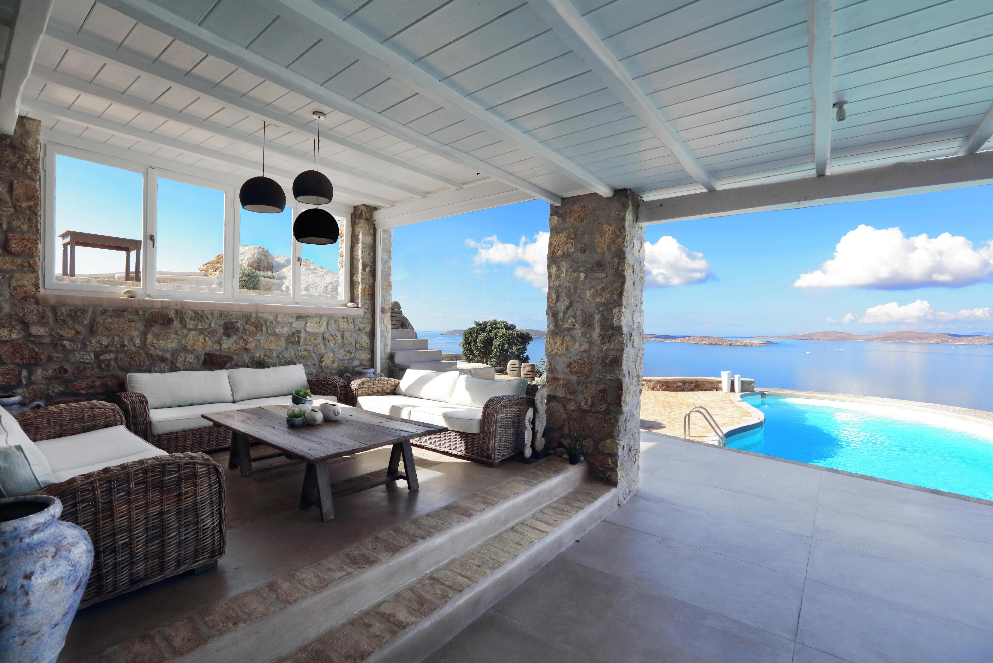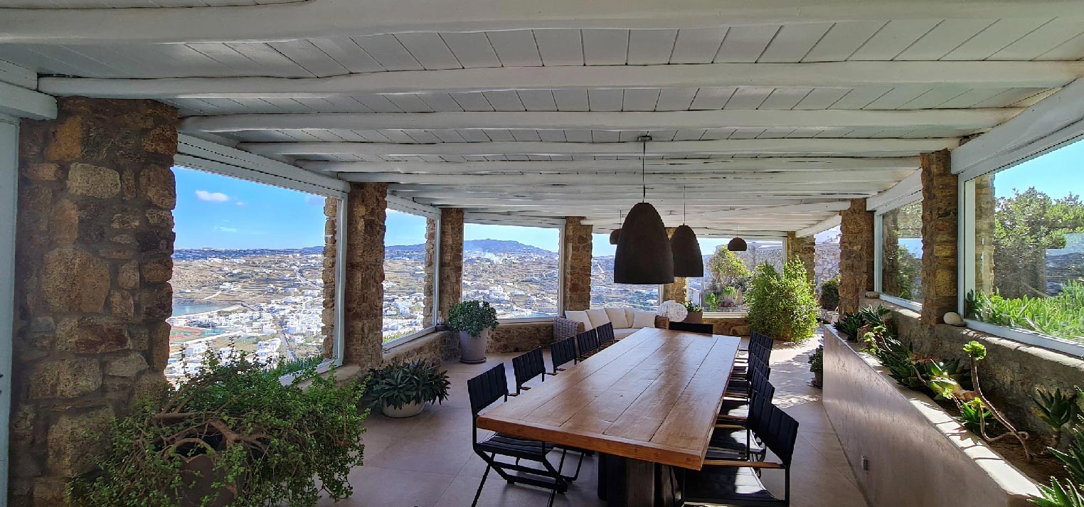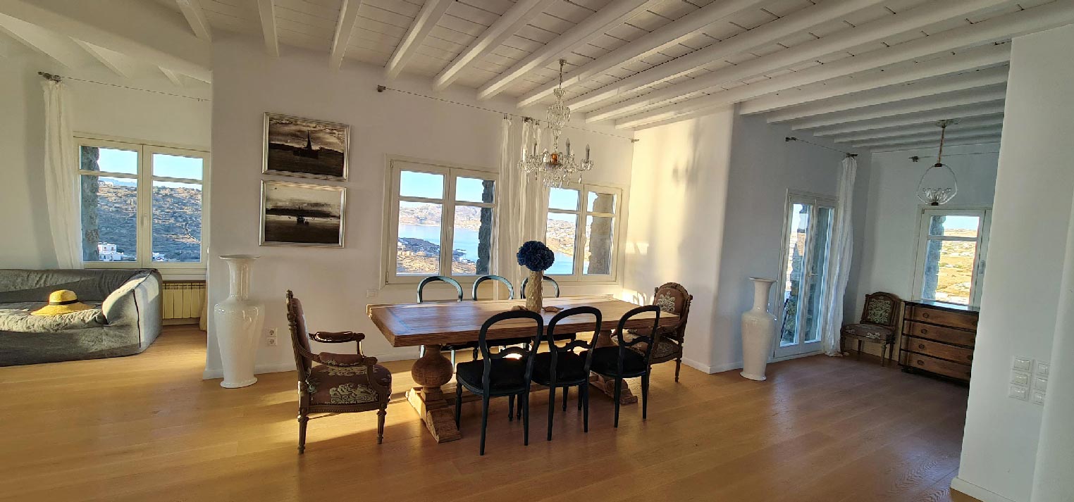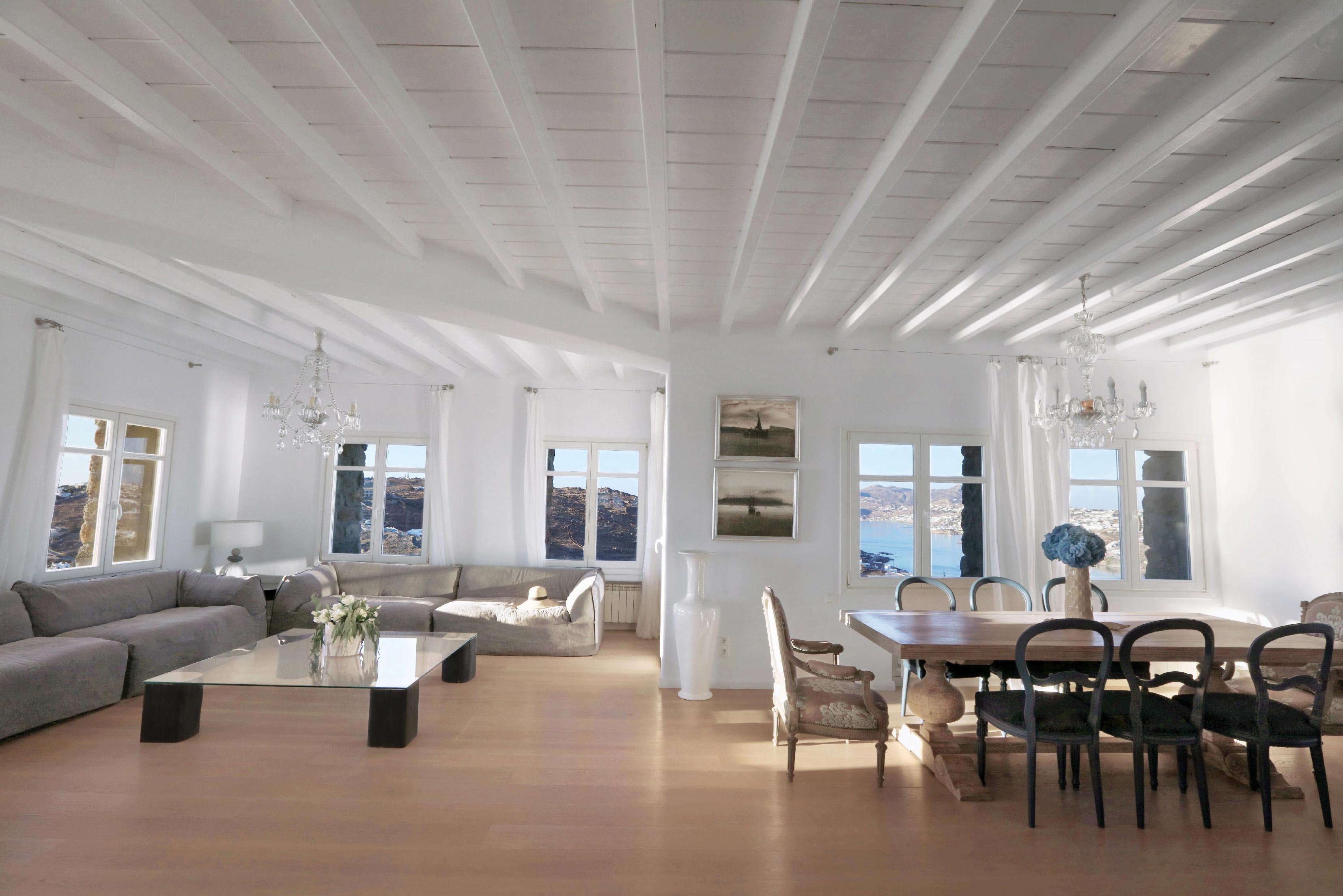 • Living Room & Dining Area of 75m2, with unique sea view/sunset view to Agios Ioannis bay, Delos Island, the port and town. The indoor living area can host up to 14 people and it has direct access to the pool area and the outdoor living area.