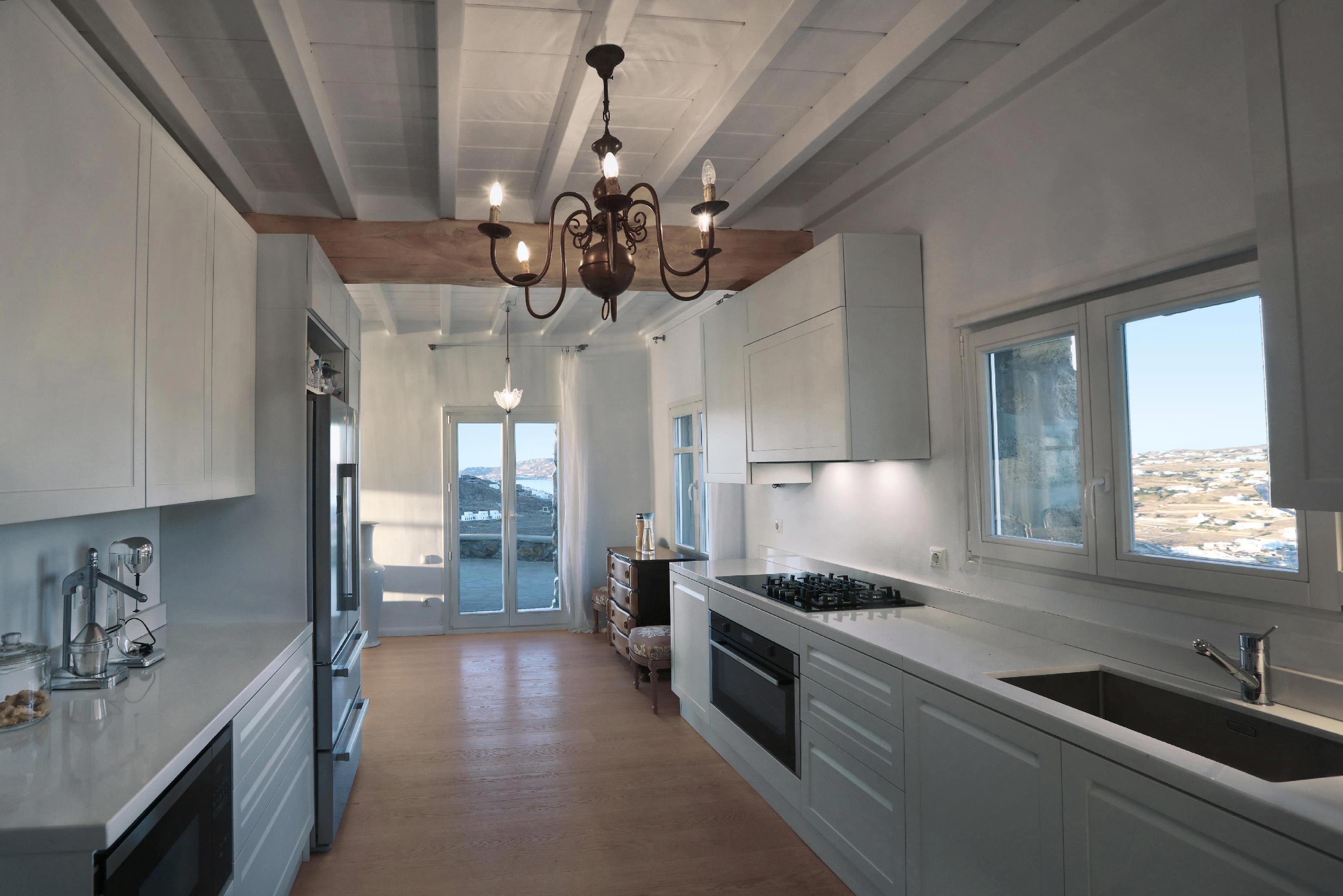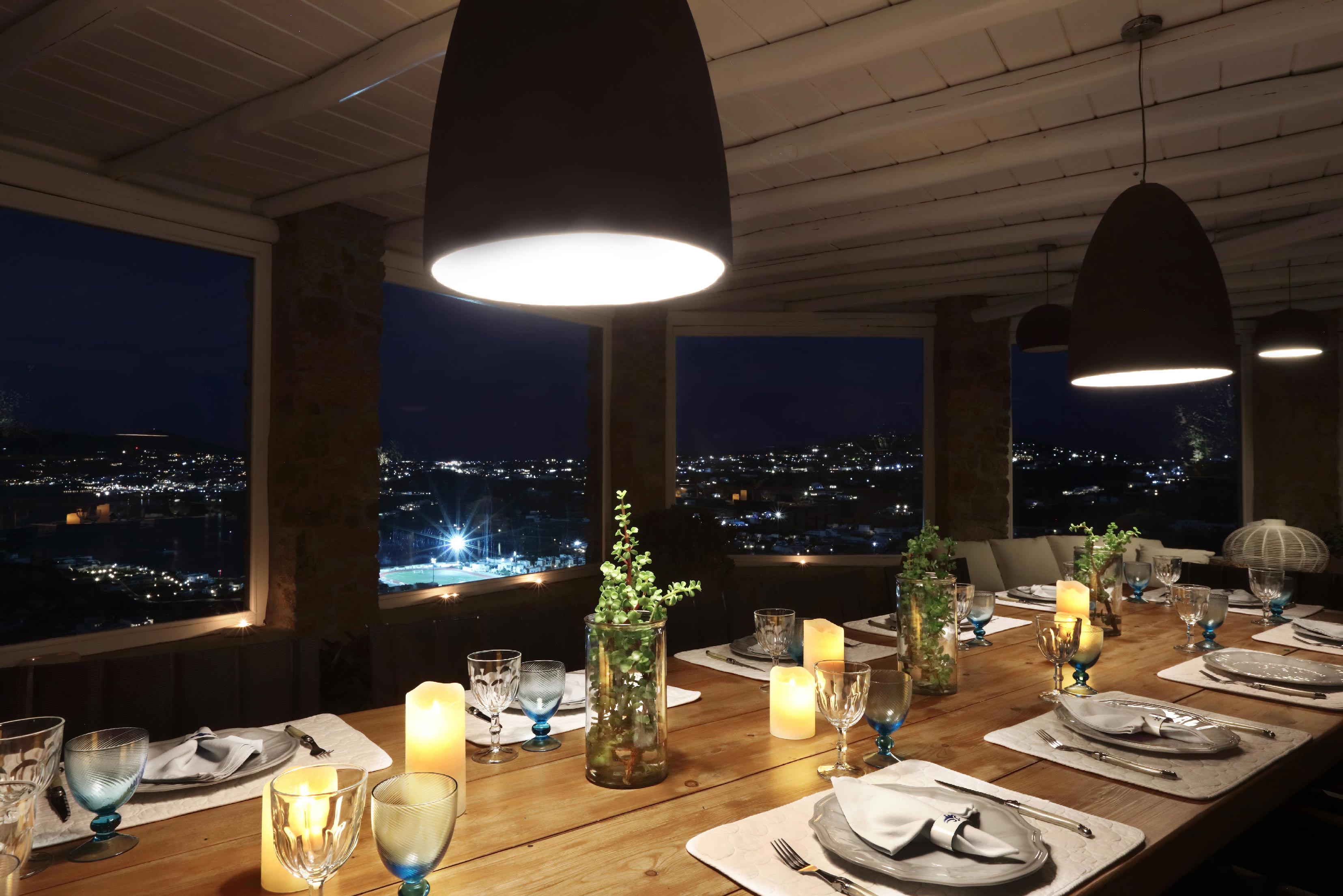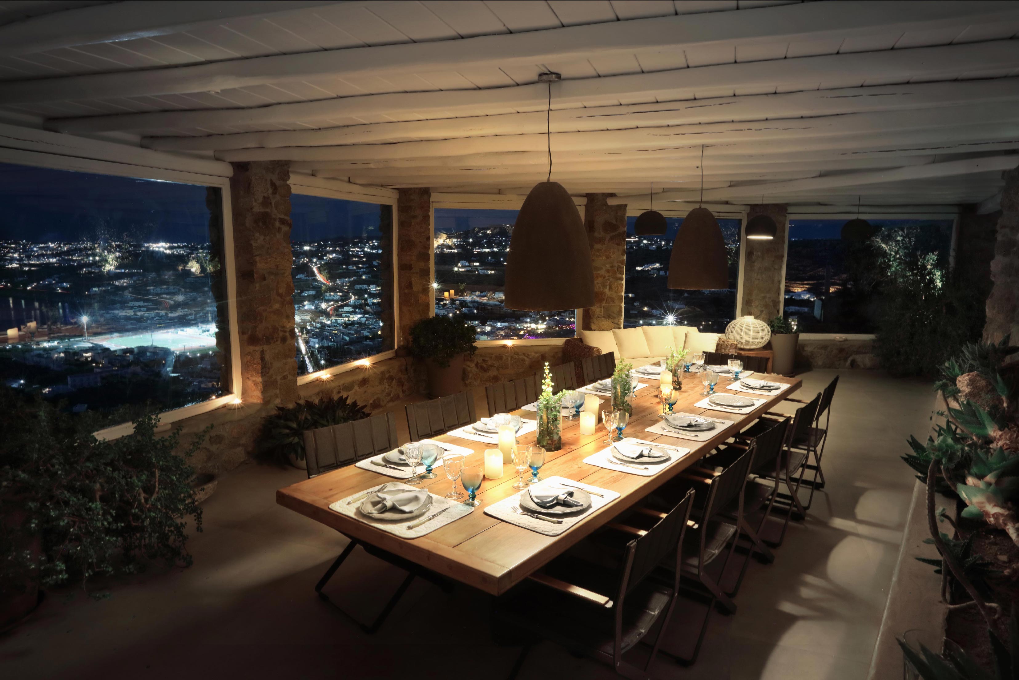 • Living Room & Dining Area of 75m2, with unique sea view/sunset view to Agios Ioannis bay, Delos Island, the port and town. The indoor living area can host up to 14 people and it has direct access to the pool area and the outdoor living area.