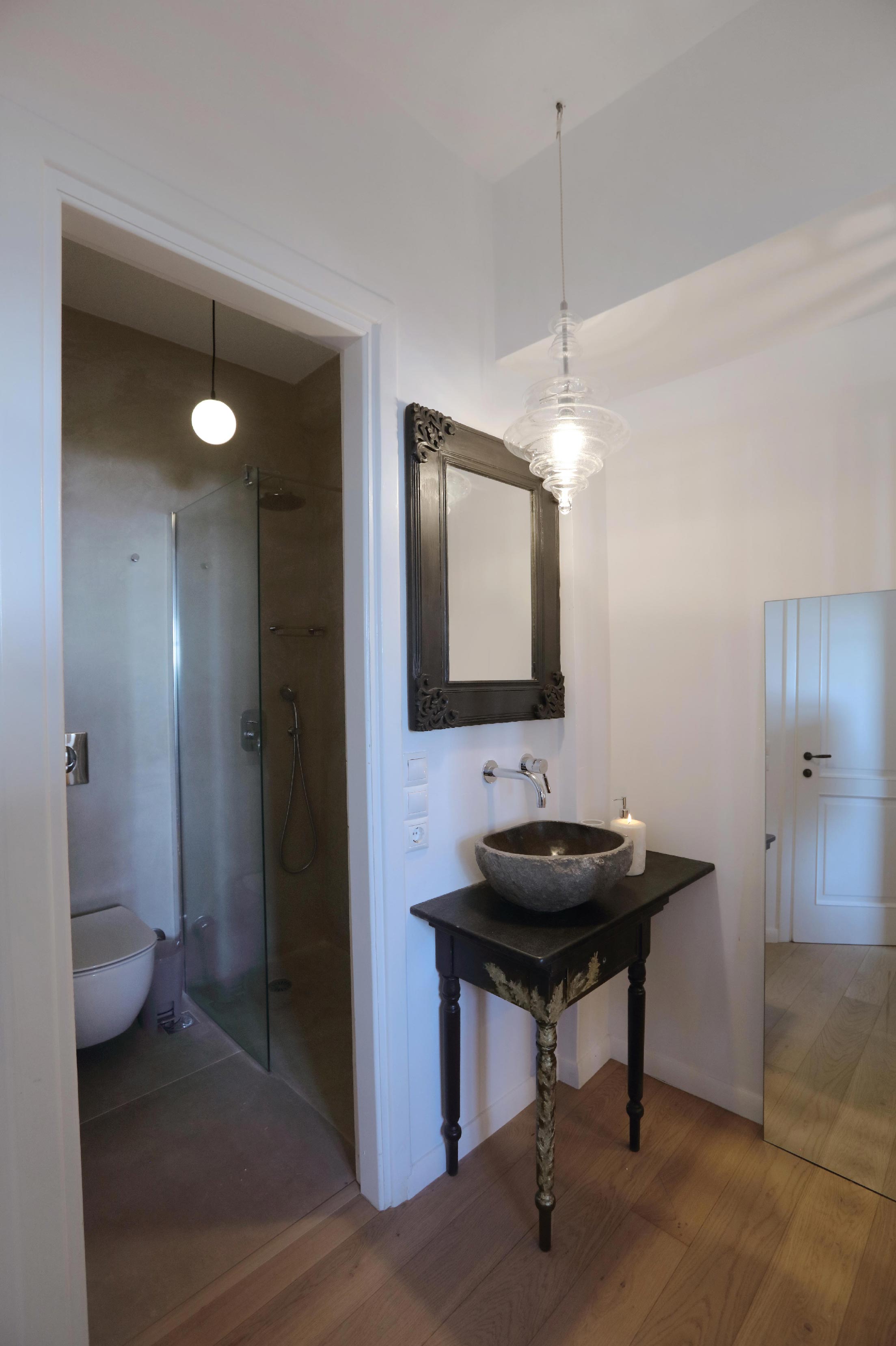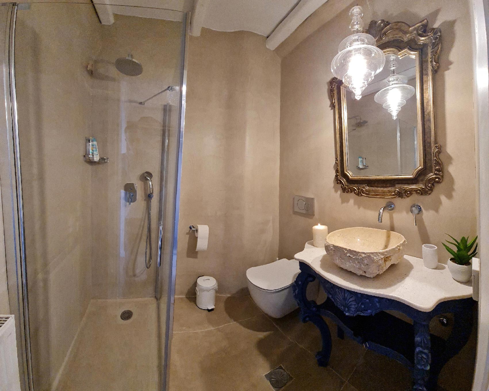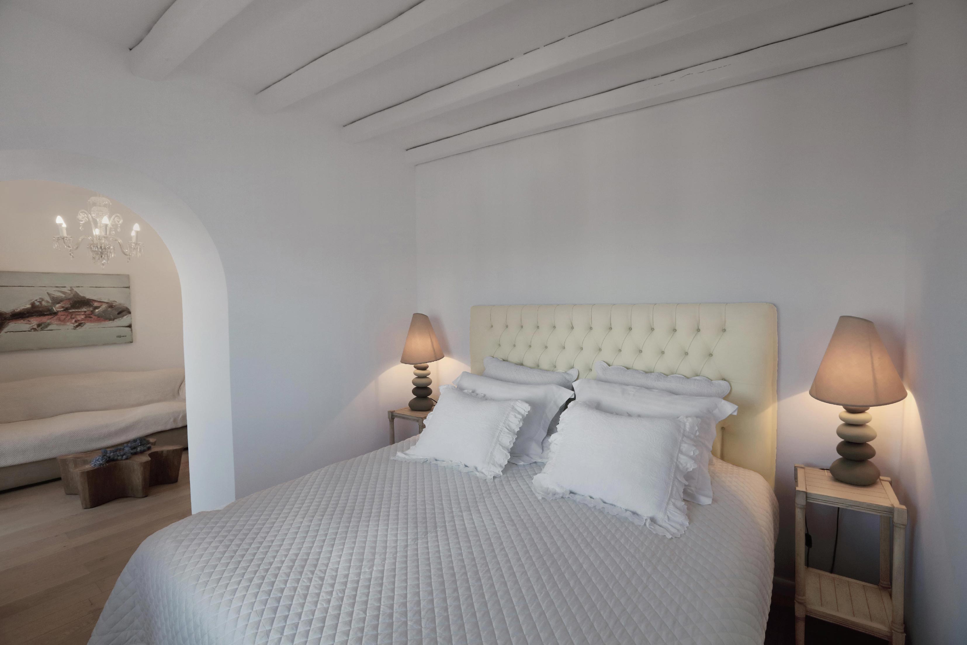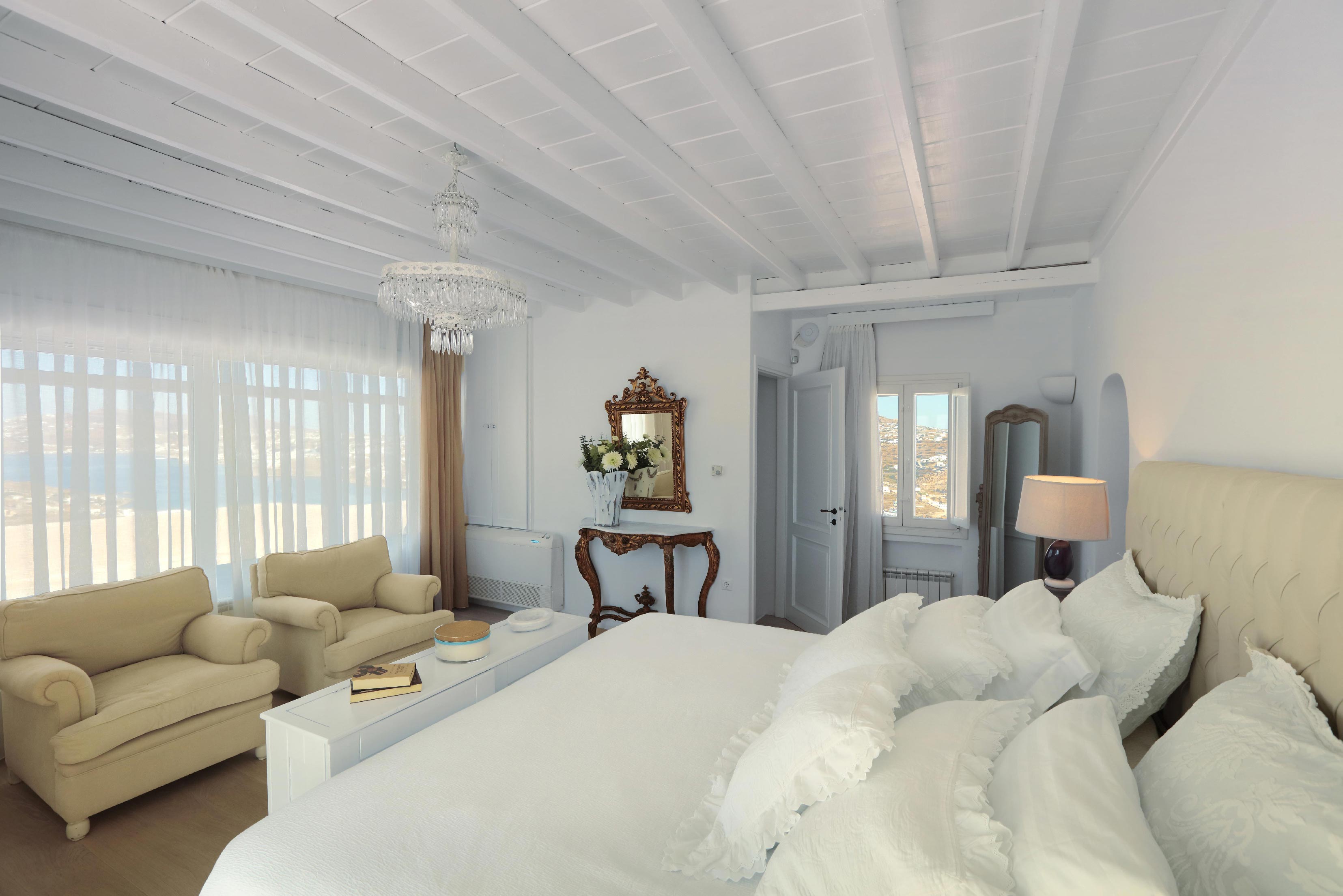 • 1 Master bedroom 35m2 with direct view to Agios Ioannis bay, Delos Island, city and port, 1 king size with aspacious bathroom with tub and a private balcony of 150m2, 360 degrees view, overlooking the surrounding area. The room is equipped with a safe box, hairdryer, TV, air conditioning, toiletries, and towels.