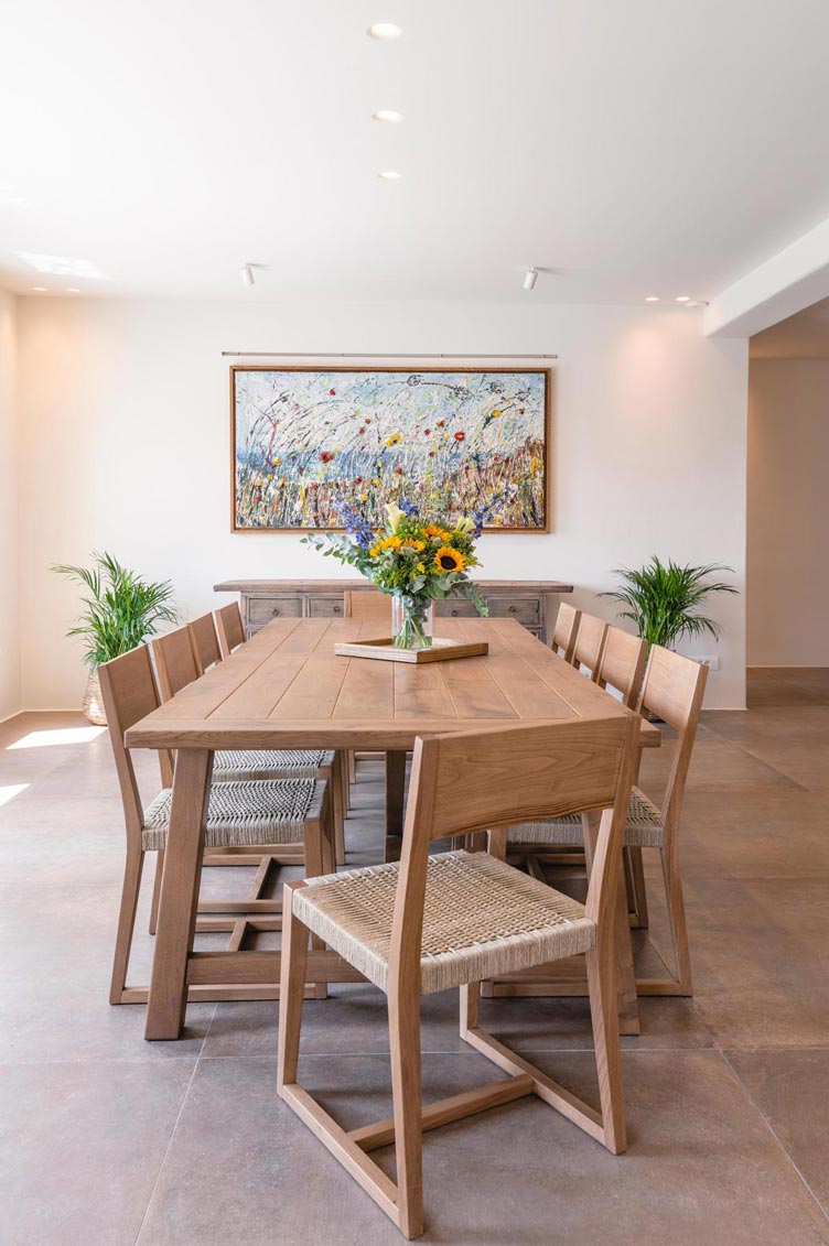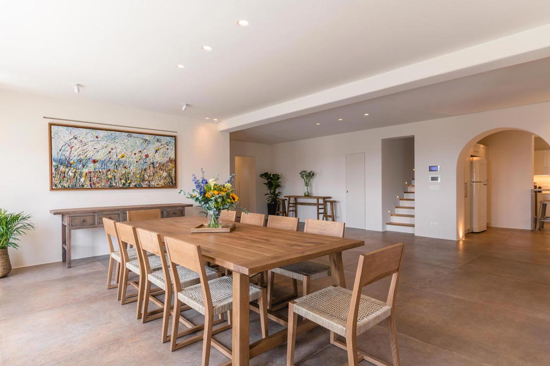 Open plan fully equipped kitchen with Smeg appliances, spacious living room with TV, ceiling fans, and amazing pool and sea view, indoor dining area [8 seats] -direct access to the pool and outdoor dining area, guest bathroom with shower