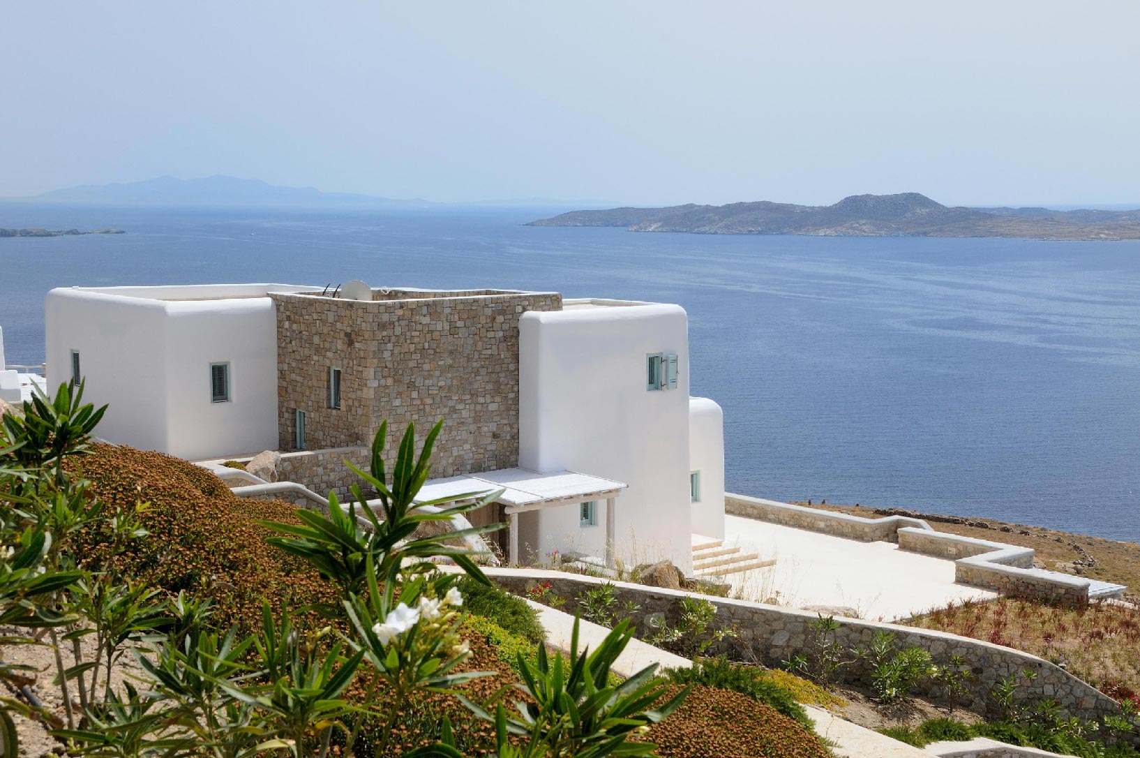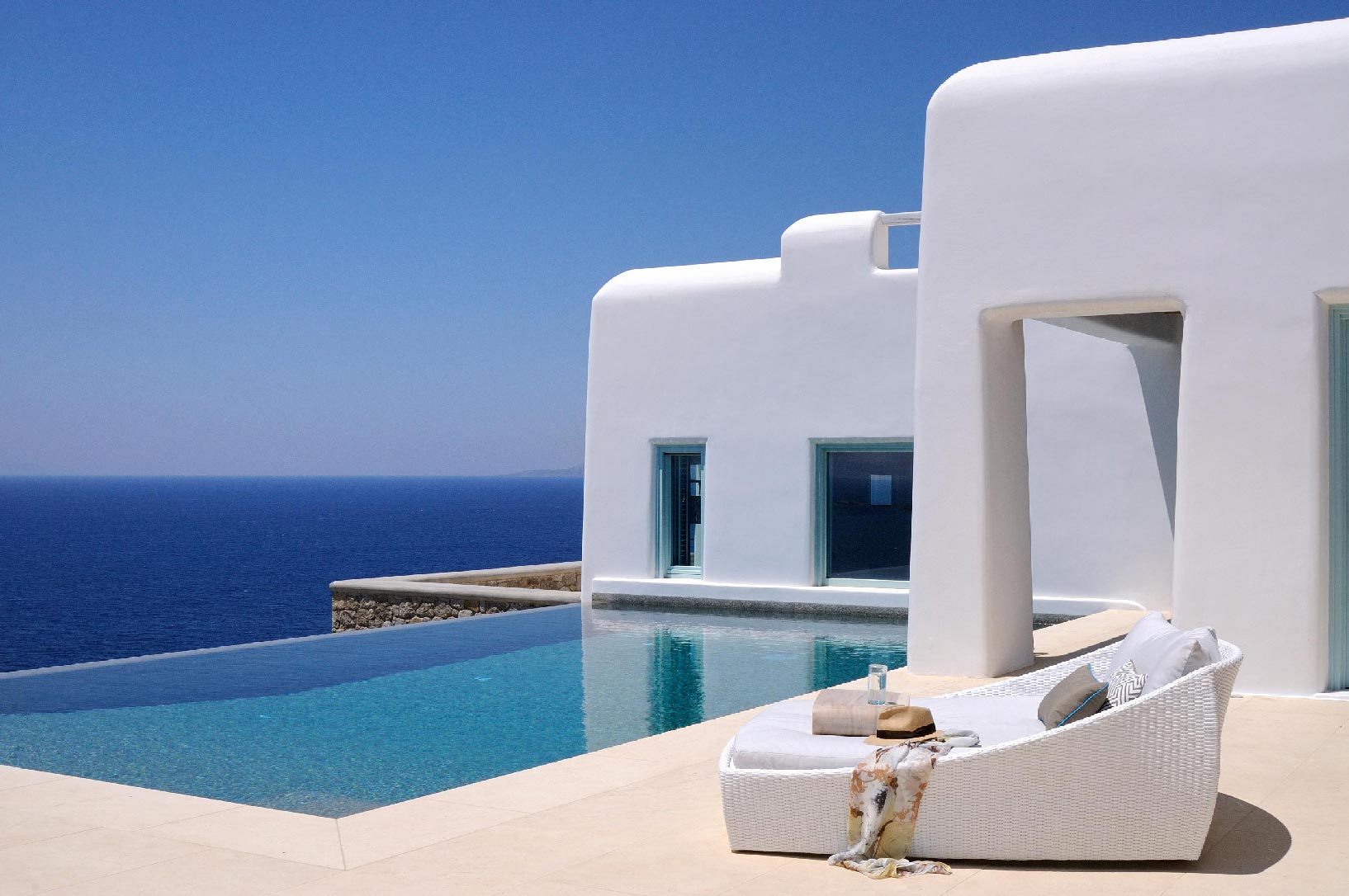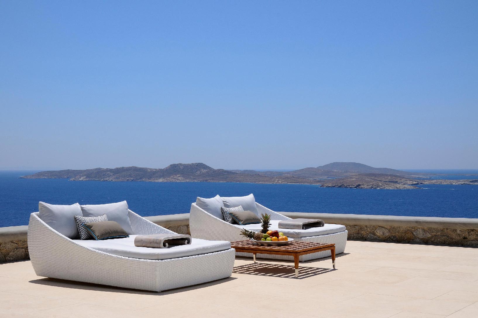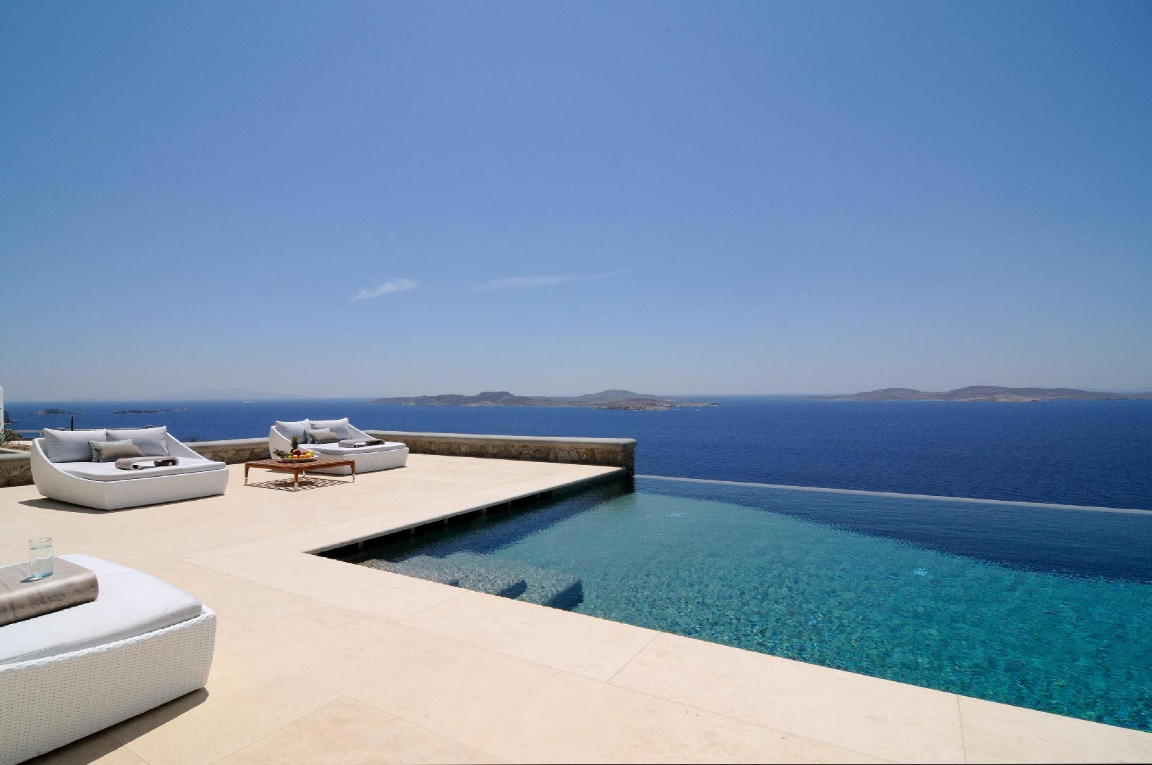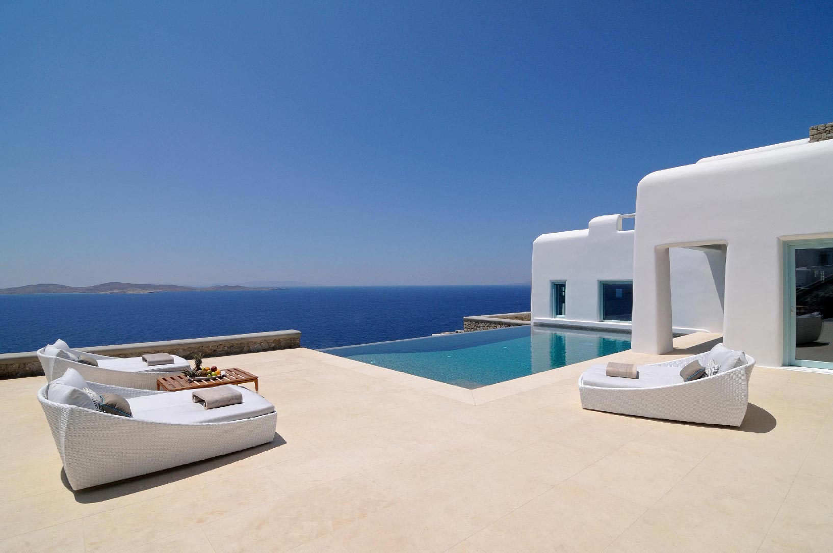 Marvelous views of picturesque Delos and Rhenia islands and enviable island living harmoniously merge into a stunning home that embraces its residents.The stunning views of Delos and Rhenia are perfectly matched by whitewashed architectural elements and natural stone walls. The built-in dining area and lounge offers an inviting respite as the dappled sunlight plays through the bamboo awning, and the infinity pool acts like your private extension of the sea.