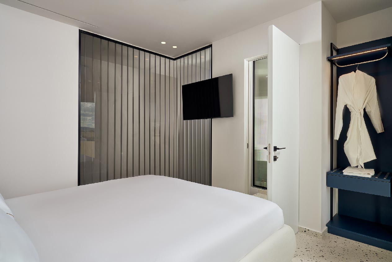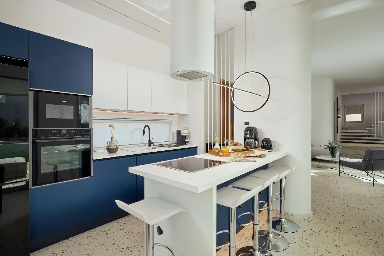 Villa Alva boasts three spacious levels and an impeccable exterior with numerous facilities for endless relaxation. Its interior is characterised by minimalist white and soothing blue tones, adorned with original modern art paintings. The villa fea- tures four double bedrooms with high-comfort amenities and main living spaces perfect for memorable dinner gatherings. The ground floor hosts a fully equipped modern kitchen for culinary delights, while the lower level offers a bedroom with natural light and an en-suite bathroom.
