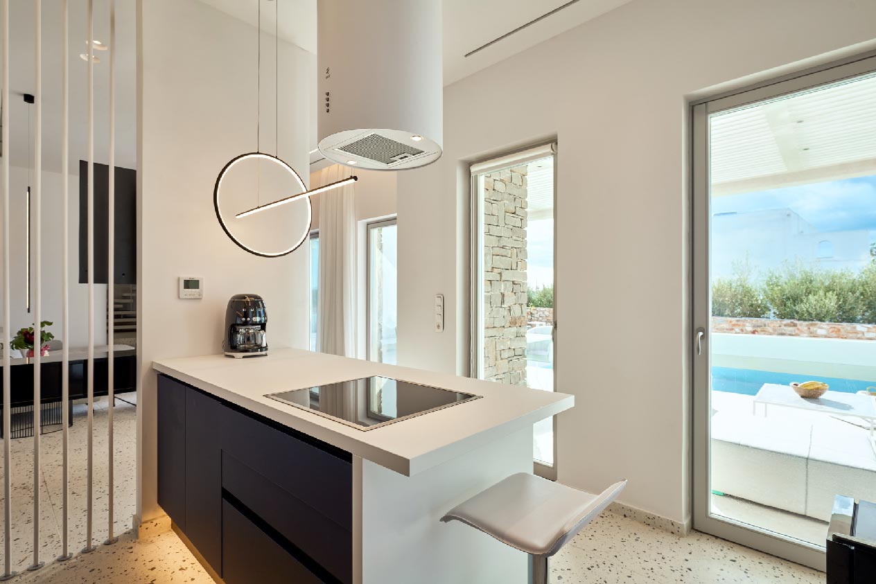 Wellness enthusiasts will appreciate the fitness room and sauna for relaxation. Outside, two lavish swimming pools await – one on the ground floor with sunbeds, and a heated pool on the first floor for unwinding with a drink. The outdoor space includes a majestic sun lounge for enjoying the Greek sun, complemented by stunning indoor and outdoor seating areas.