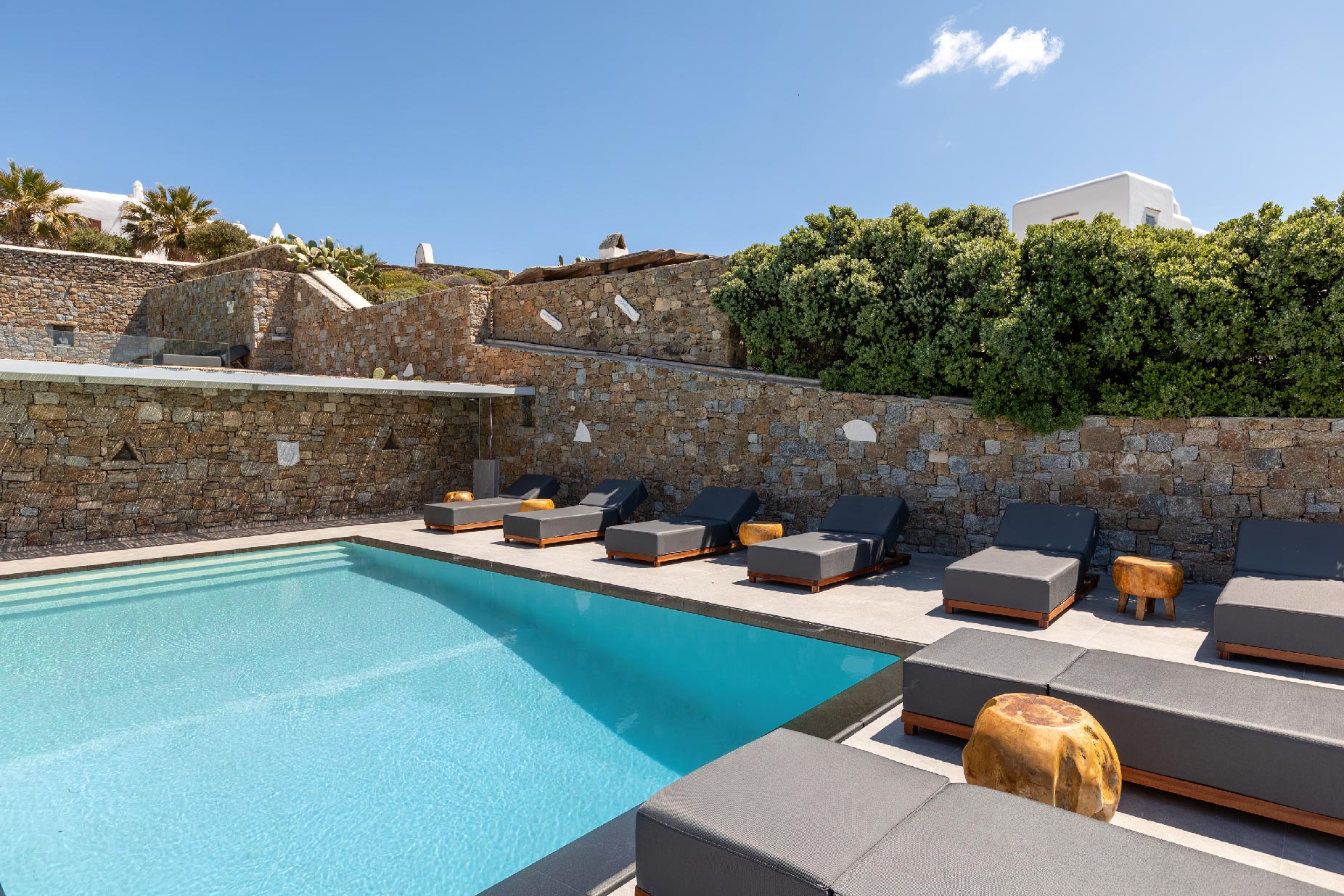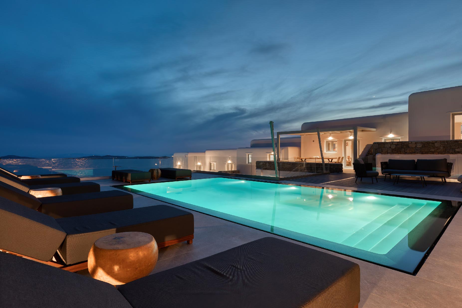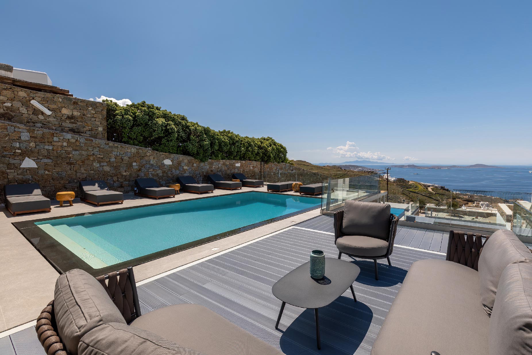 Clear blue sky and a view as far as the eye can travel, elegant and spacious lounging areas will surround you along with the villa’s Cycladic architecture. The outdoor area simply fulfills every individual need in an oasis-like environment from every aspect. The deck is almost floating above the sea and equipped with sun loungers, is perfect for leisure days soaking up the sun. Your only task is to relax by the amazing pool and allow your senses to free themselves away from indiscreet eyes.