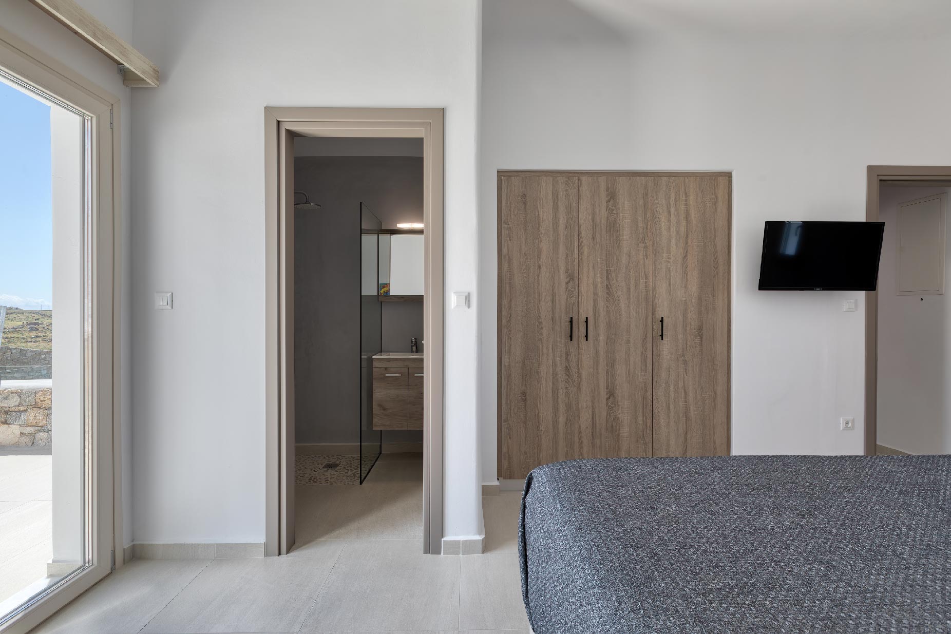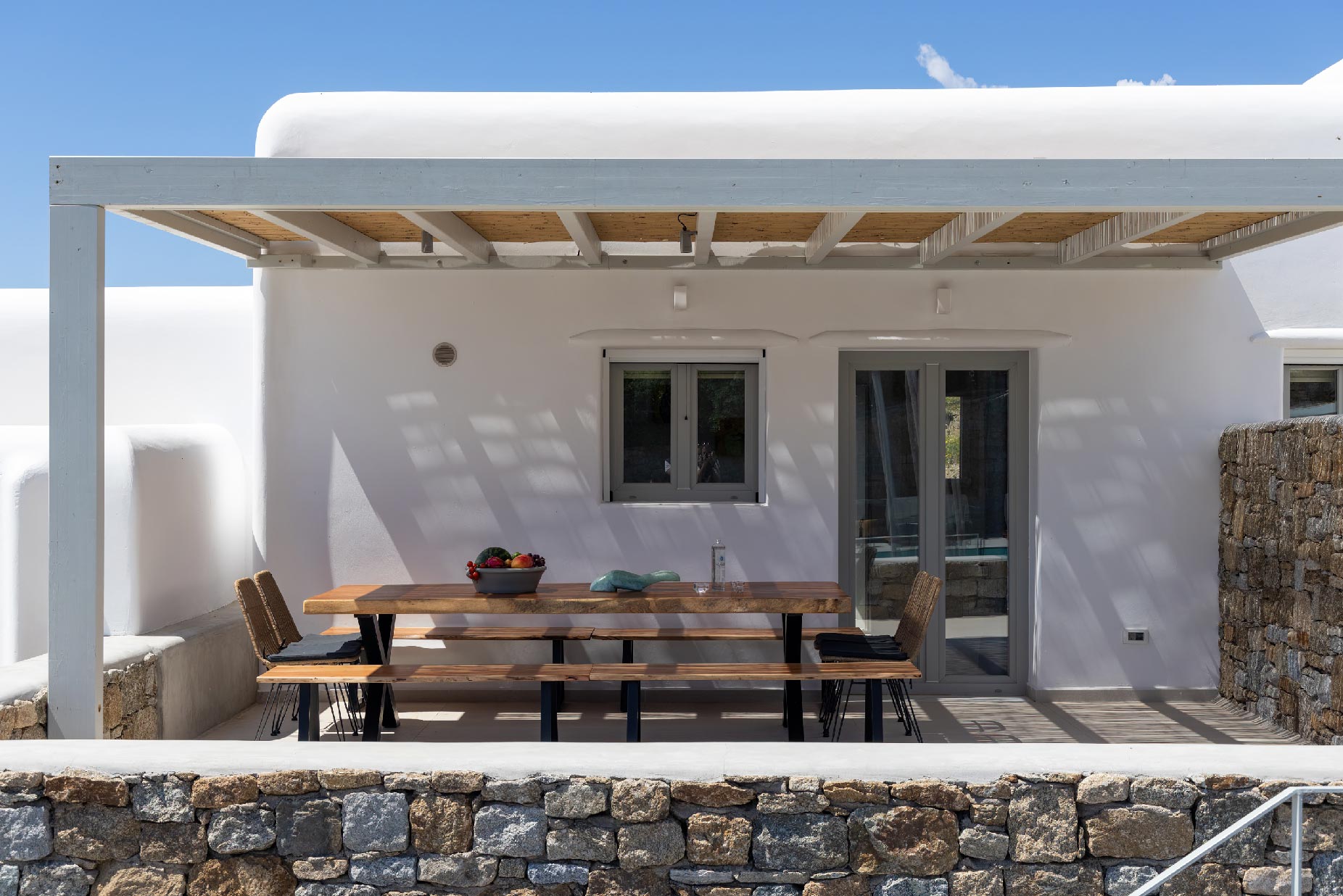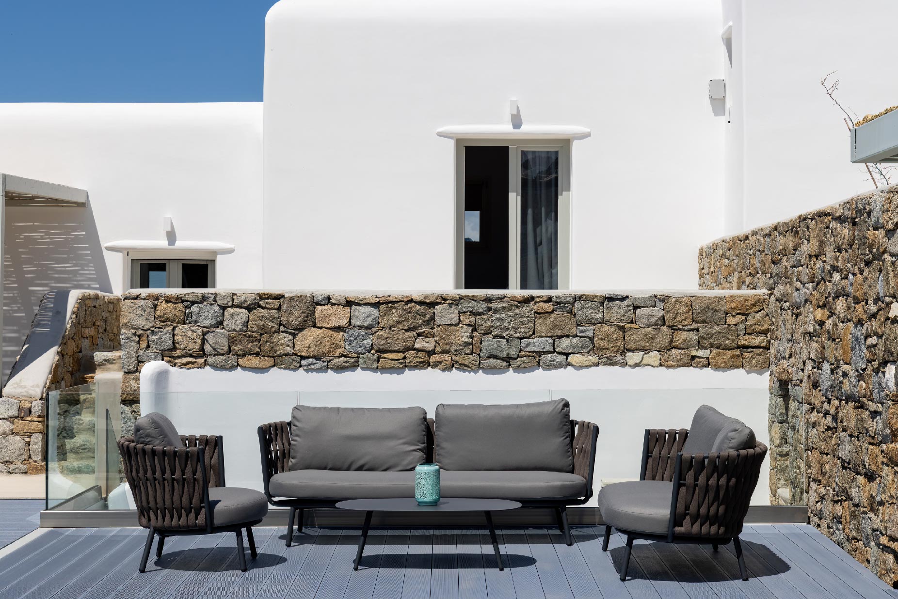 Clear blue sky and a view as far as the eye can travel, elegant and spacious lounging areas will surround you along with the villa’s Cycladic architecture. The outdoor area simply fulfills every individual need in an oasis-like environment from every aspect. The deck is almost floating above the sea and equipped with sun loungers, is perfect for leisure days soaking up the sun. Your only task is to relax by the amazing pool and allow your senses to free themselves away from indiscreet eyes.