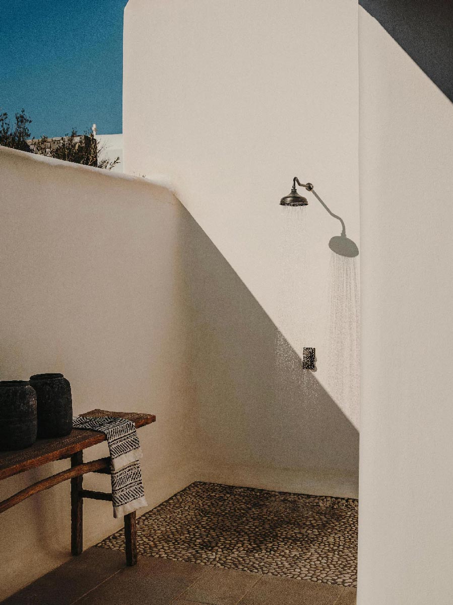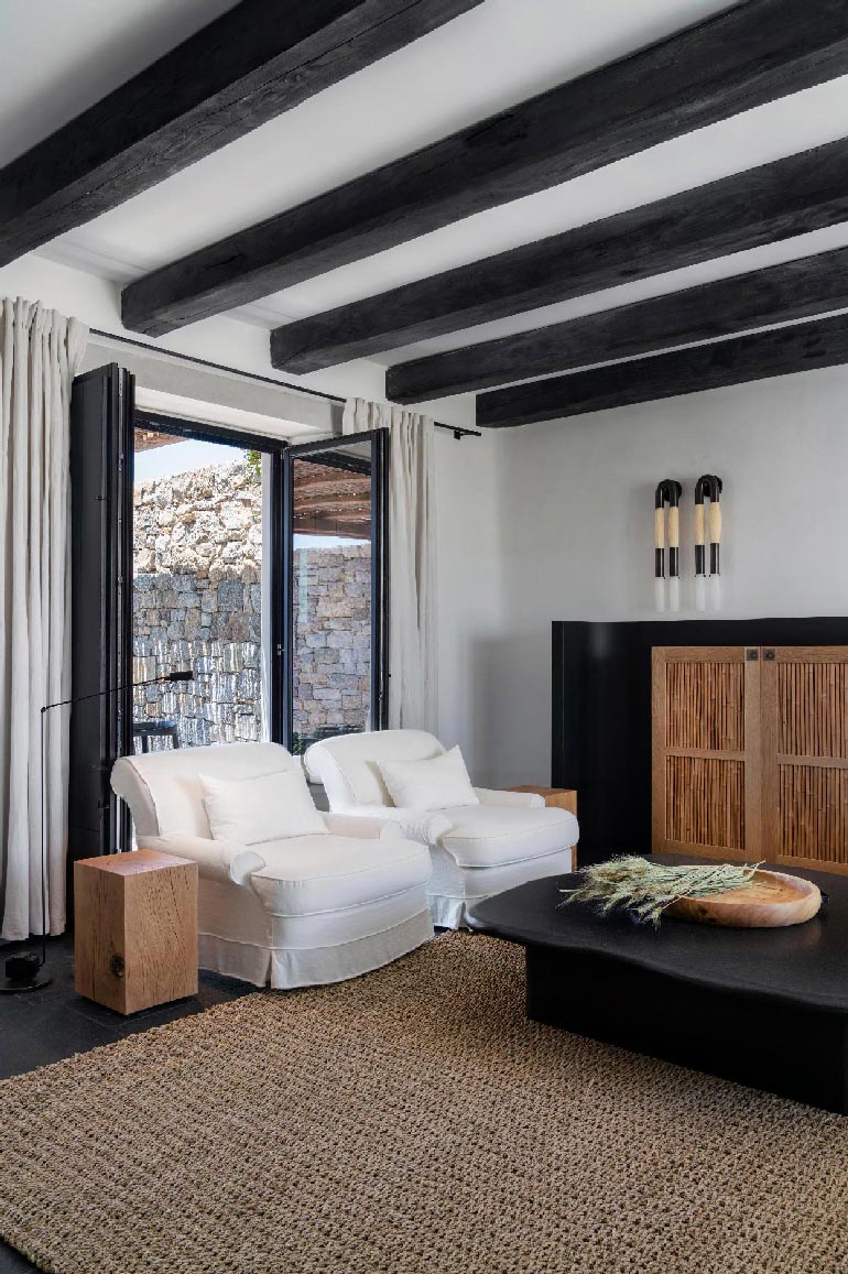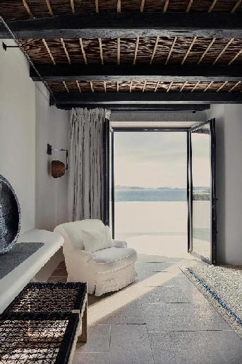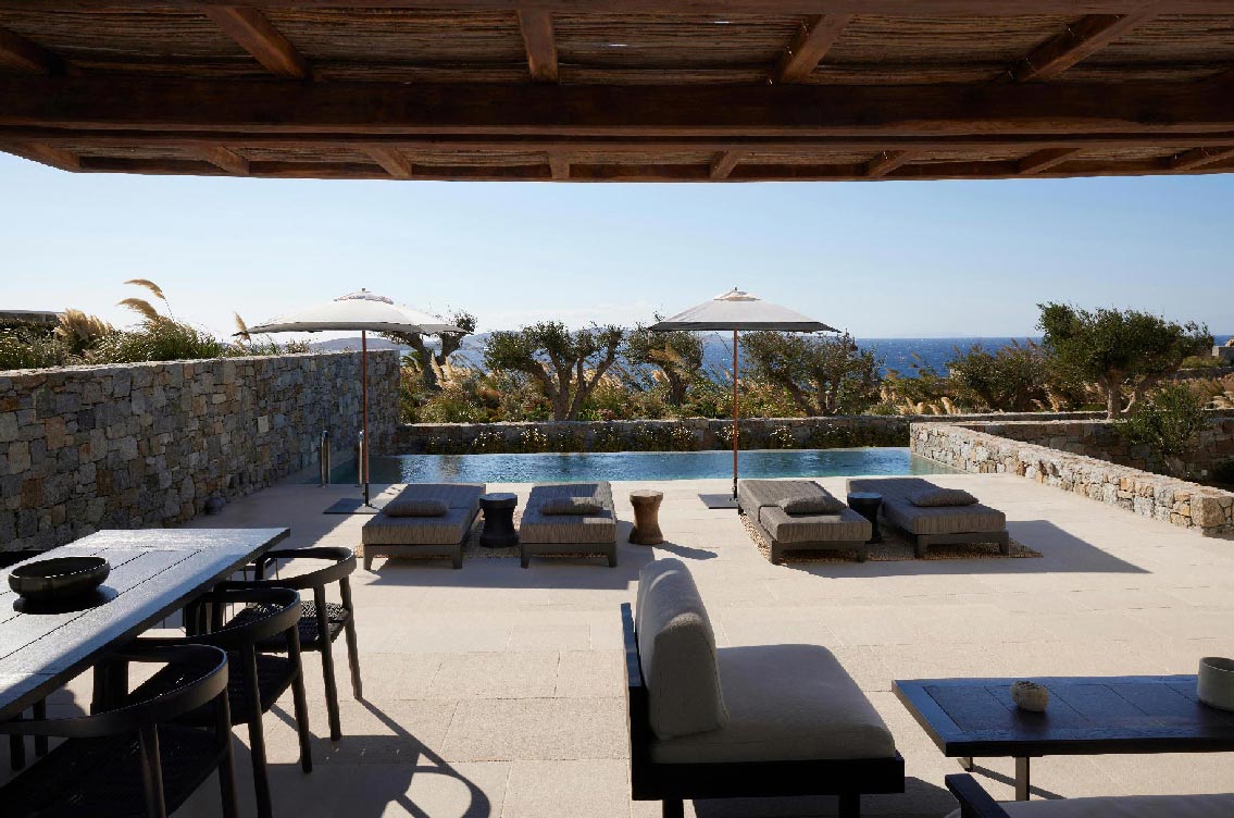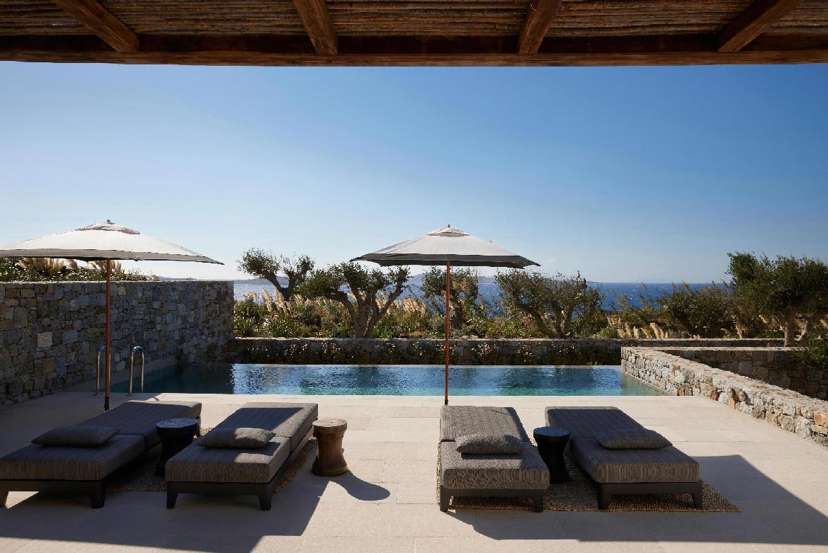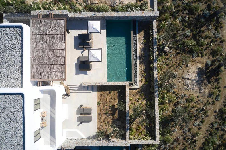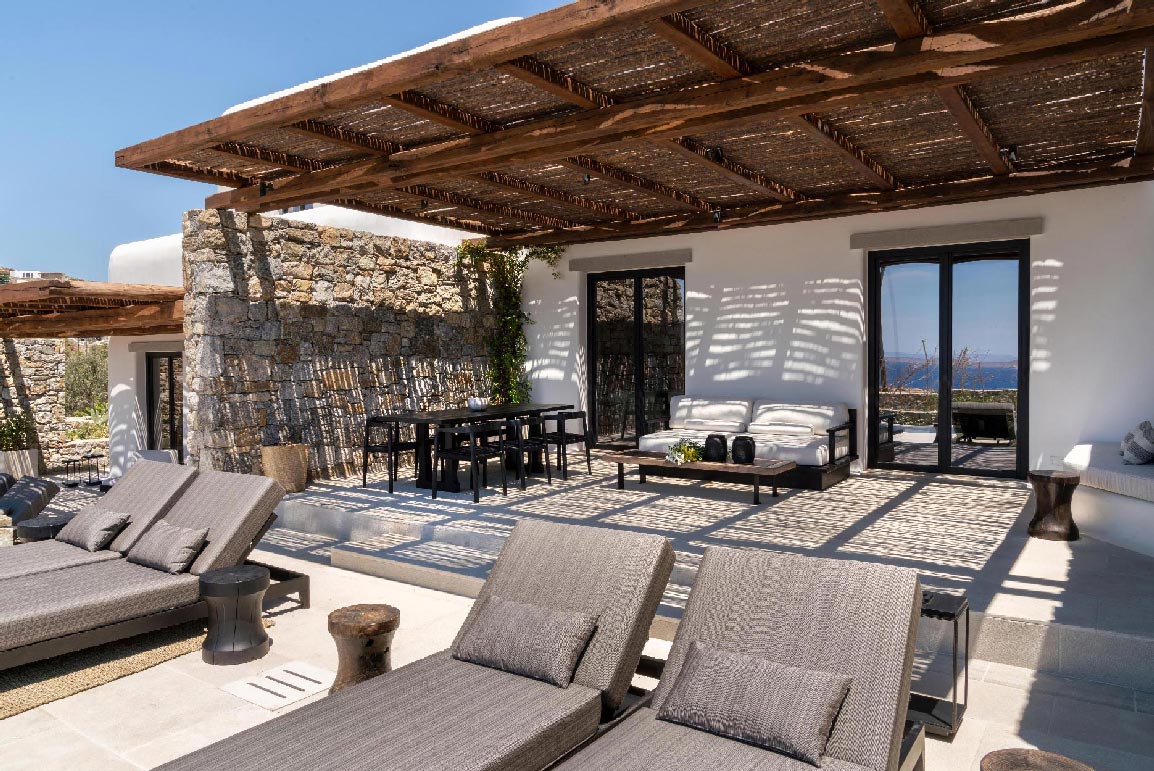 The Villa offers glorious views of sunset over the island of Delos. Each of the two master bedrooms features a king-size bed (2mX2m / 6.5ftX6.5ft mattress) and en-suite bathroom. The open-plan living room is furnished with elegant sofas and a private dining area with an open kitchen. Guests can gather in the spacious living room or enjoy the views from the outdoor lounge and the heated swimming pool (up to 23 °C / 73 °F)
