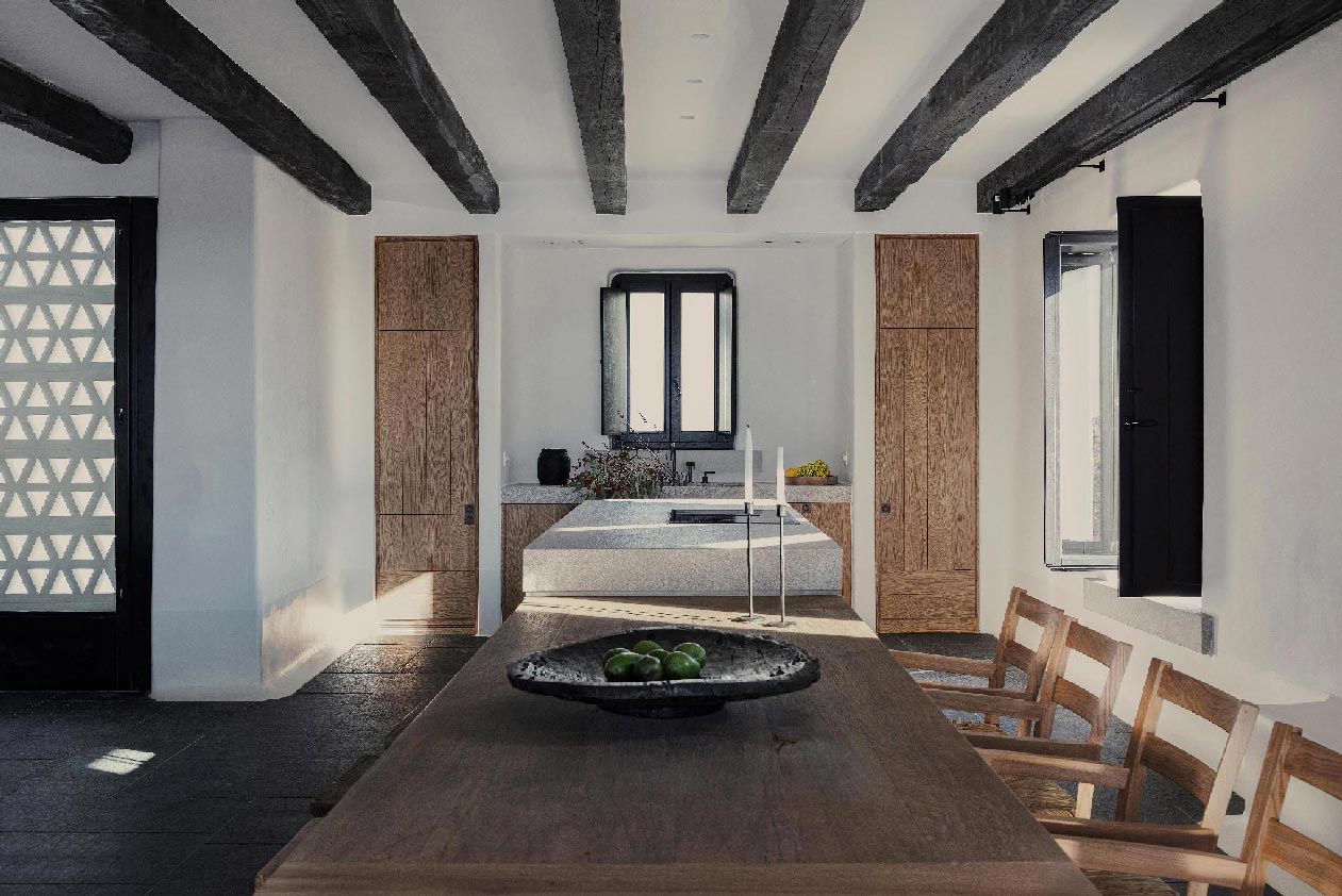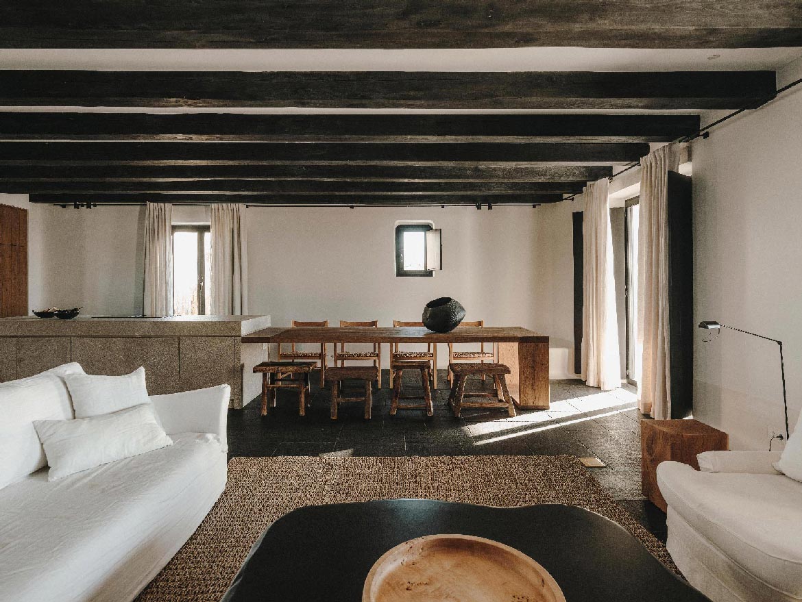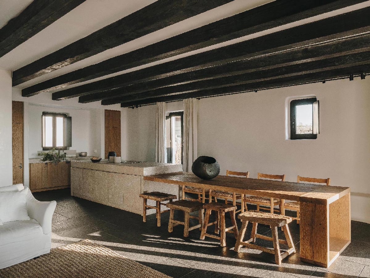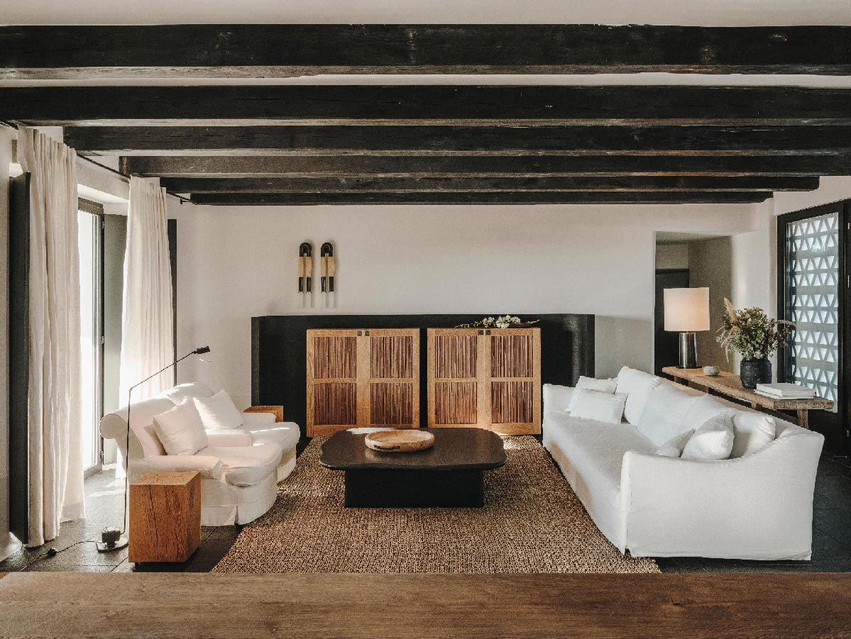 The Villa offers glorious views of sunset over the island of Delos. Each of the two master bedrooms features a king-size bed (2mX2m / 6.5ftX6.5ft mattress) and en-suite bathroom. The open-plan living room is furnished with elegant sofas and a private dining area with an open kitchen. Guests can gather in the spacious living room or enjoy the views from the outdoor lounge and the heated swimming pool (up to 23 °C / 73 °F)