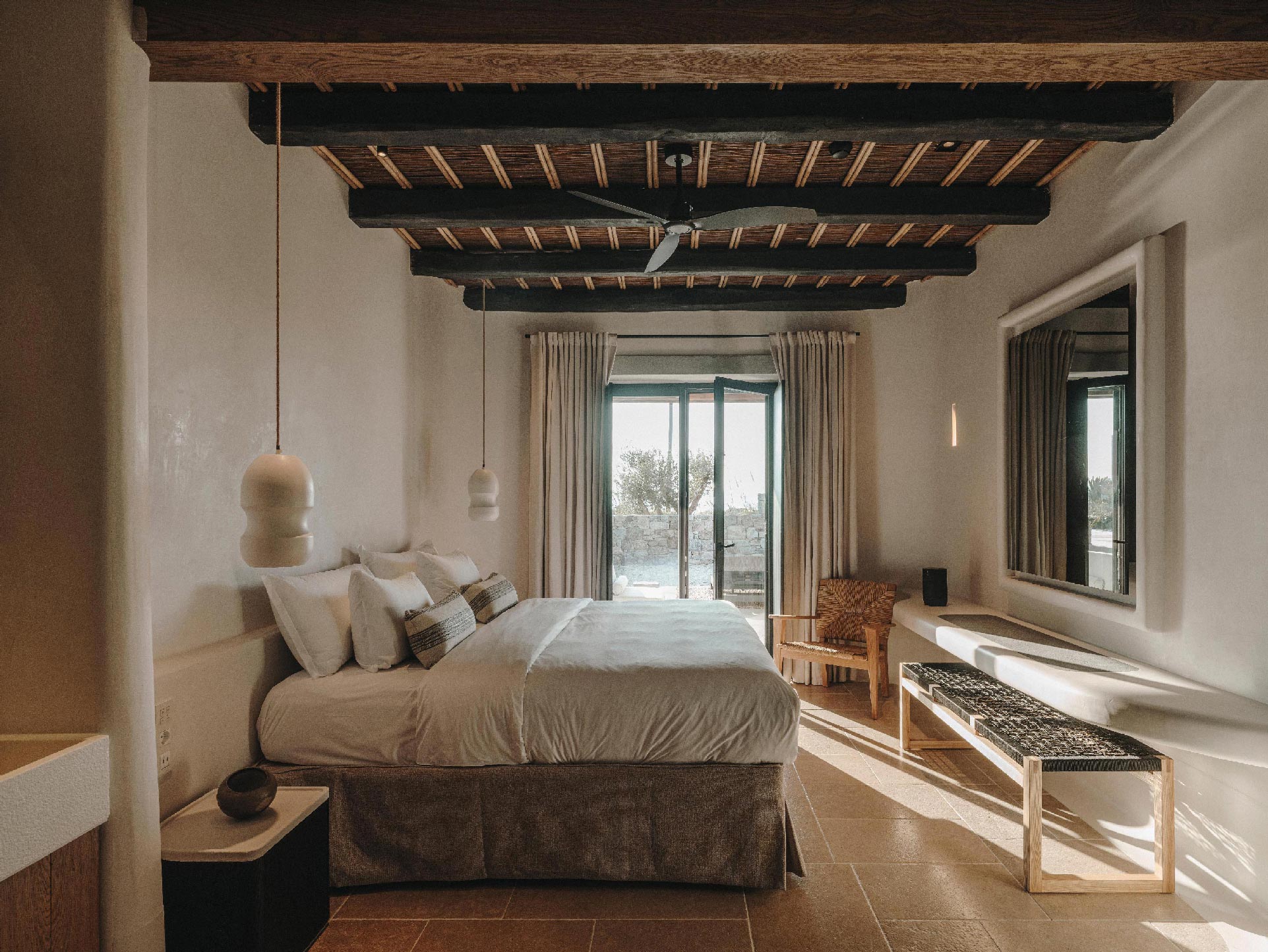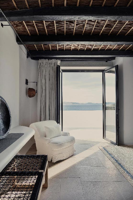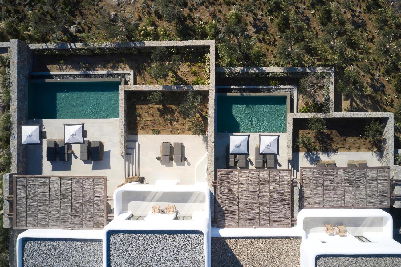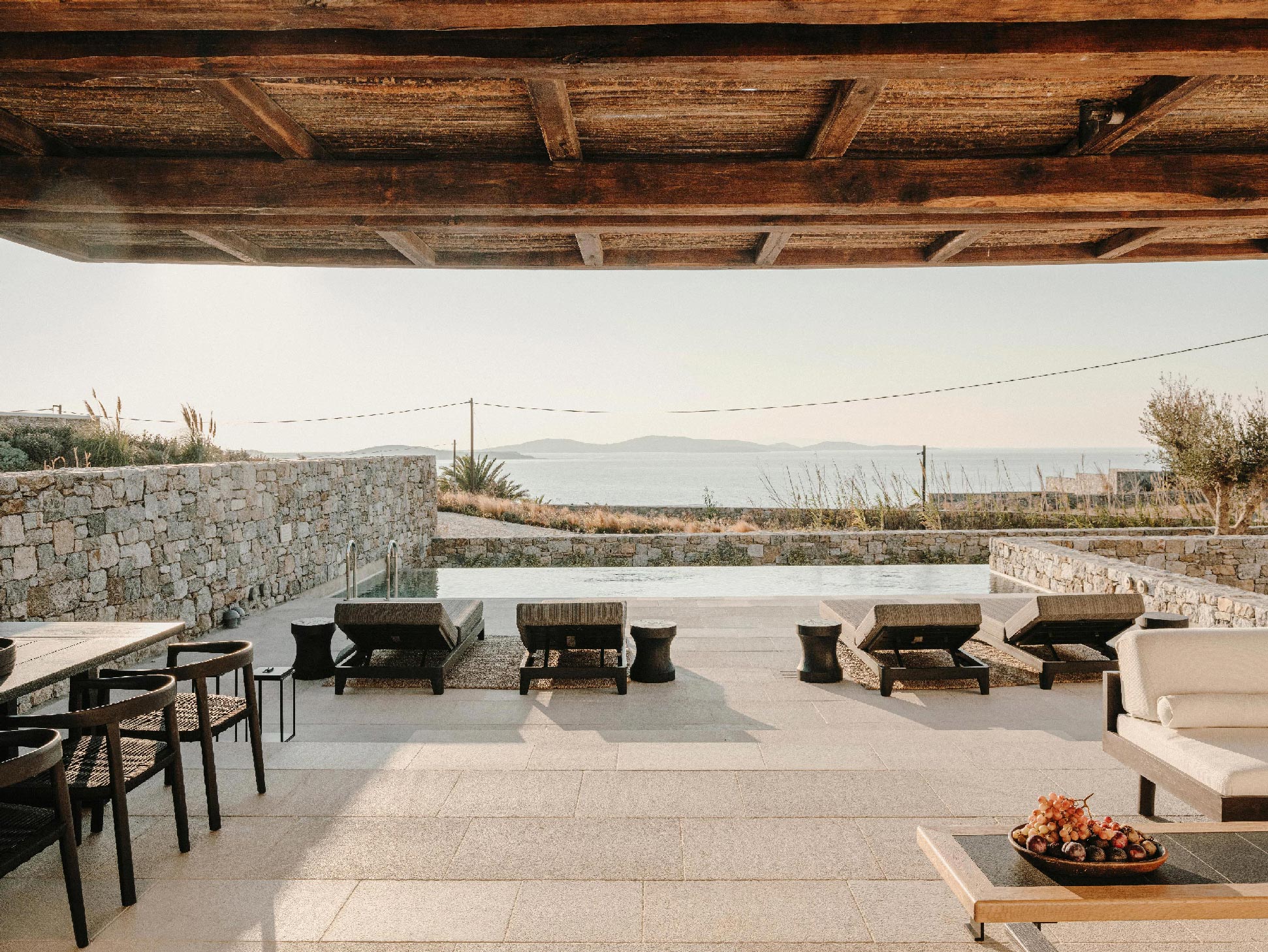 The Villa offers glorious views of sunset over the island of Delos. The master bedroom and two bedrooms feature a king-size bed (2mX2m/6.5ftX6.5ft mattress) and en-suite bathroom. The open-plan living room is furnished with elegant sofas and a private dining area with an open kitchen. Guests can gather in the spacious living room or enjoy the views from the outdoor lounge and the heated swimming pool (up to 23 °C / 73 °F).