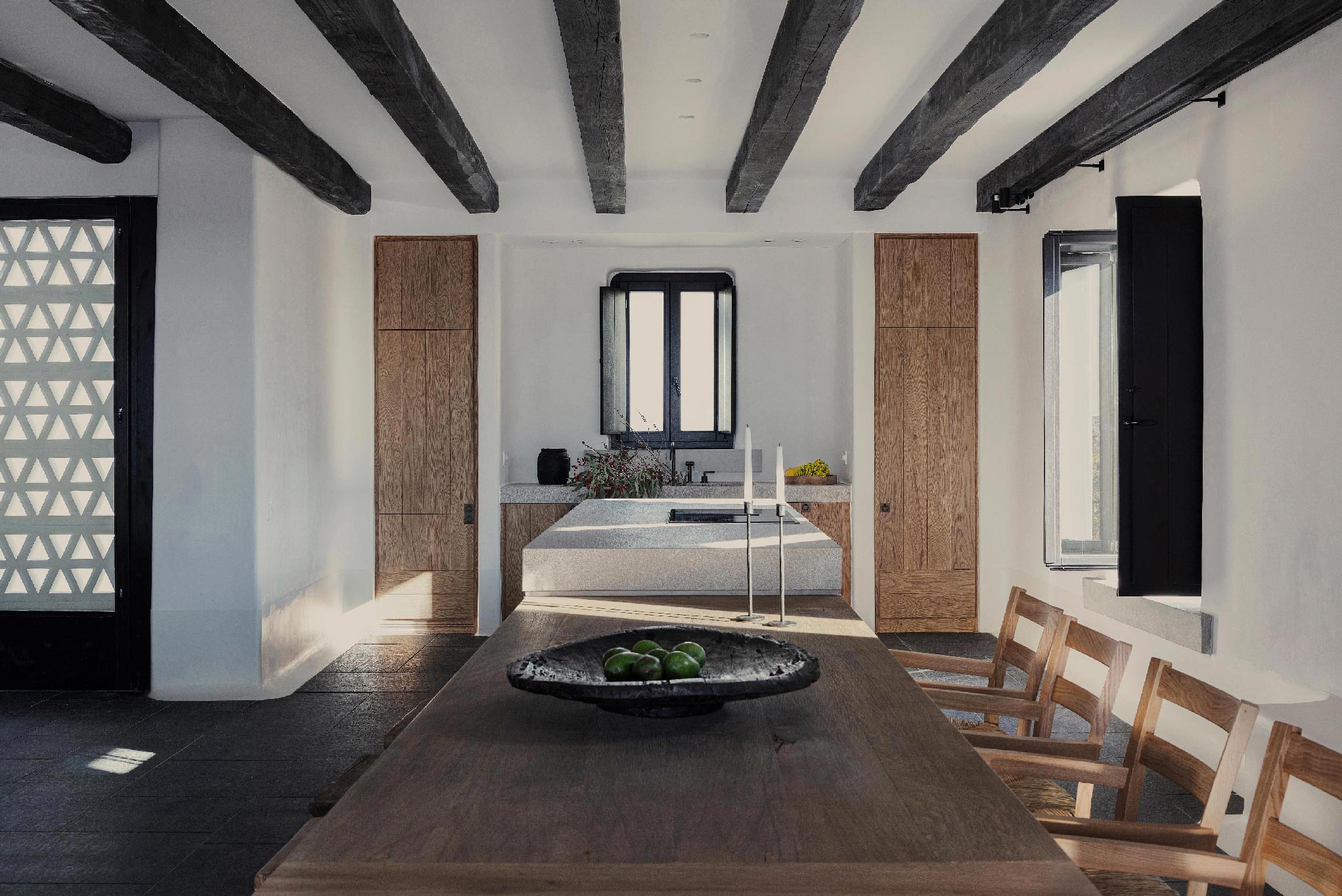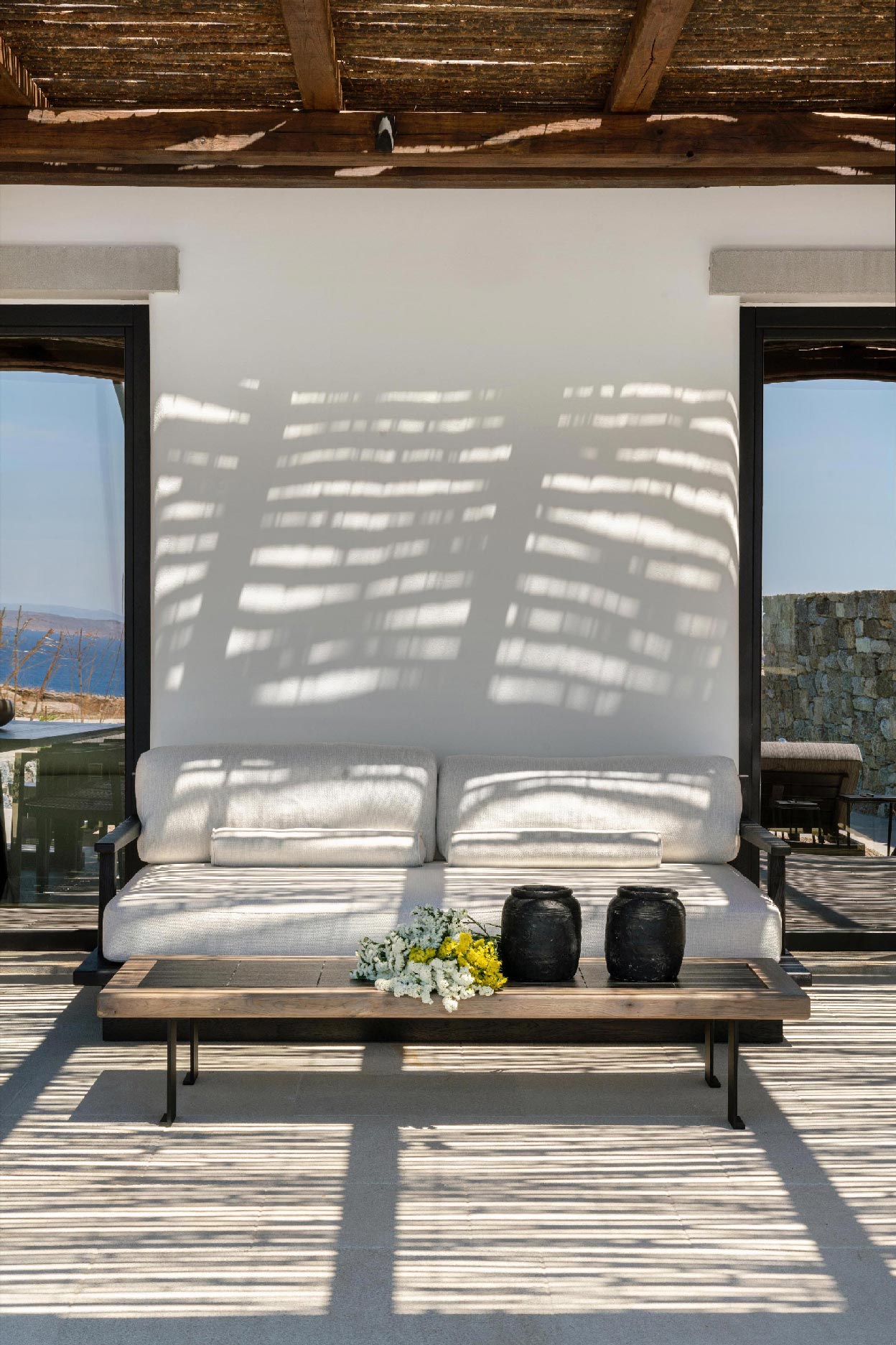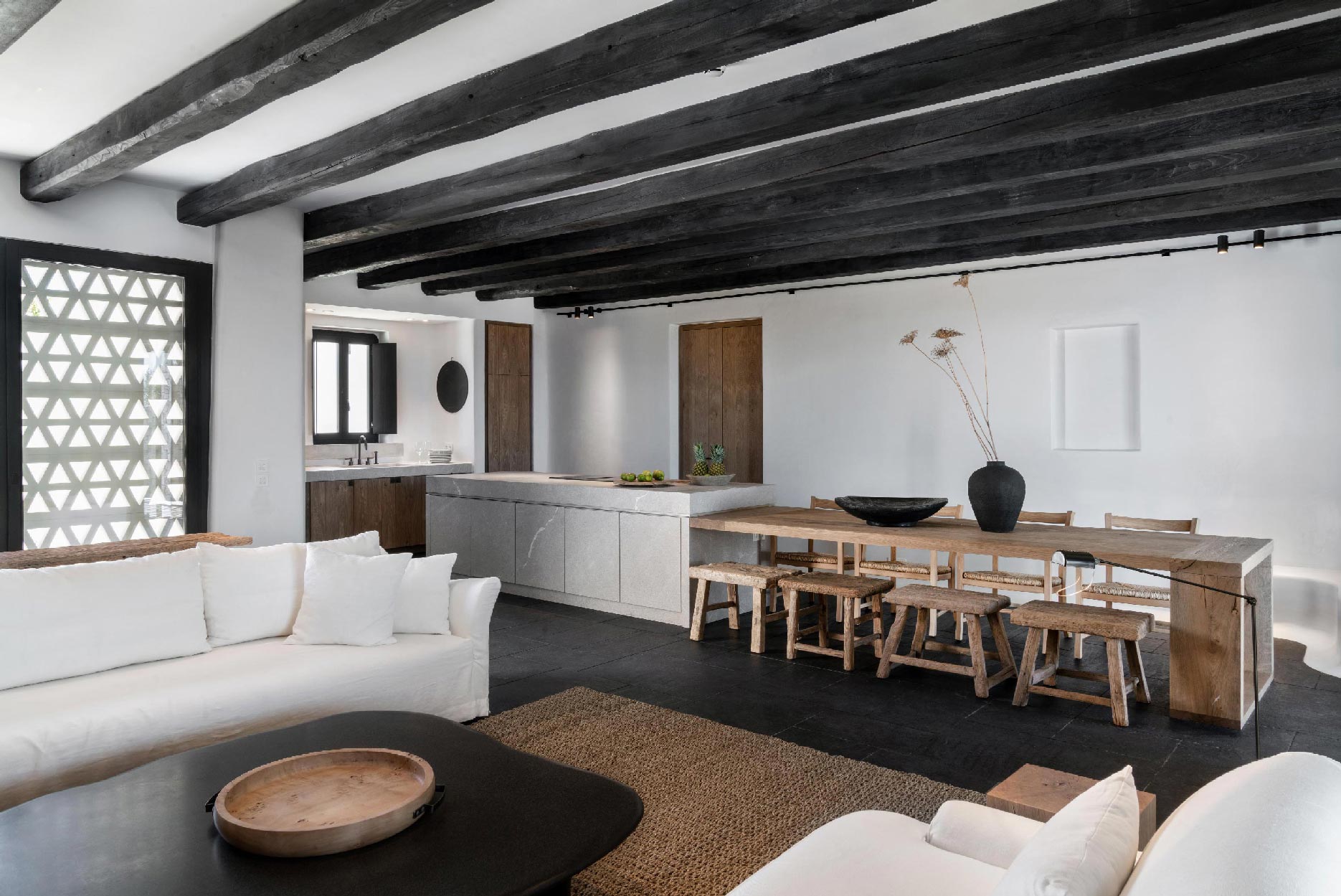 The Villa offers glorious views of sunset over the island of Delos. The master bedroom and two bedrooms feature a king-size bed (2mX2m/6.5ftX6.5ft mattress) and en-suite bathroom. The open-plan living room is furnished with elegant sofas and a private dining area with an open kitchen. Guests can gather in the spacious living room or enjoy the views from the outdoor lounge and the heated swimming pool (up to 23 °C / 73 °F).