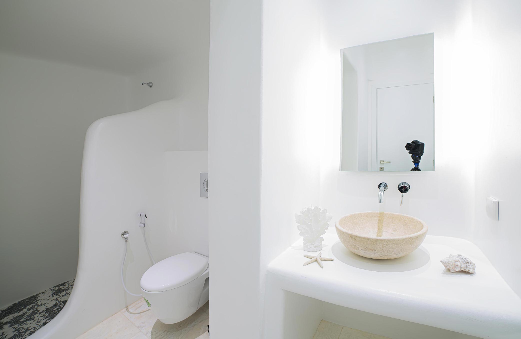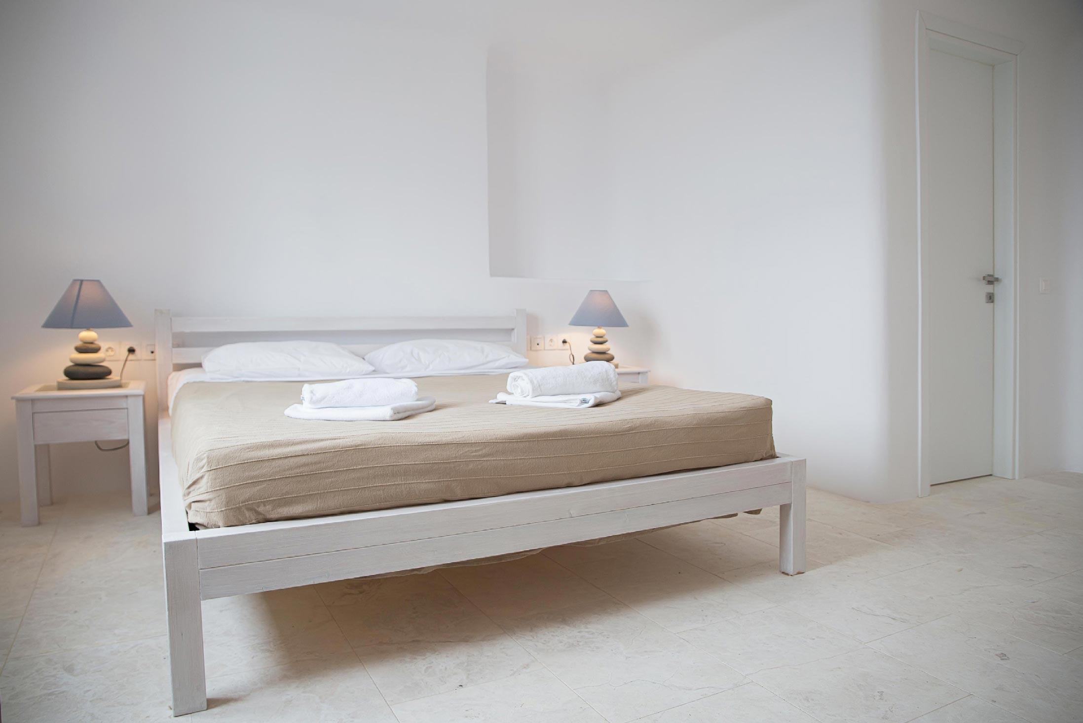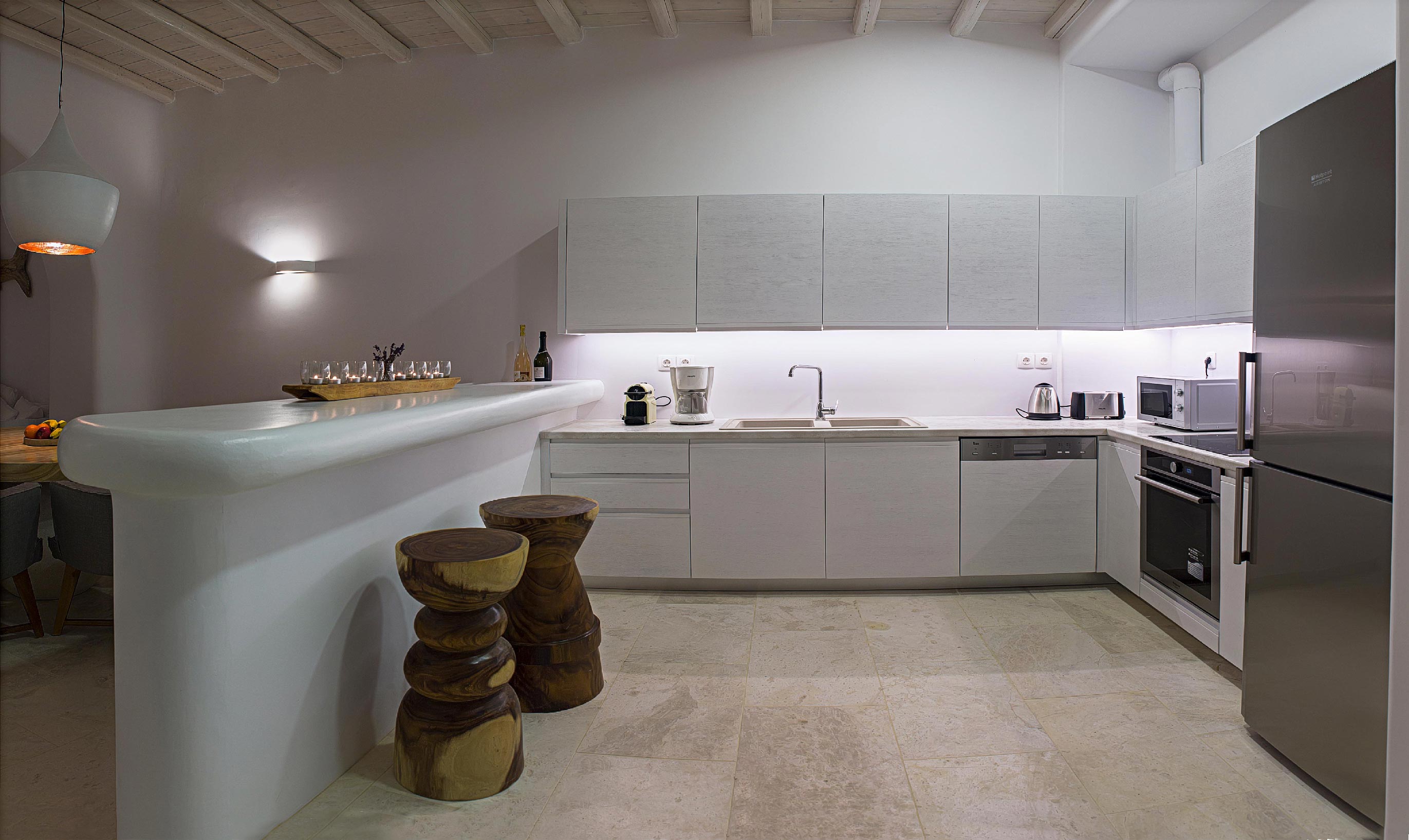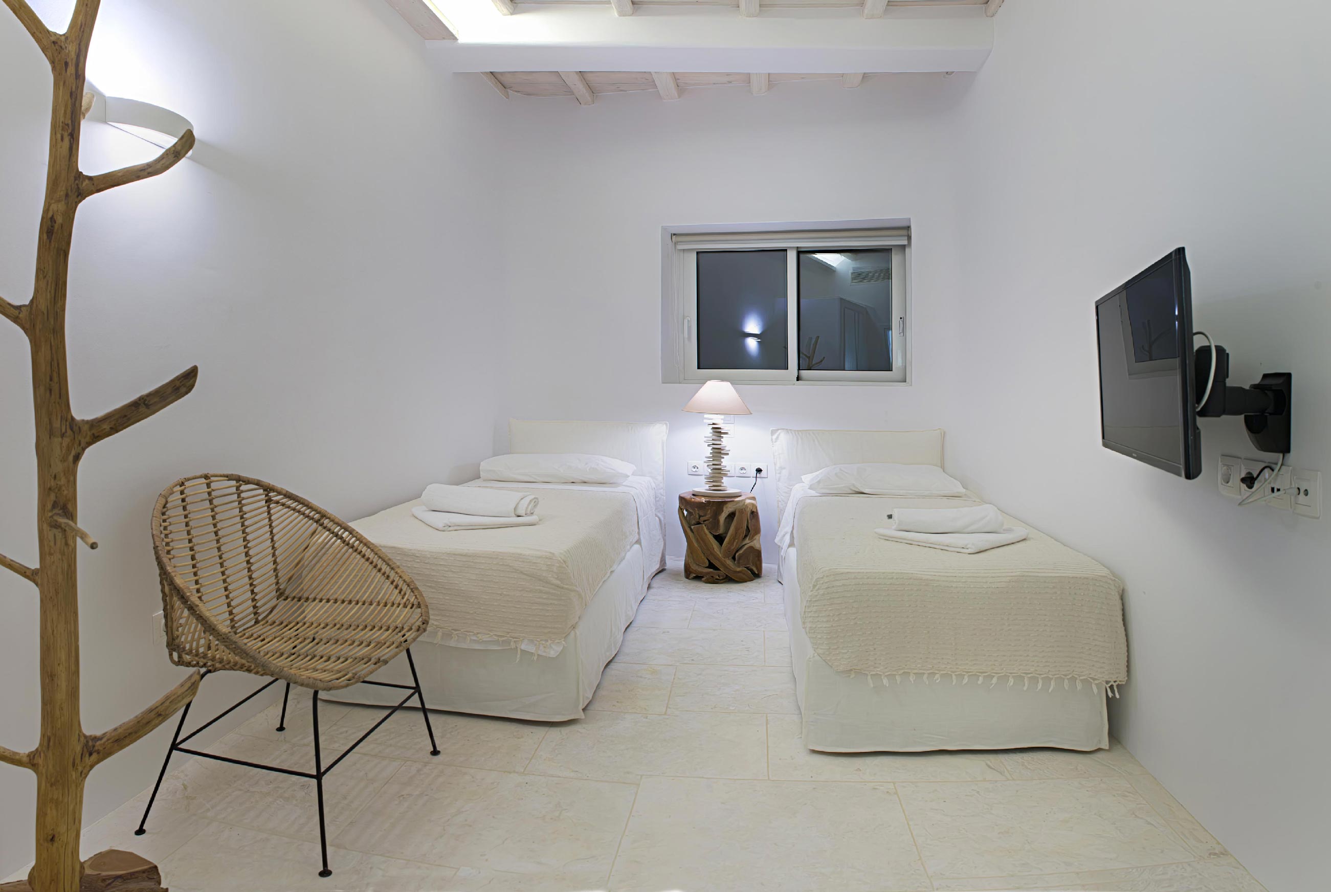 Inside you will find a spacious lounge with a large dining area and a fully equipped kitchen. 3 master bedrooms with double beds (160cm*200cm) and one master bedroom with two single beds (100cm*200cm). An independent guest house with one double bed (180cm*200cm), located at the lower level of the complex which is connected with the outdoor area of the Villa through a traditional stone stair case.
