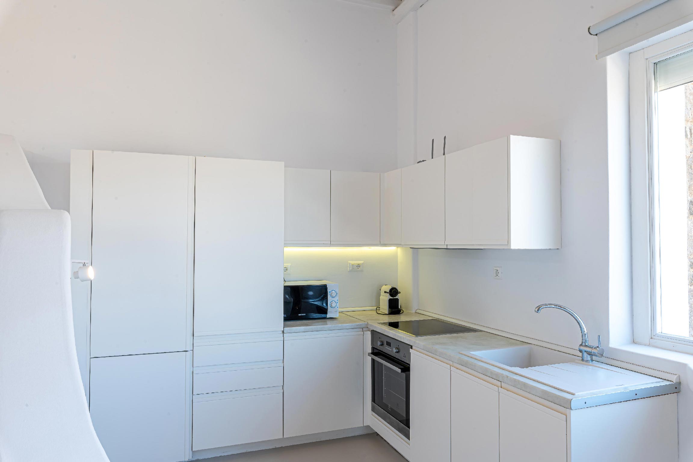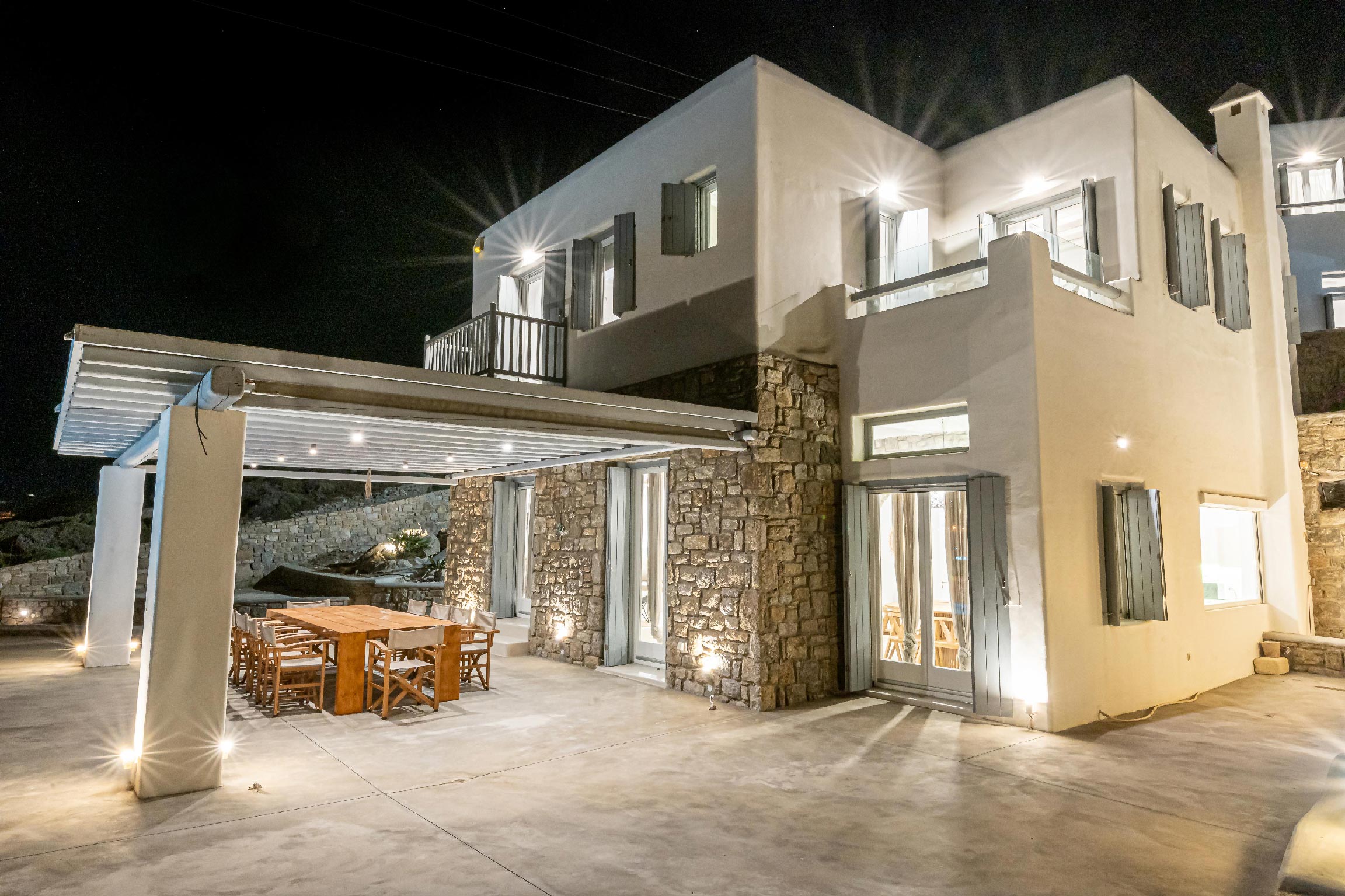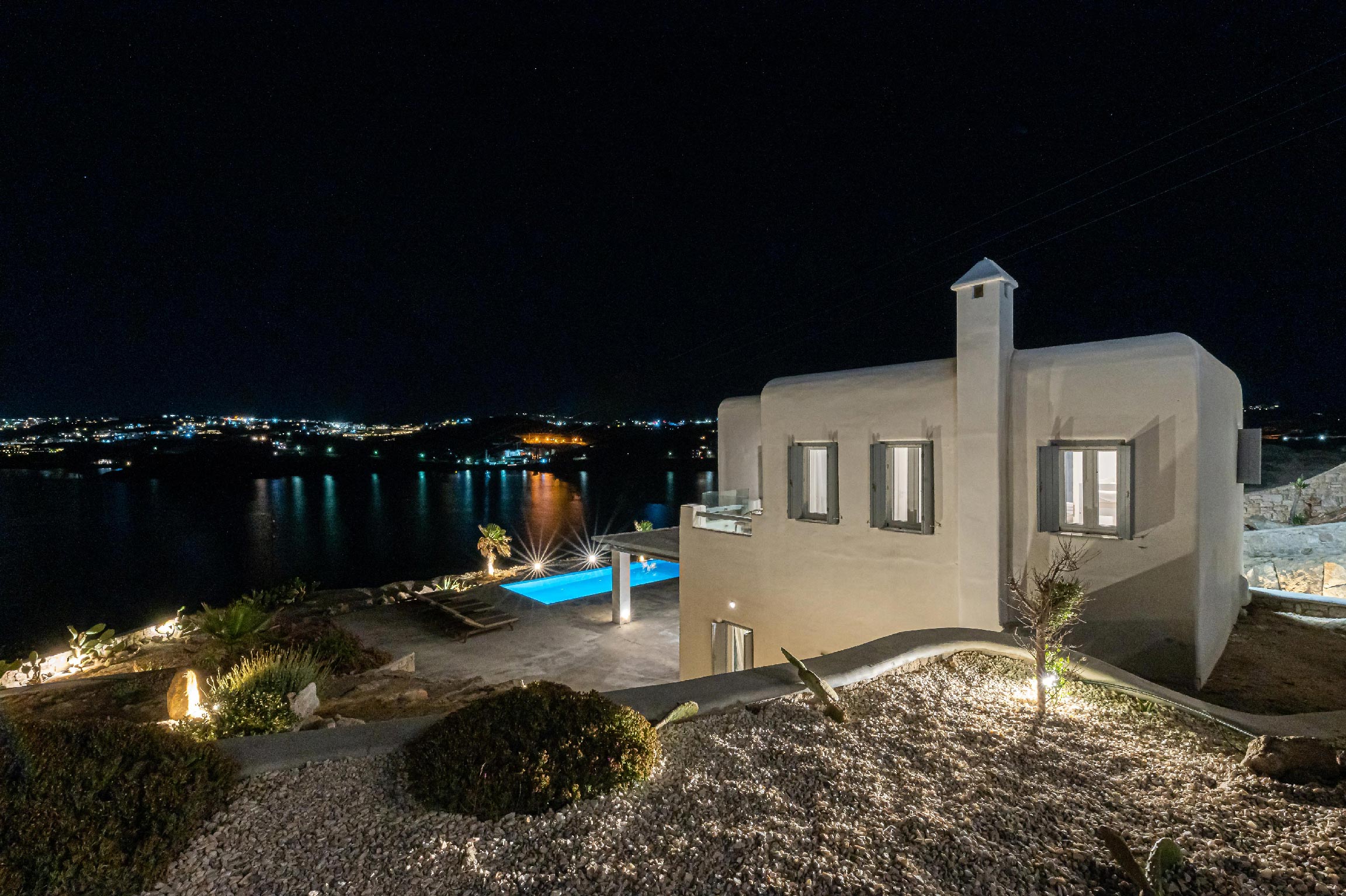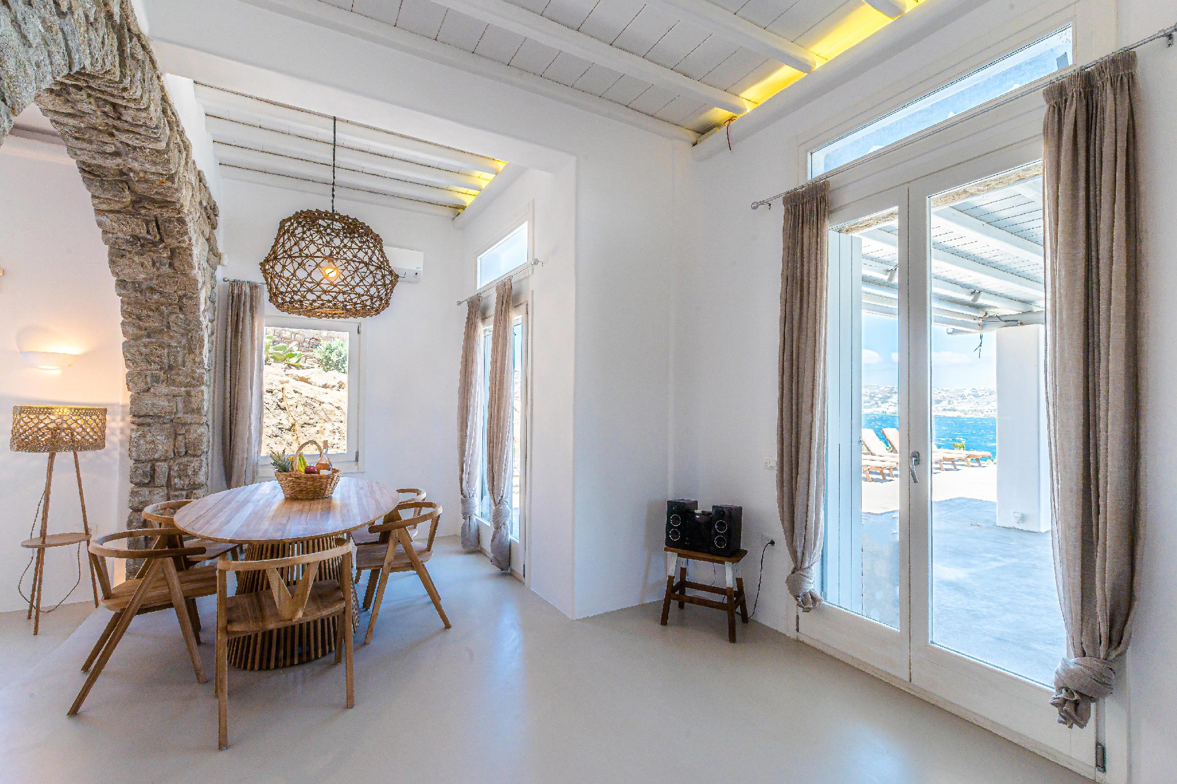 A 160 square meters, two-level property, all in white, perched on a hillside with breath-taking, panoramic views over the Aegean Sea boasting a large open plan living area indoors and outdoors and offering privacy and seclusion in a very idyllic spot. The ground level consists of a bright elegant living room and a charmy spacious dining room, both having direct access to the heated infinity pool area, a fully equipped kitchen, a spacious king size room with a fully equipped bathroom and large veranda on the heated infinity pool area that offers gorgeous view to the sea and the town. The top level consists of a king size master bedroom with en suite fully equipped bathroom, two queen size bedrooms and another fully equipped bathroom, all of them having magnificent sea and town views.