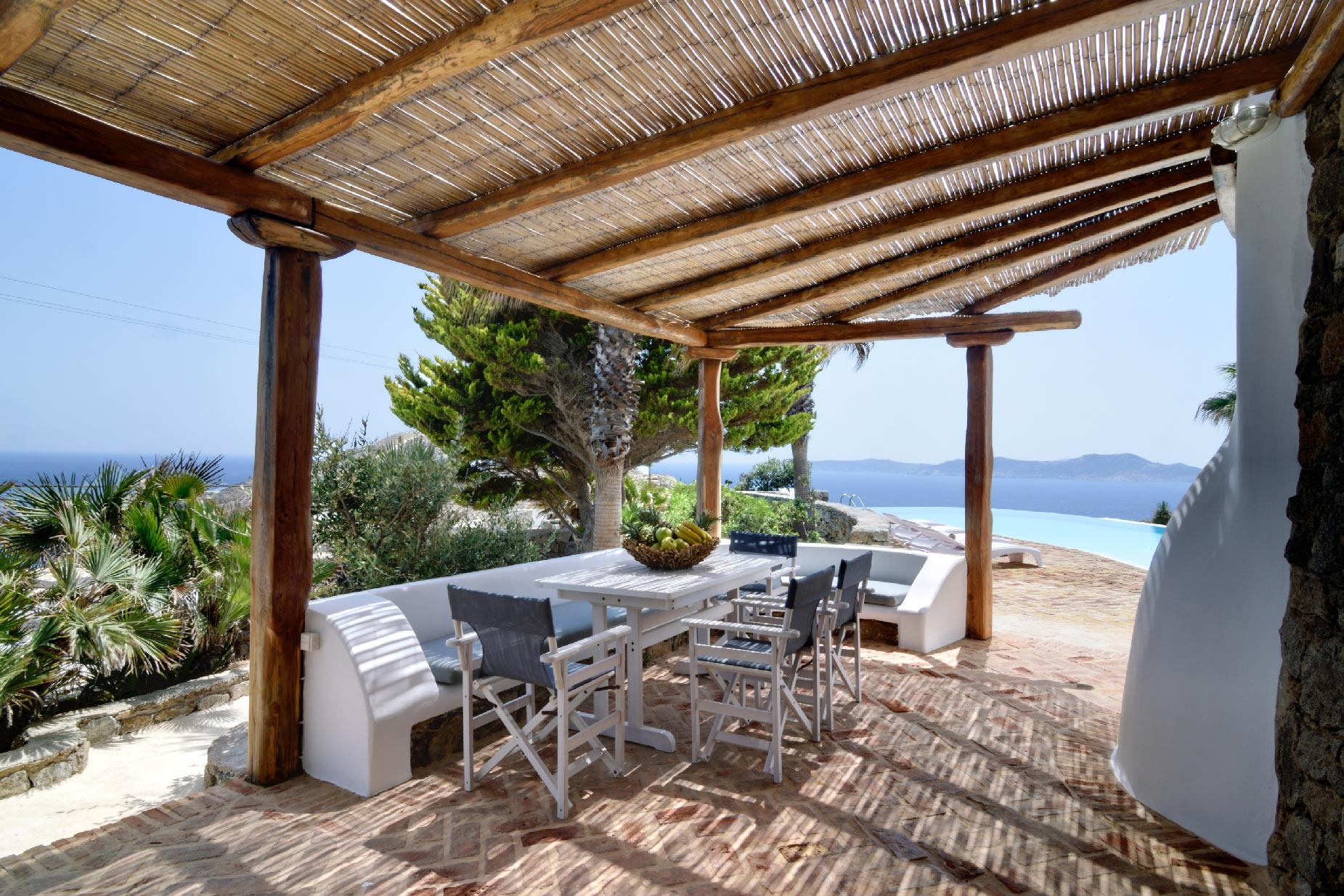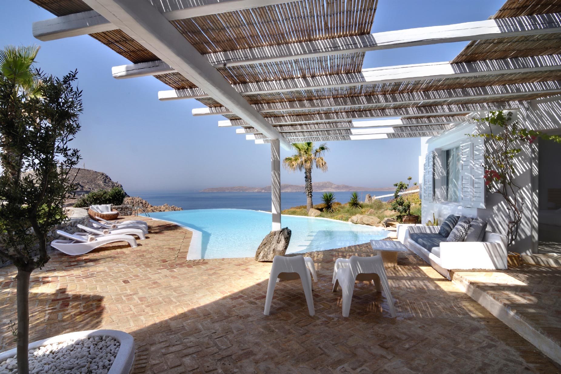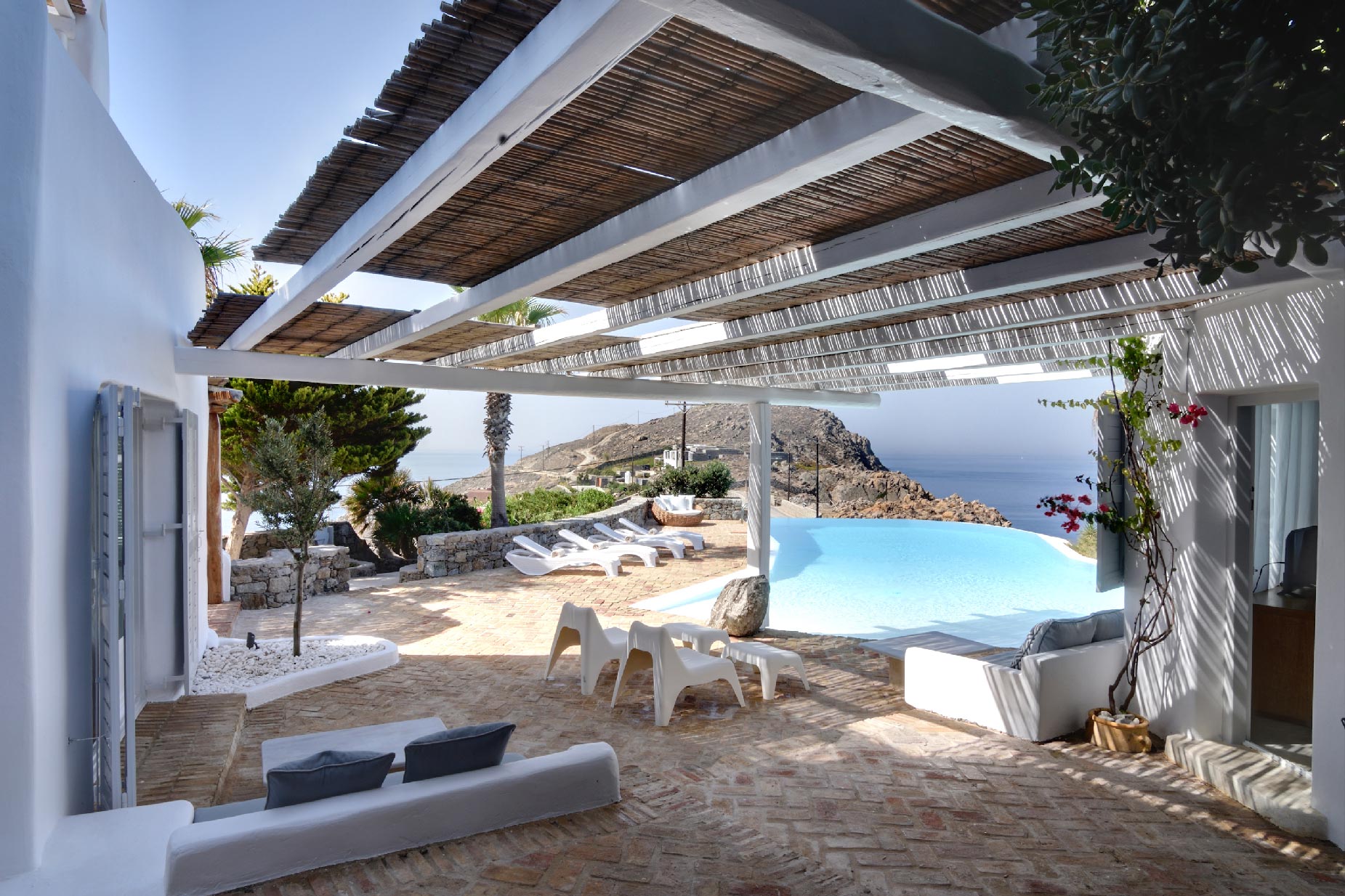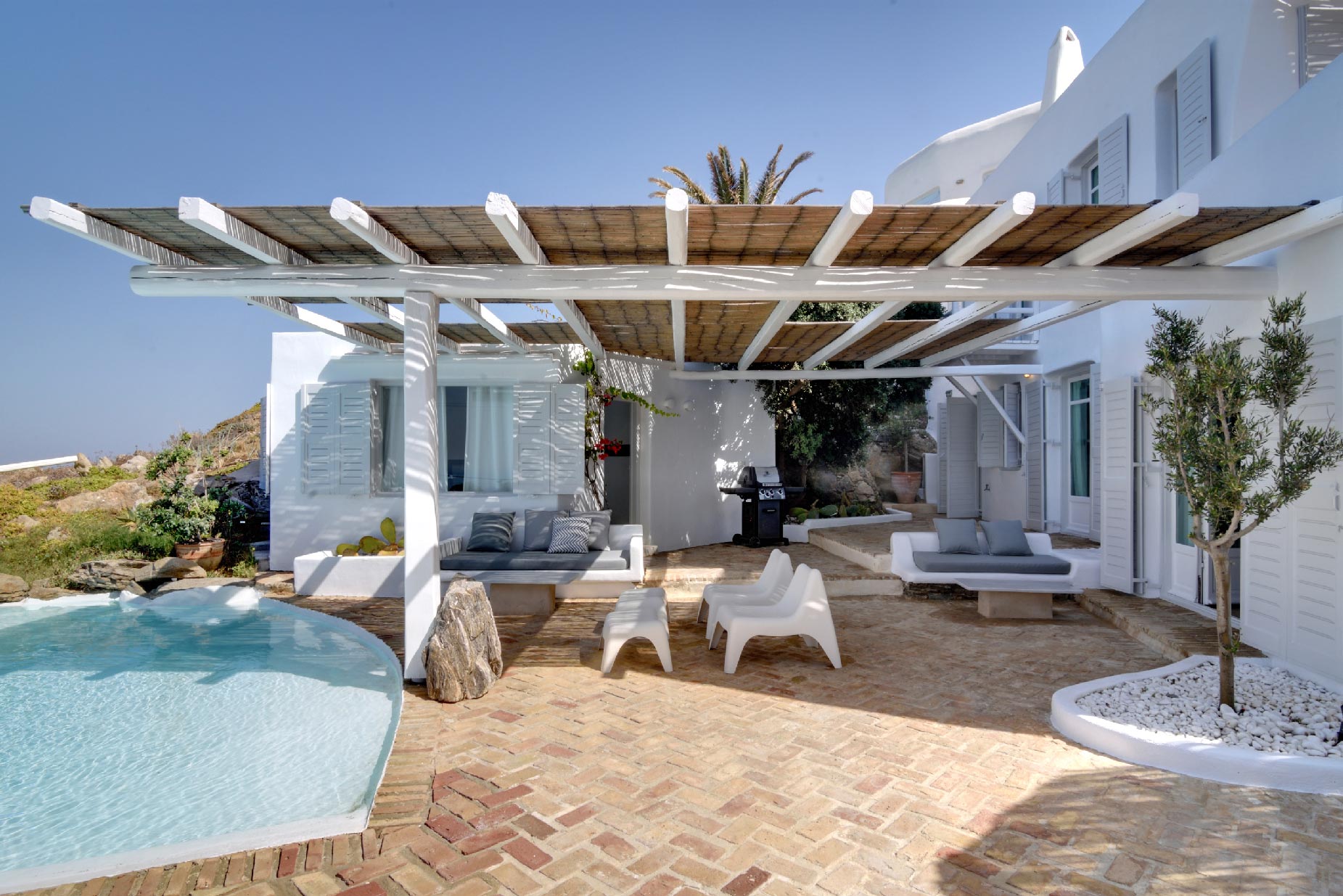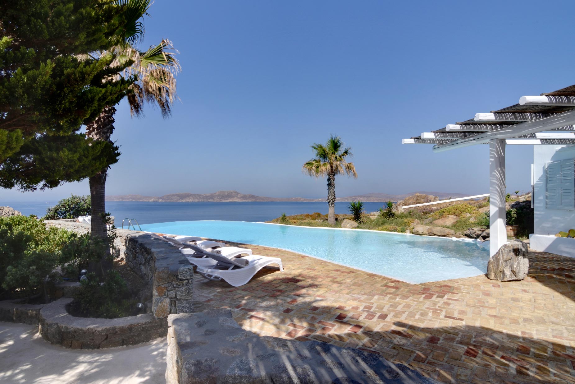 The luxurious 225 sq meters 4-bedroom/5 bathroom villa, is a unique and luxury property that stands on a sublime location in the south-west of the island in the area of Aleomandra just 60 meters from the sea front with magnificent views the infinite blue of the Aegean Sea that expands as far as the eye can see, towards the neighboring Cycladic islands of Naxos and Paros as well as the captivating sunsets of Mykonos.