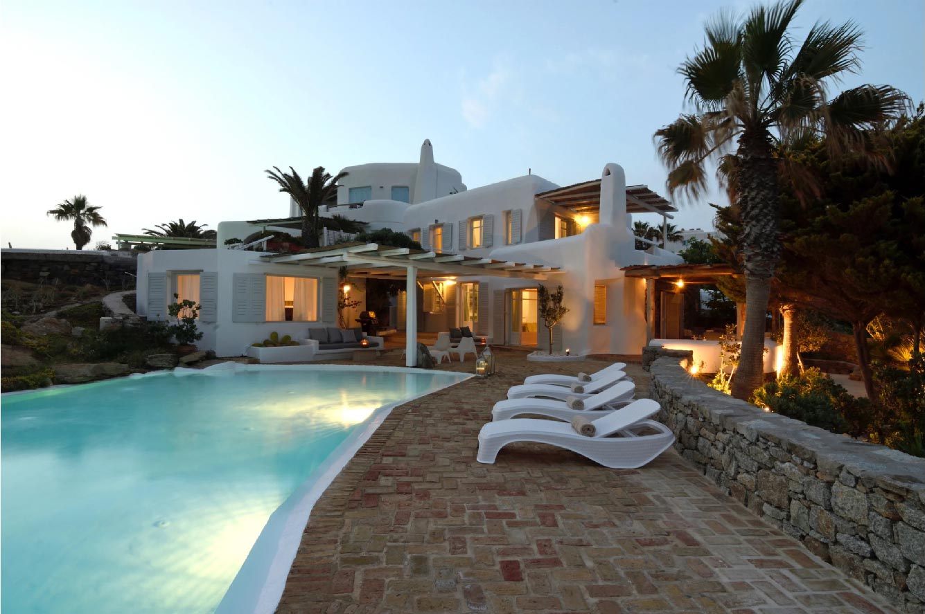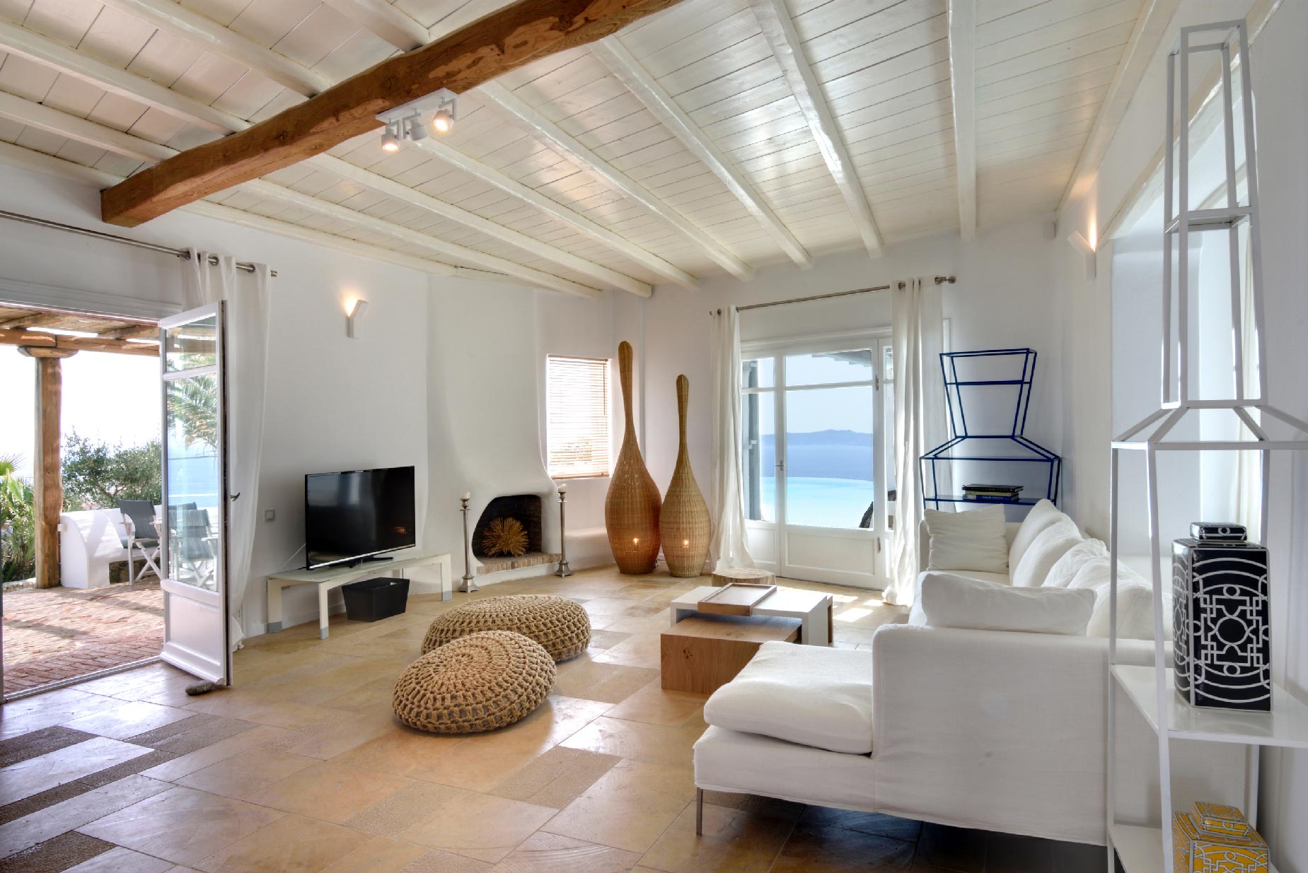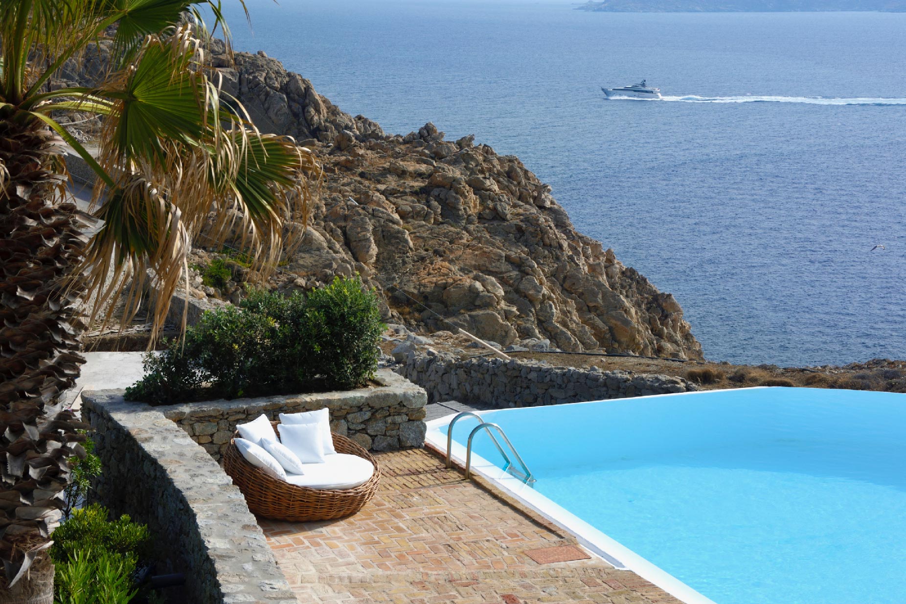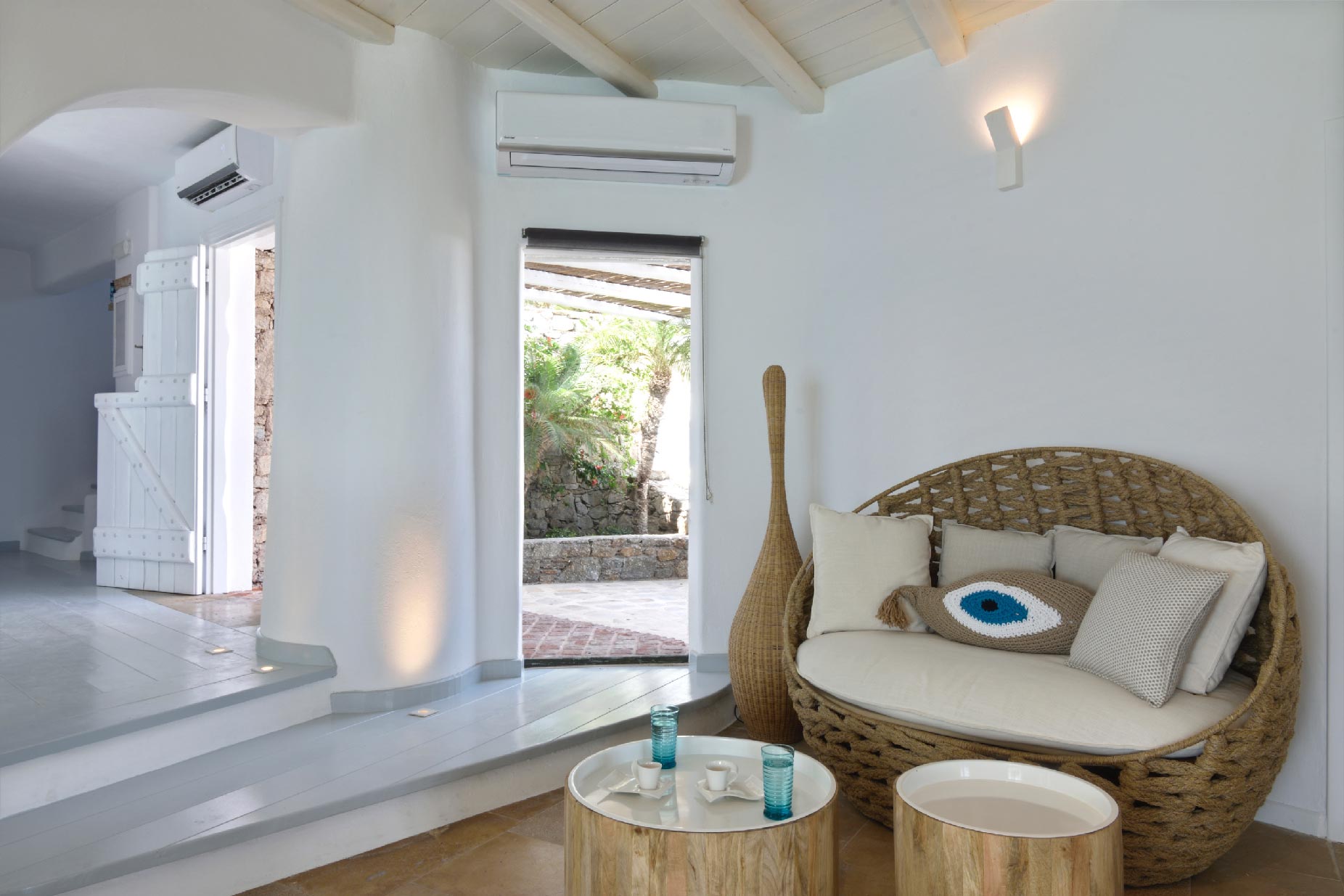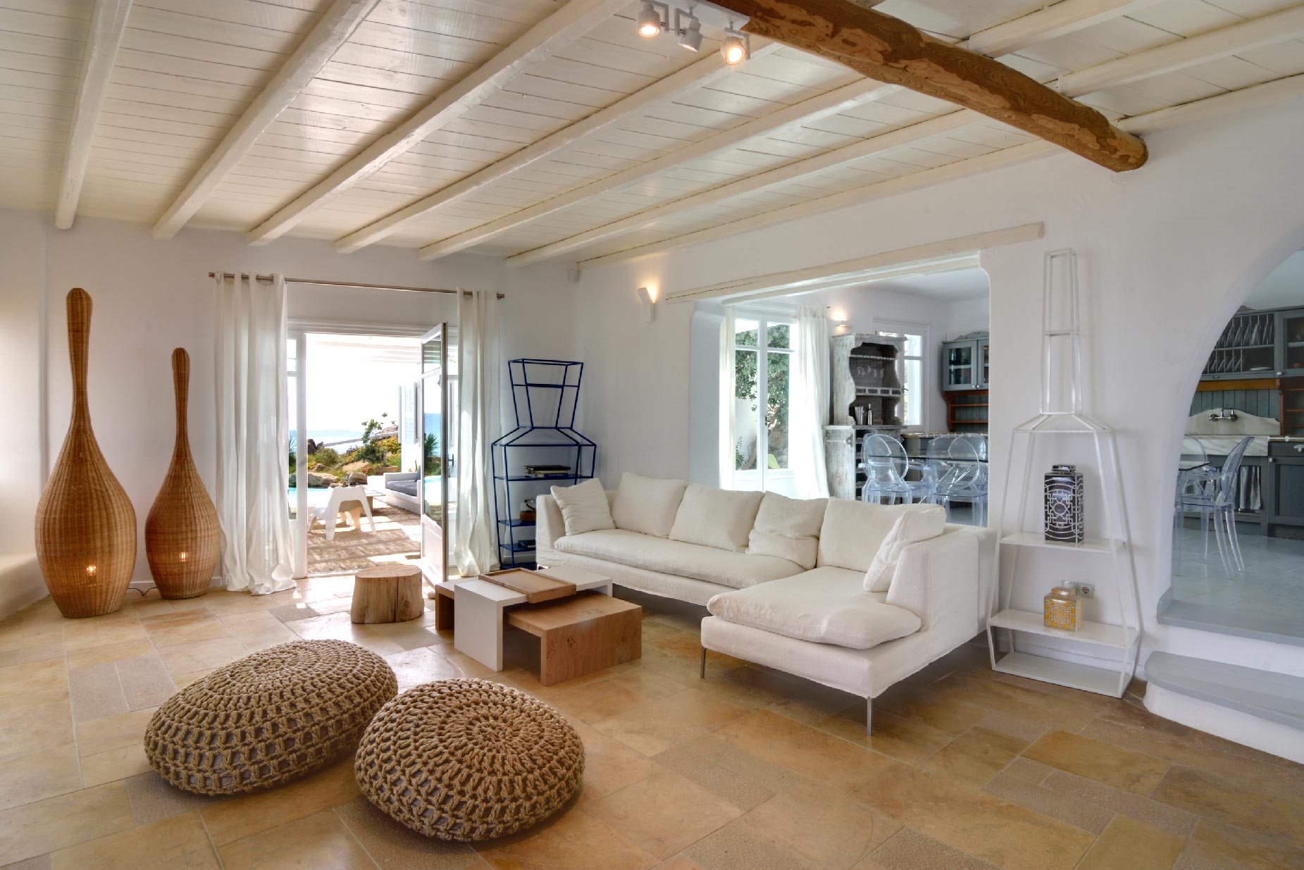Harmoniously blending with the striking landscape, the architecture of the villa honours traditional Cycladic structure, designed with respect to natural materials and highlighted by a lush garden. Whitewashed walls, natural stone and wood are combined with the elaborately appointed interiors of the villa evoking Mykonos’s timeless beauty.