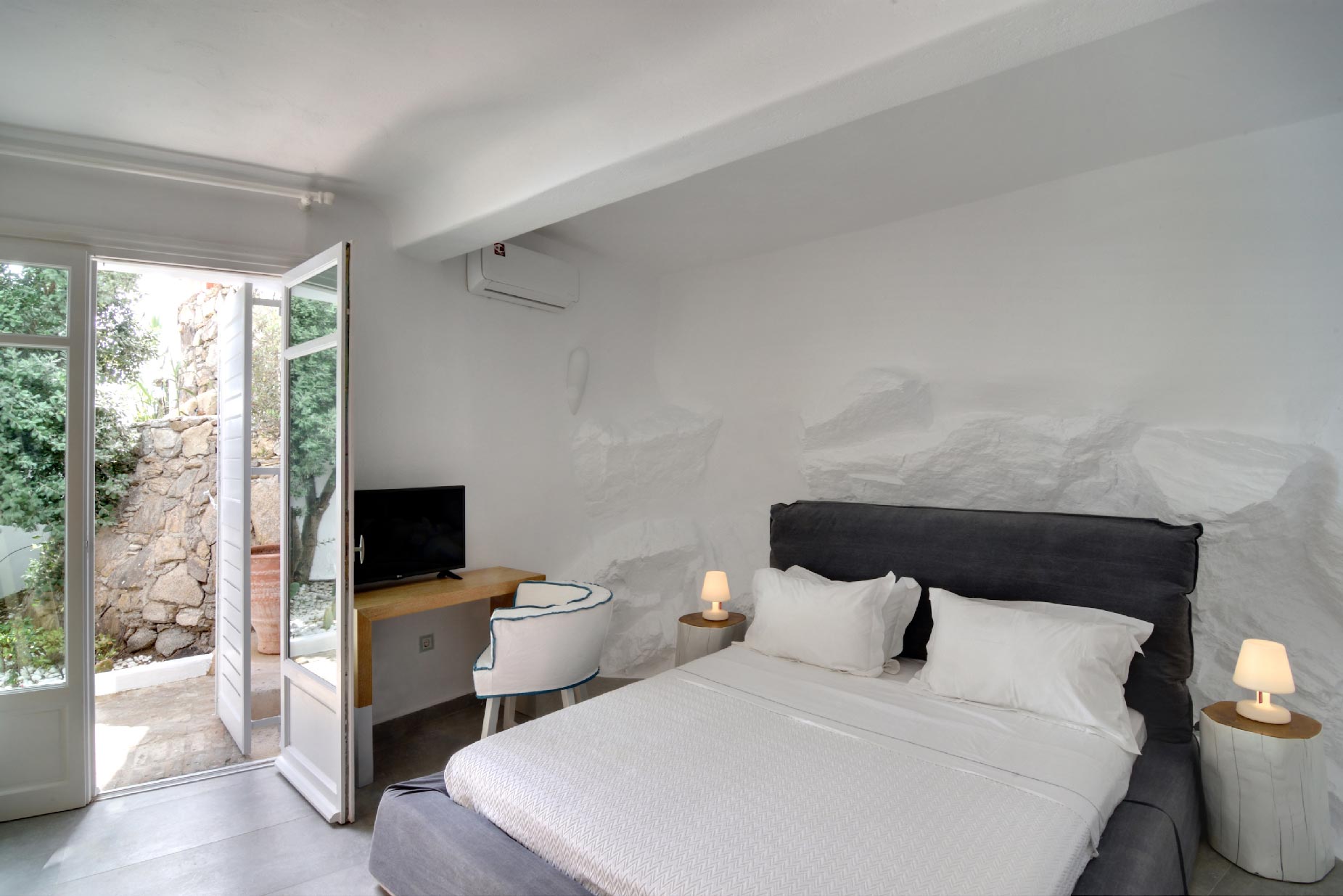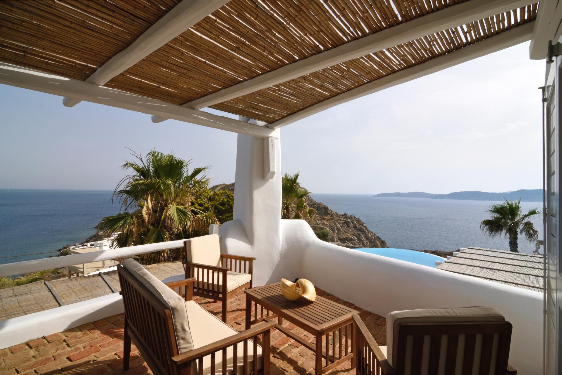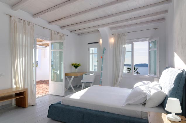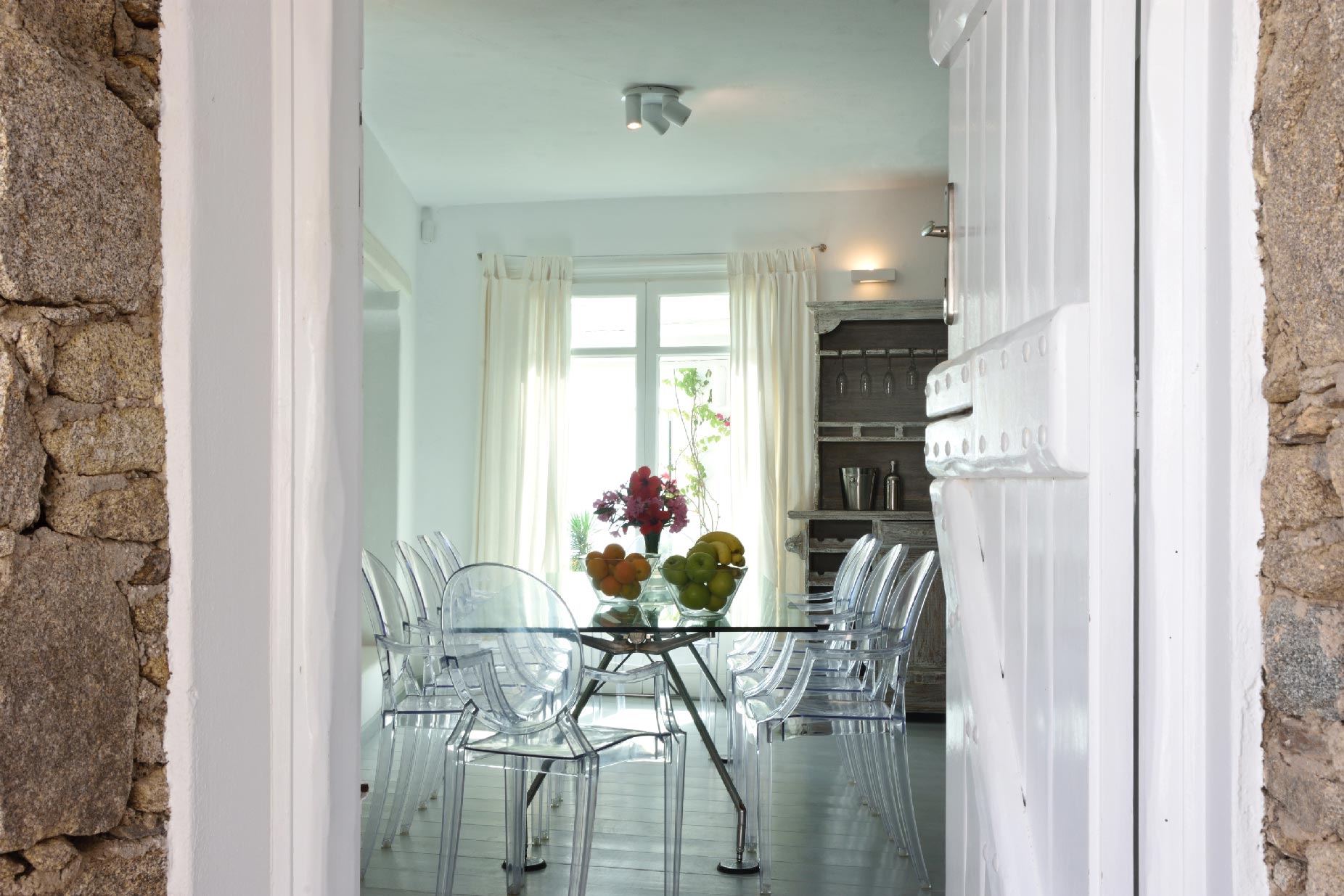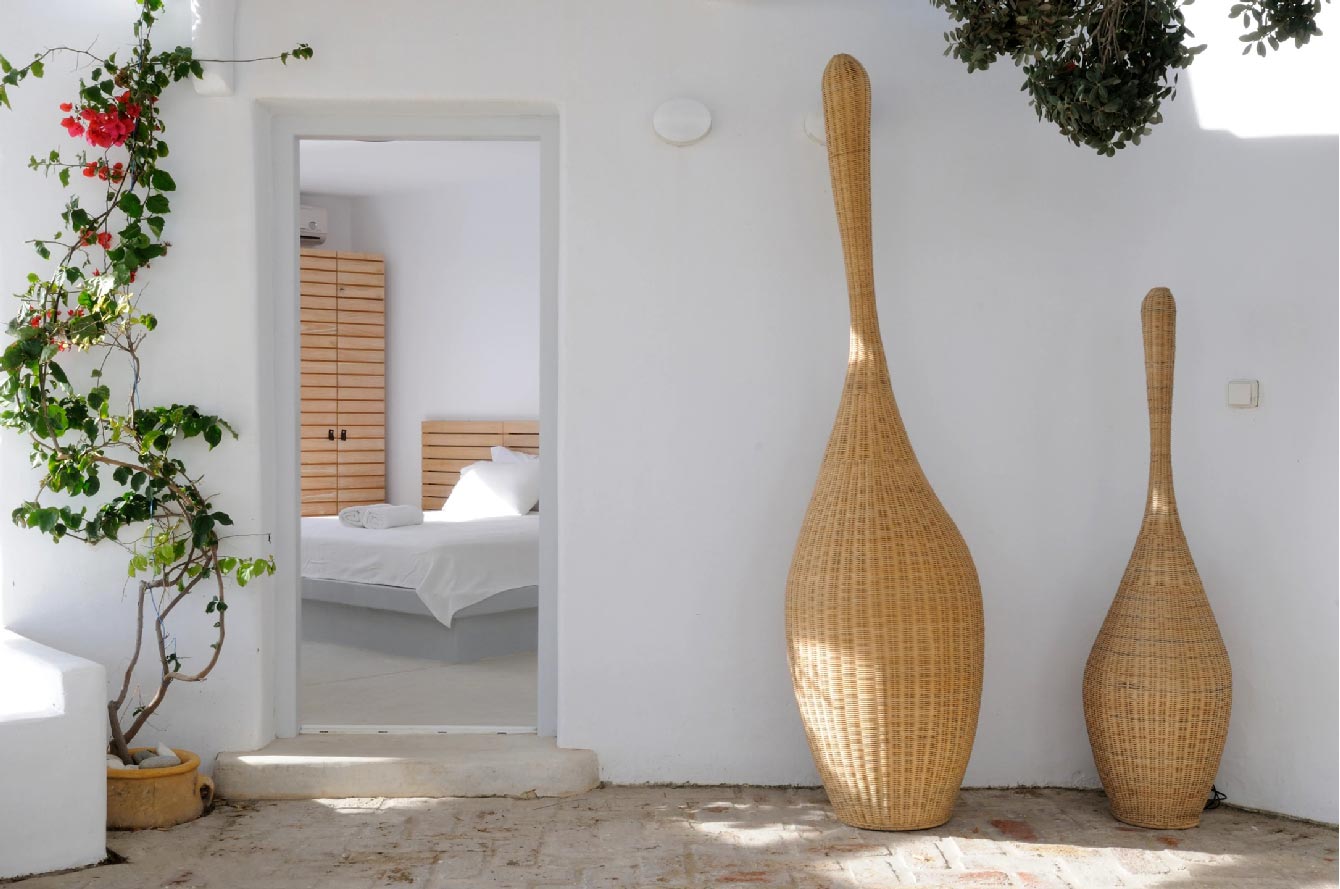 Harmoniously blending with the striking landscape, the architecture of the villa honours traditional Cycladic structure, designed with respect to natural materials and highlighted by a lush garden. Whitewashed walls, natural stone and wood are combined with the elaborately appointed interiors of the villa evoking Mykonos’s timeless beauty.