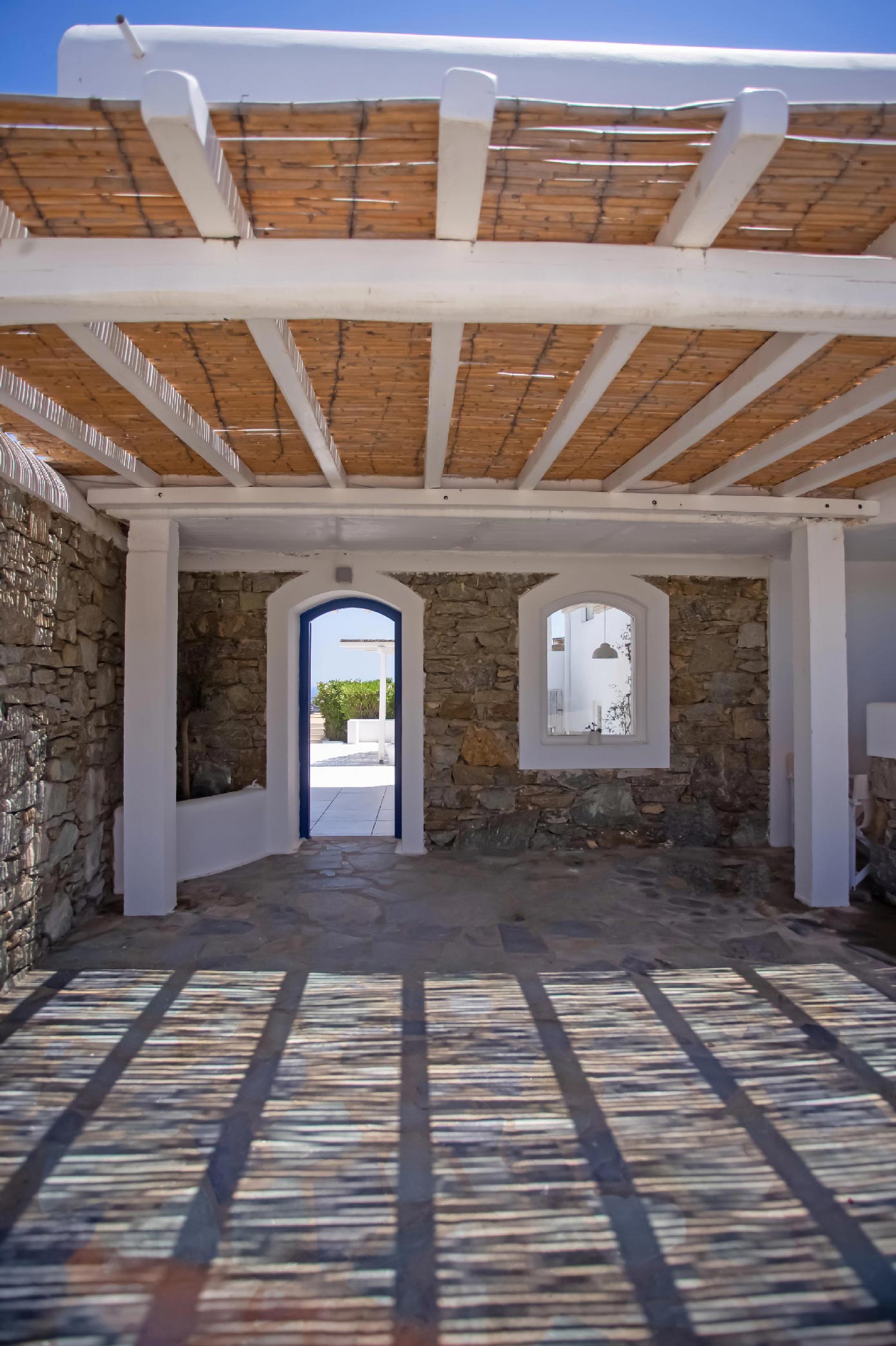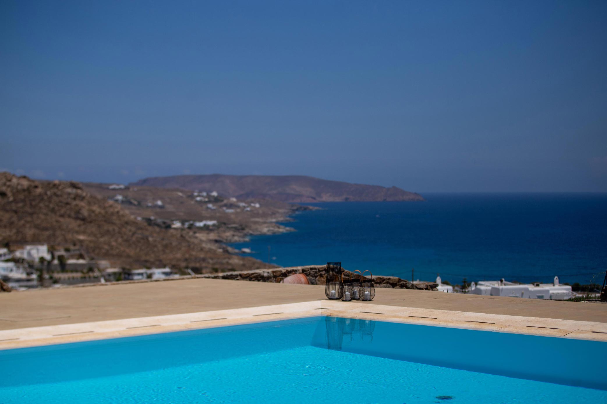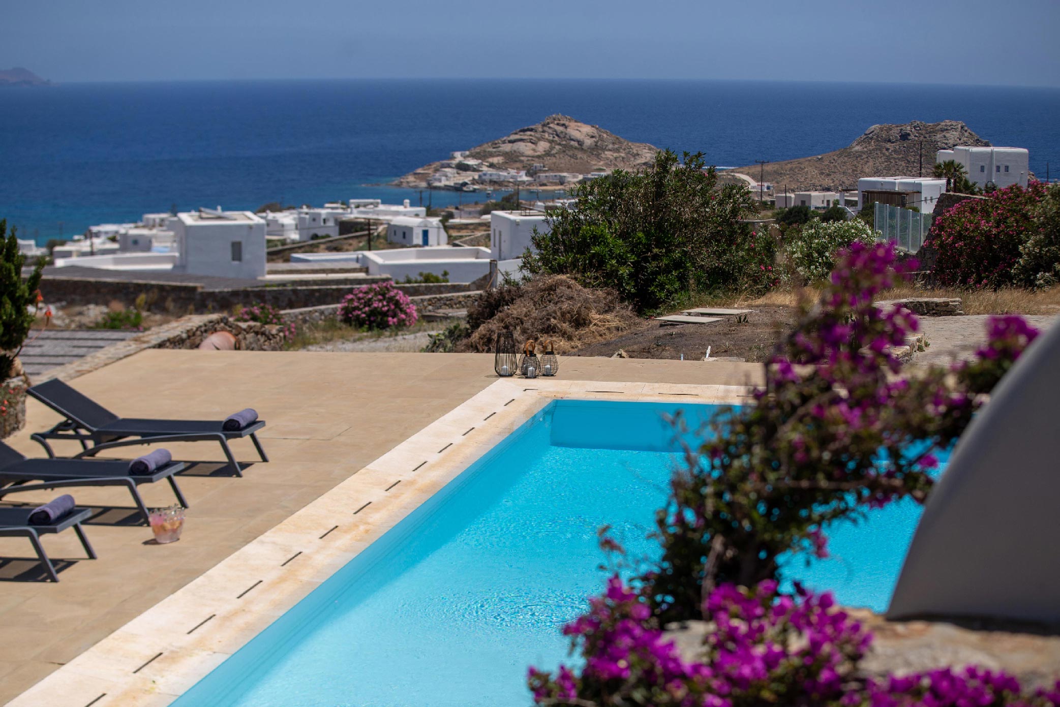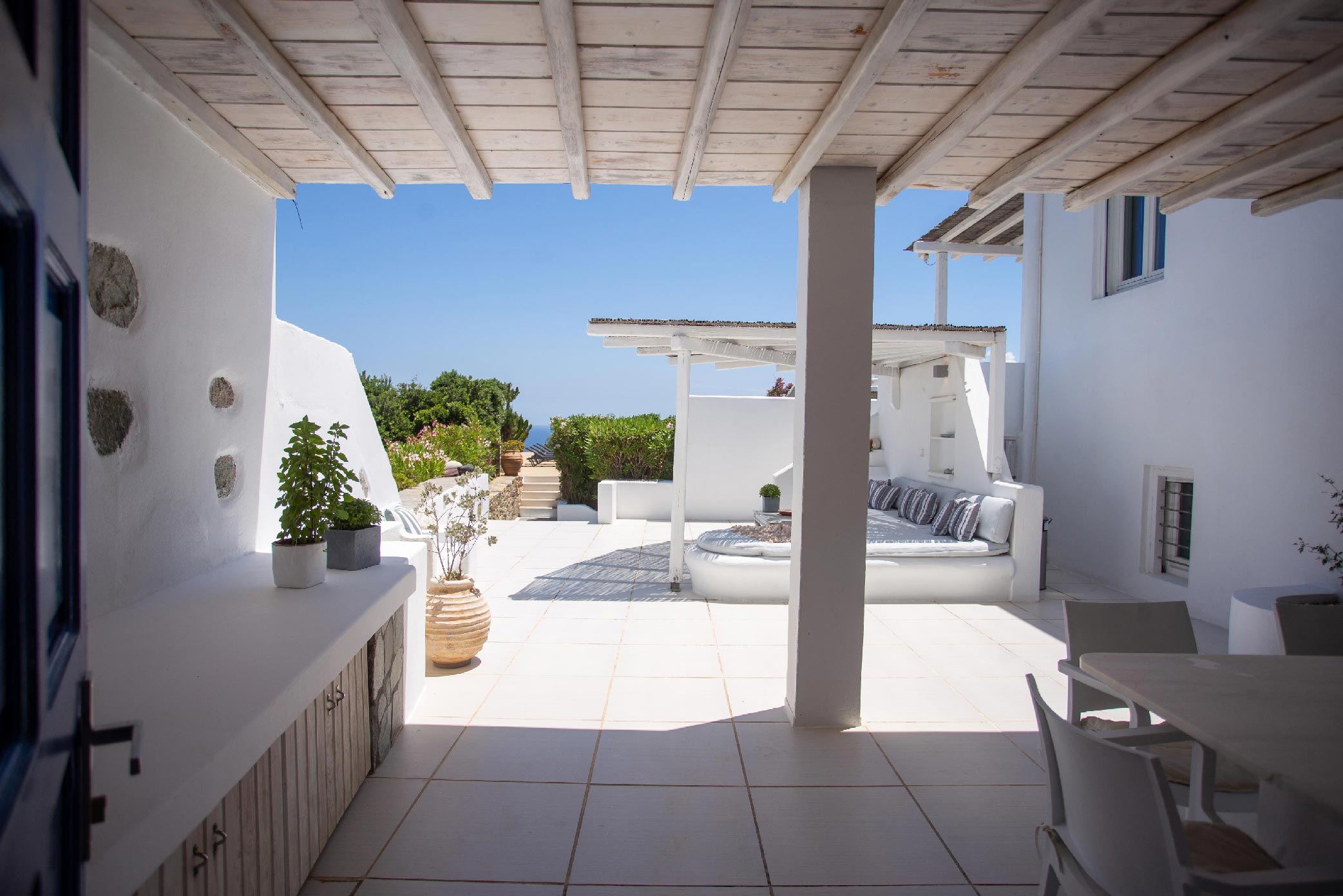 A gorgeous home that enjoys panoramic views and perfectly blends the Cycladic style with exotic details and a Mexican-like ambience with stone-built fences and large cacti plants.