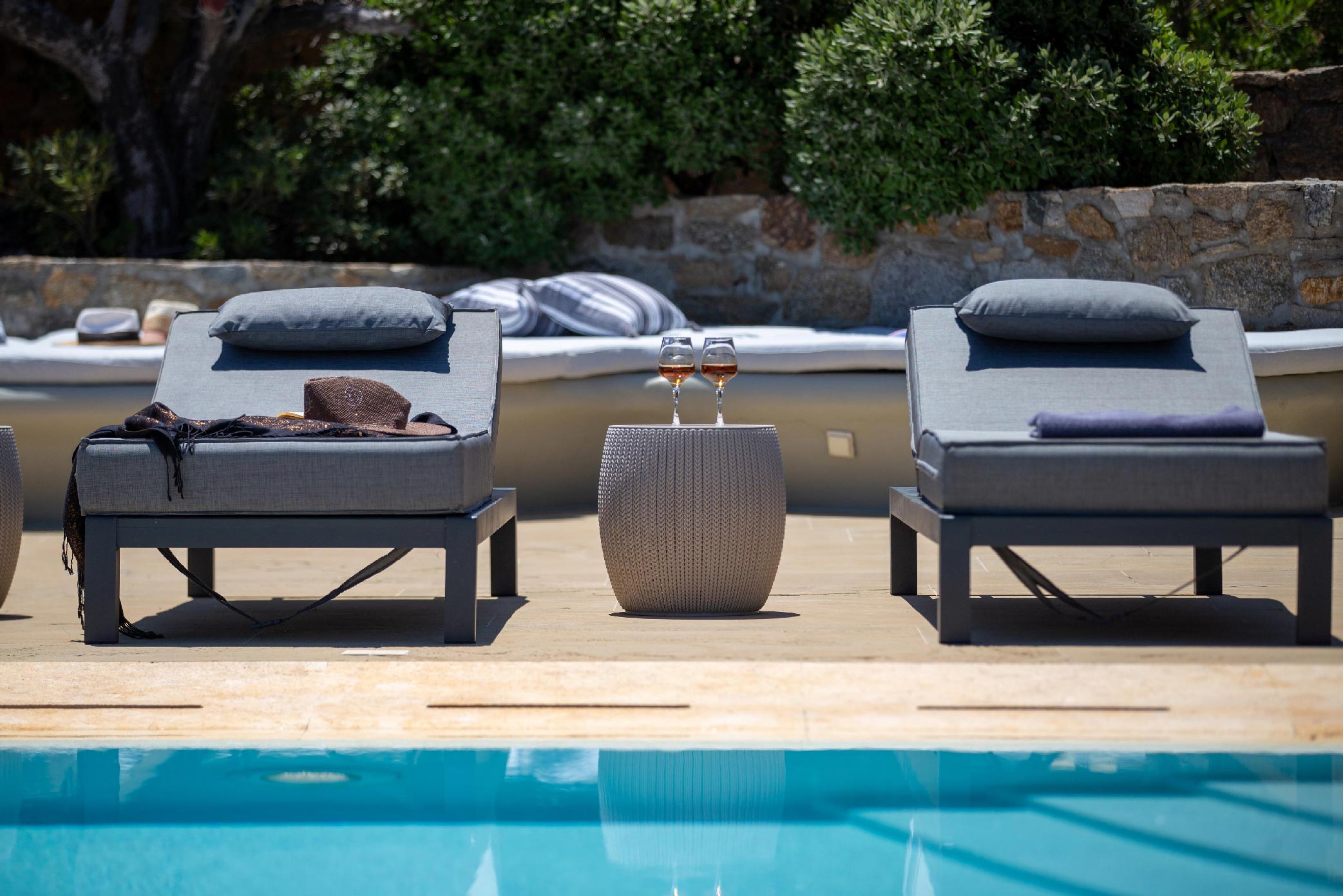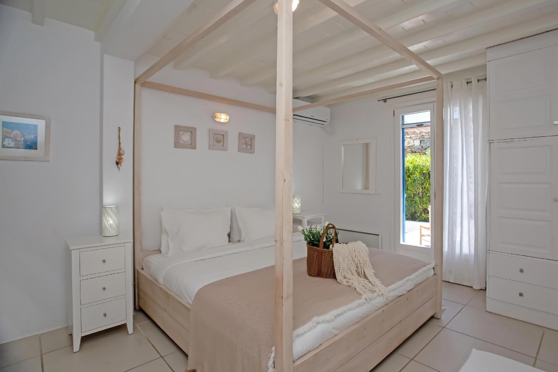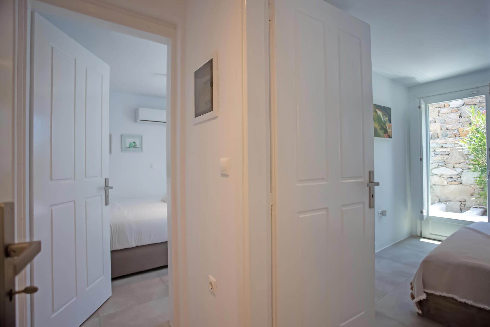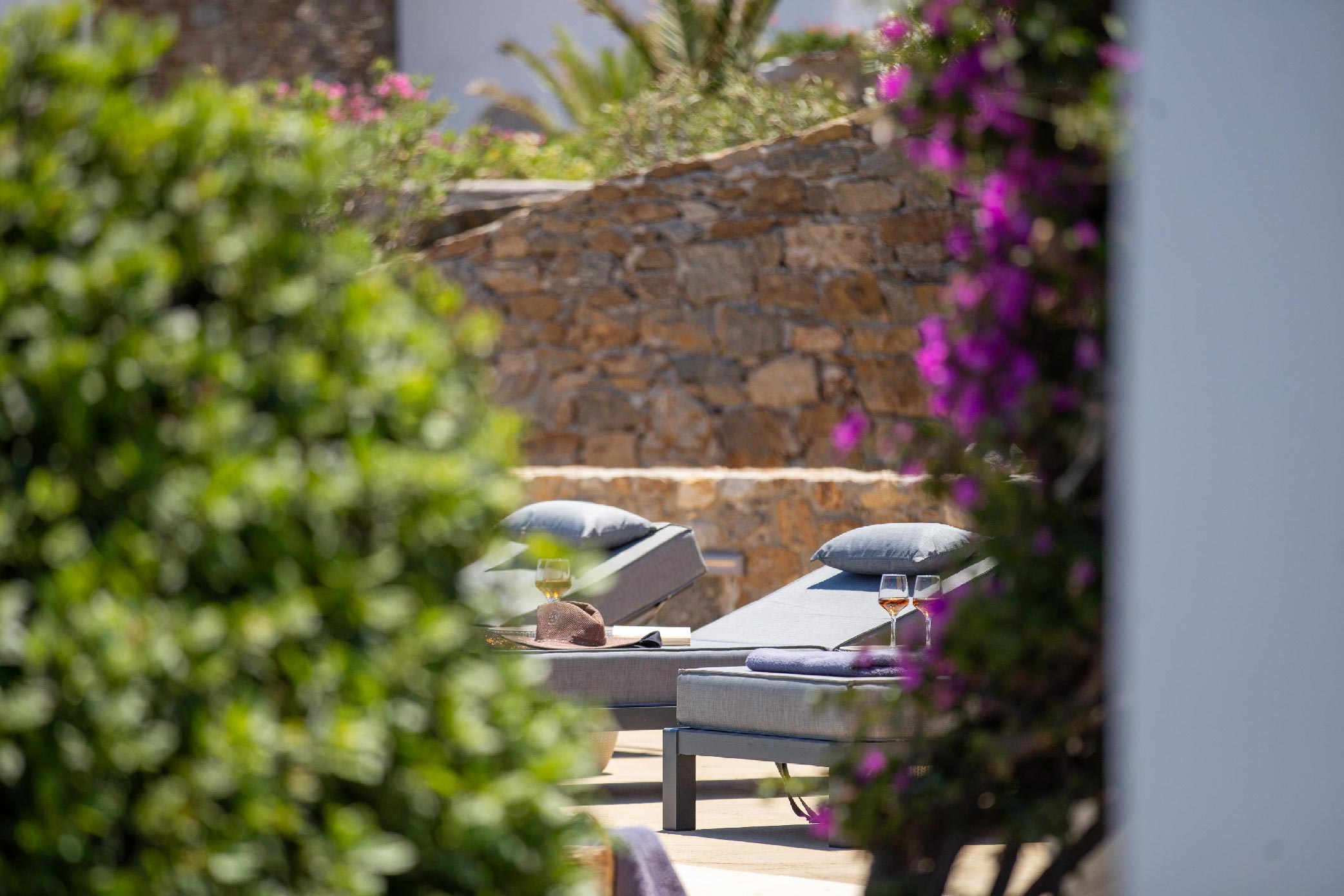 A gorgeous home that enjoys panoramic views and perfectly blends the Cycladic style with exotic details and a Mexican-like ambience with stone-built fences and large cacti plants.
