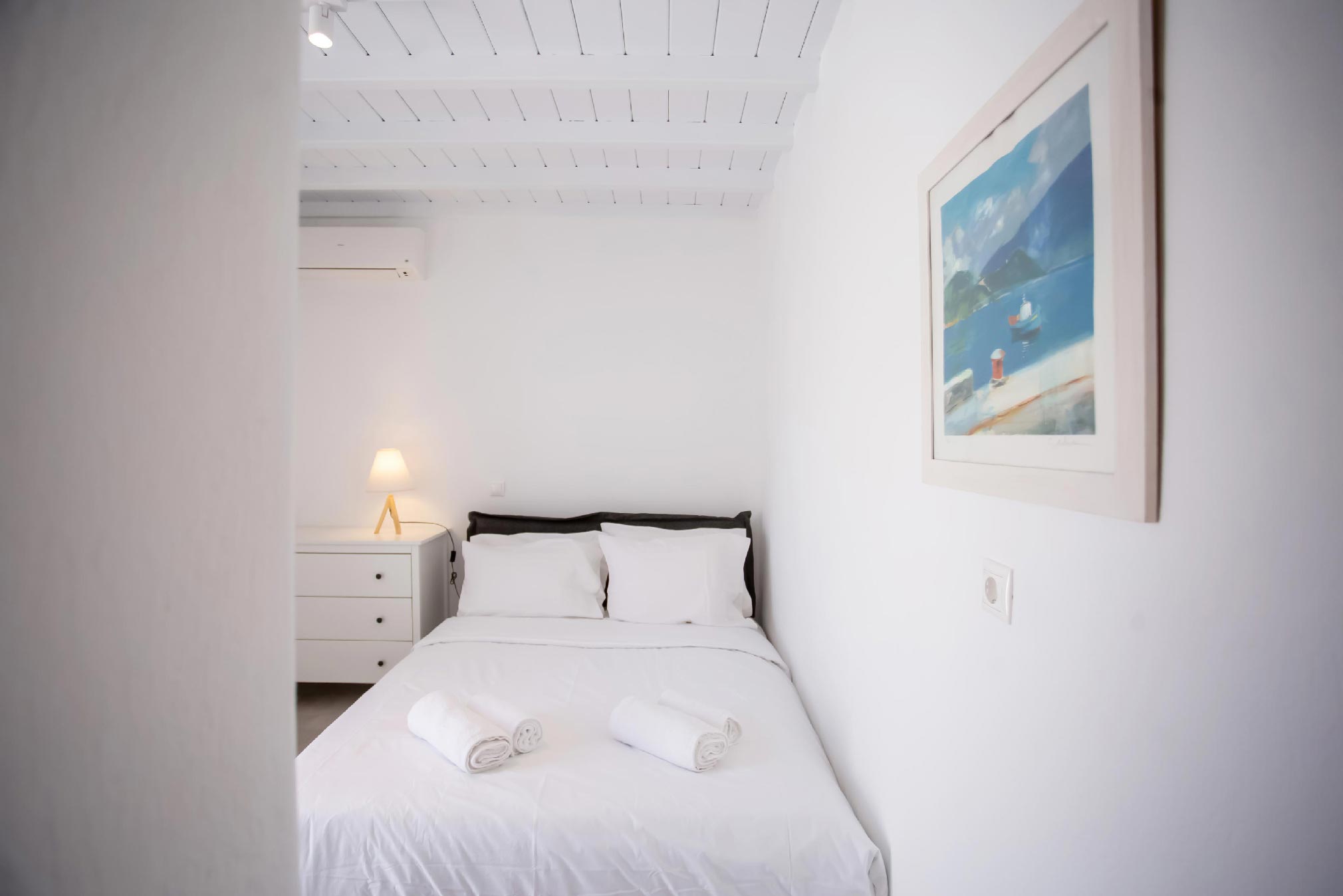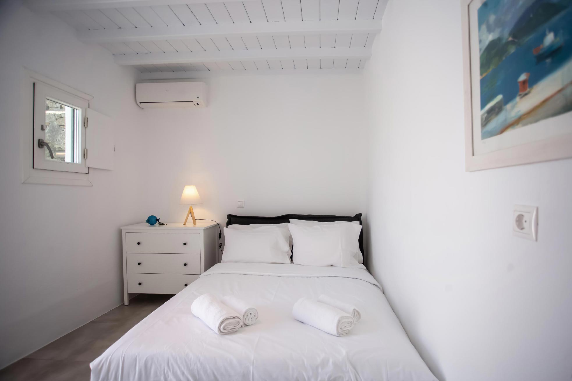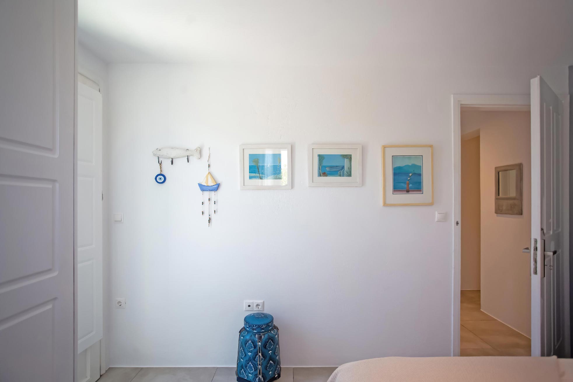 Drenched in the soothing Aegean sun, this villa is a cinematic property boasting an enviable location, right at the rim of a cliffside overlooking the entire bay of Kalafatis and the cobalt sea.