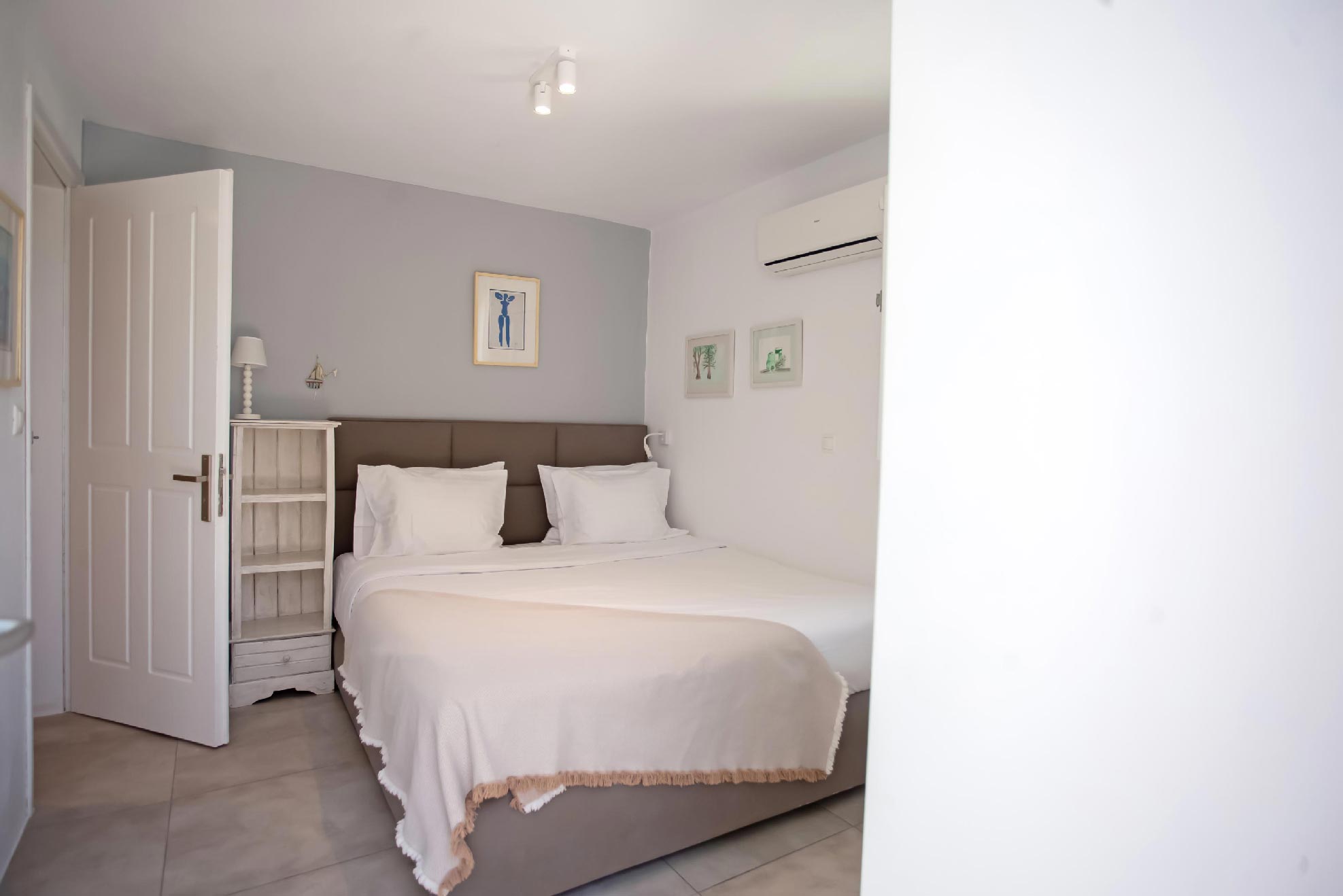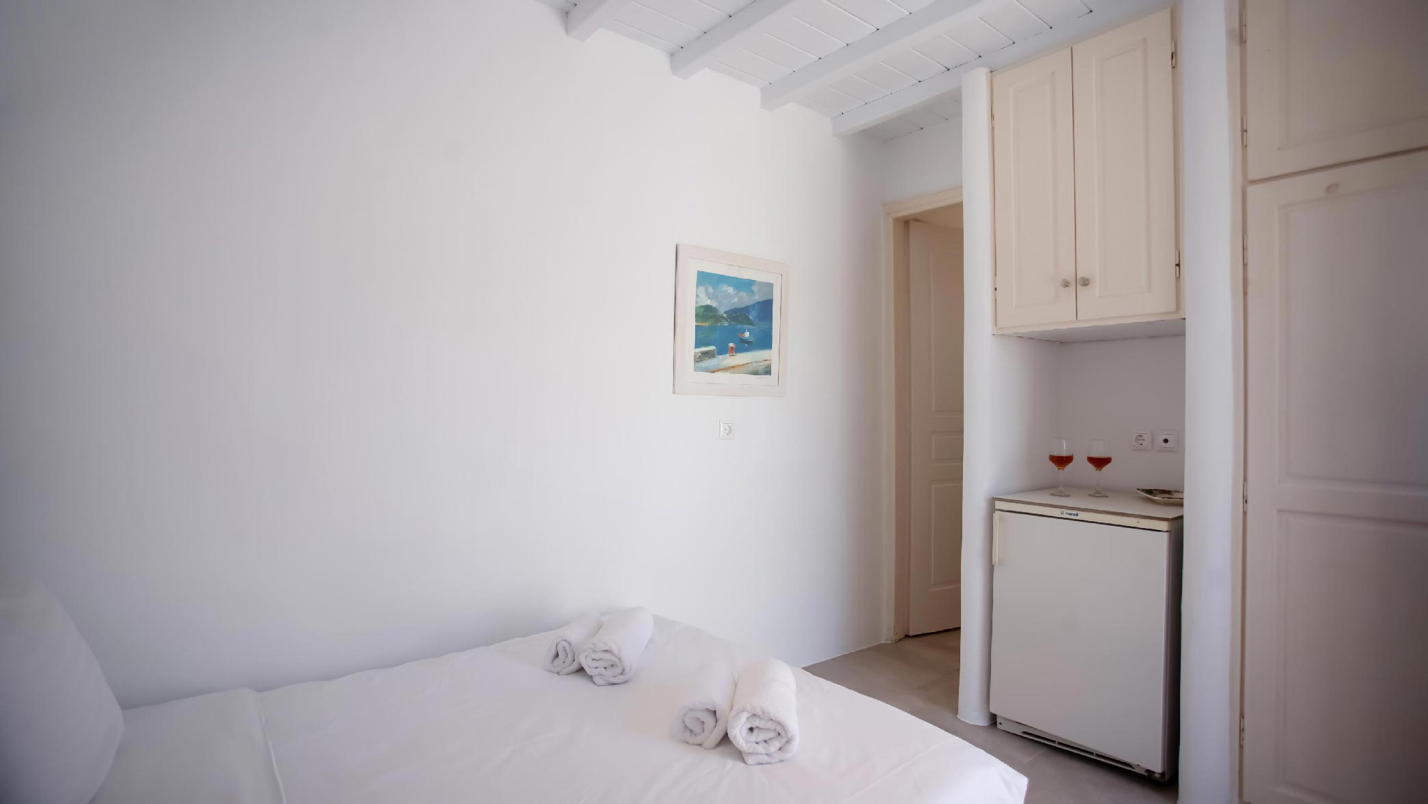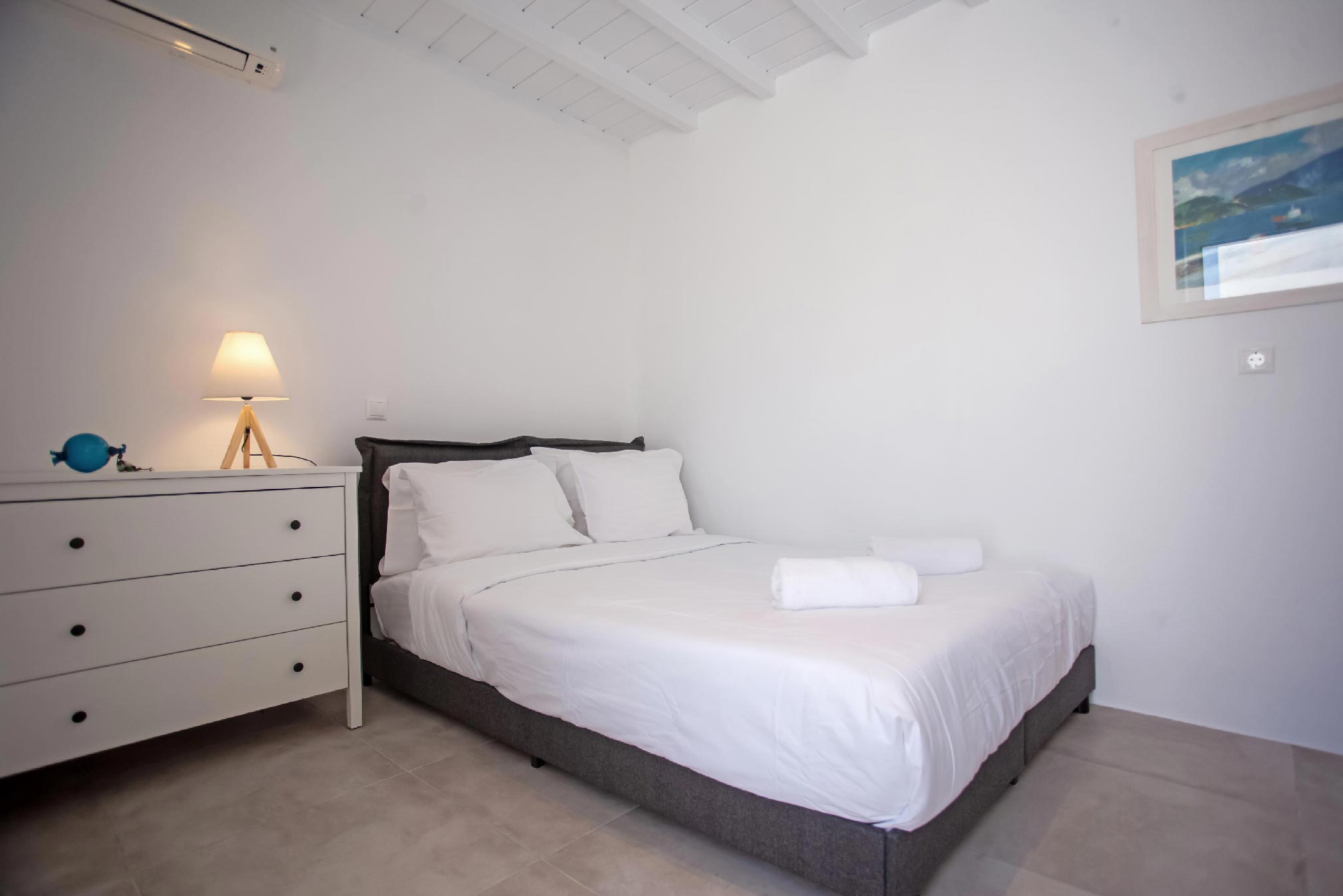 Drenched in the soothing Aegean sun, this villa is a cinematic property boasting an enviable location, right at the rim of a cliffside overlooking the entire bay of Kalafatis and the cobalt sea.