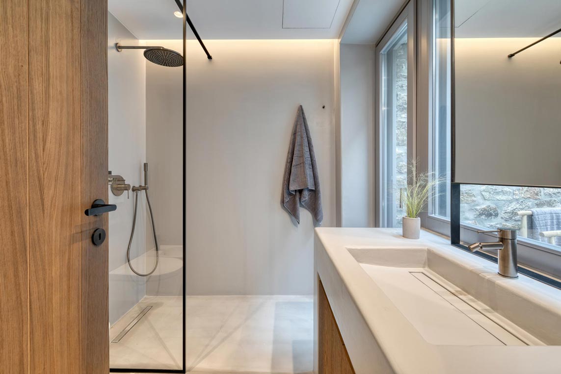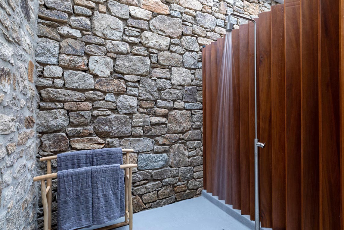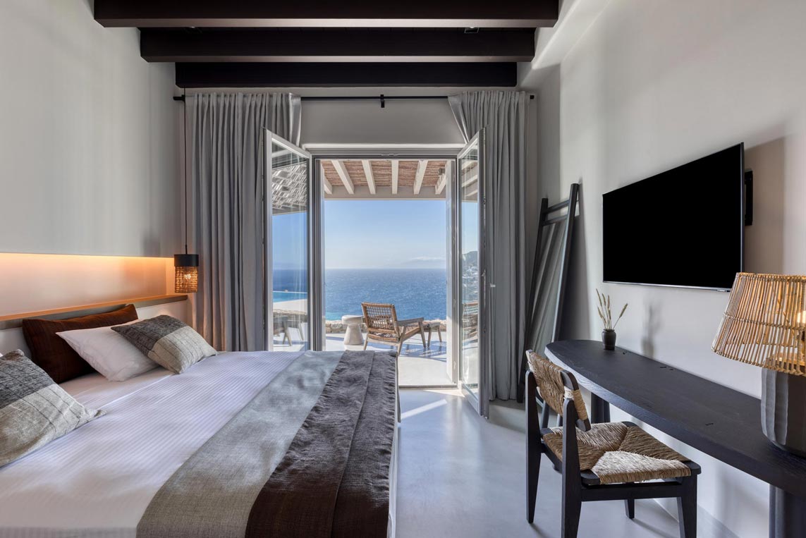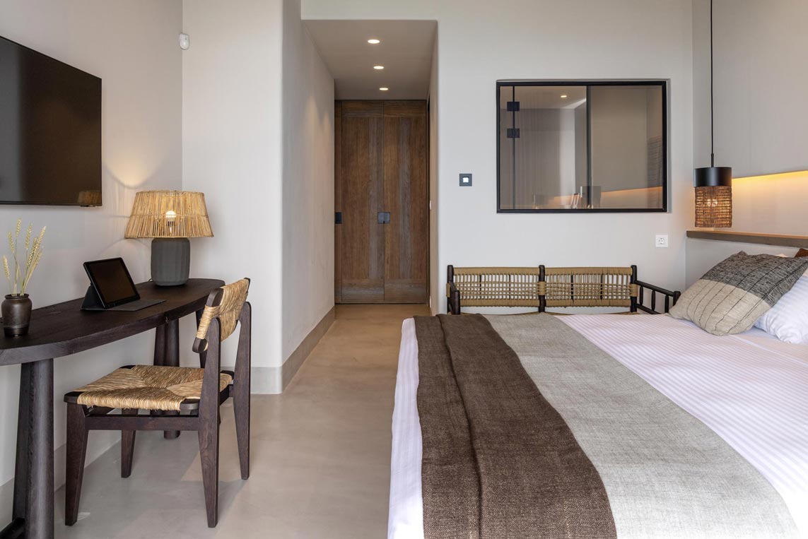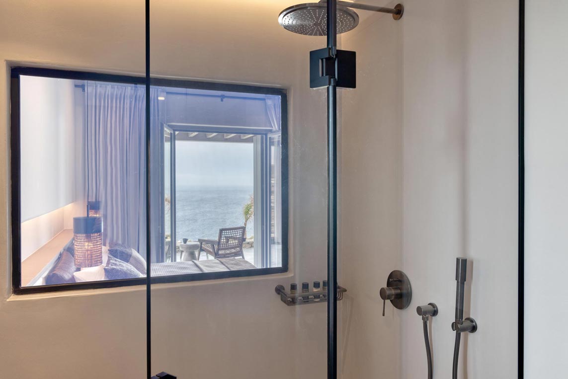 Suite 4: built-in queen-size bed, TV, en-suite bathroom with shower, access to an outdoor very well designed hot shower, direct access to a terrace via balcony doors | panoramic sea view room | the room has access through the indoor living room area + an individual door