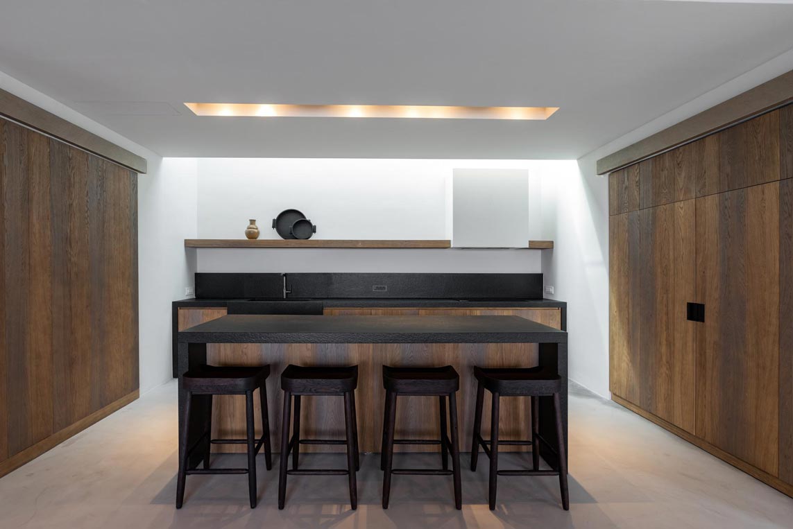 Open plan fully equipped kitchen with kitchen island and high chairs, spacious living room with TV, and amazing pool and see view, guest WC, indoor dining area [6 seats] – access to the outdoor kitchen-bar with BBQ and outdoor dining area