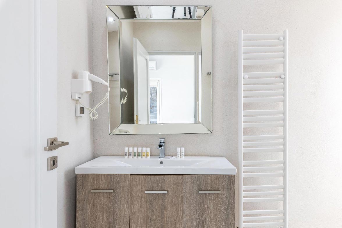 • Guest house 1 42,3 m2 with side sea view. 1 Open patio. 2 Double beds, sleeps 4. Independent entrance with direct access to the upstairs balcony and the parking area. The room is equipped with a 32’ TV, fridge, espresso machine, tea making facilities, a safe, a hairdryer, air conditioning, toiletries, and towels.
