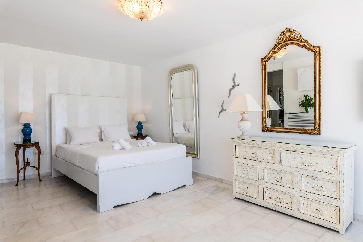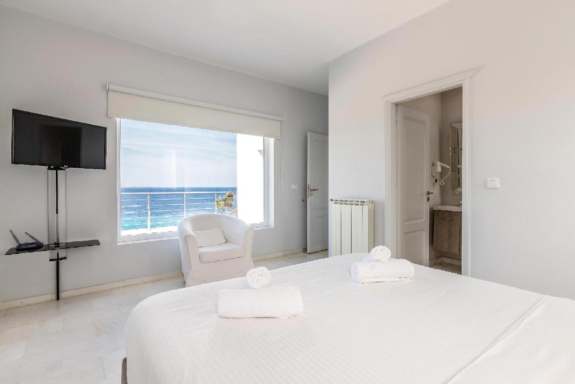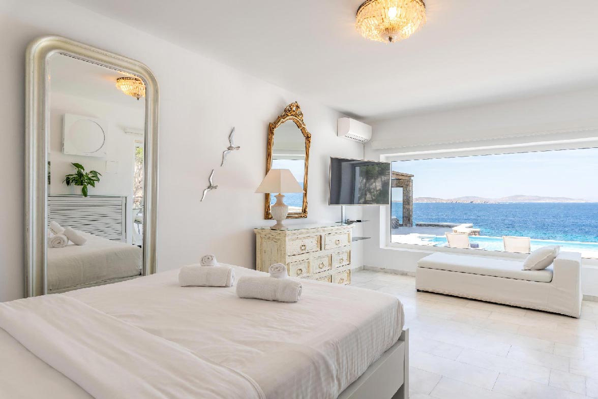 • Master bedroom 31,6 m2. Access to the pool area and the living room area. Seating area for 2 people. Northwest direction with View to Delos Island and the Aegean Sea, while the room offers unique sunset views. The room has a Queen Size bed with 4 pillows. The room is equipped with a TV 55’, hairdryer, air conditioning, safe box, toiletries, and towels.