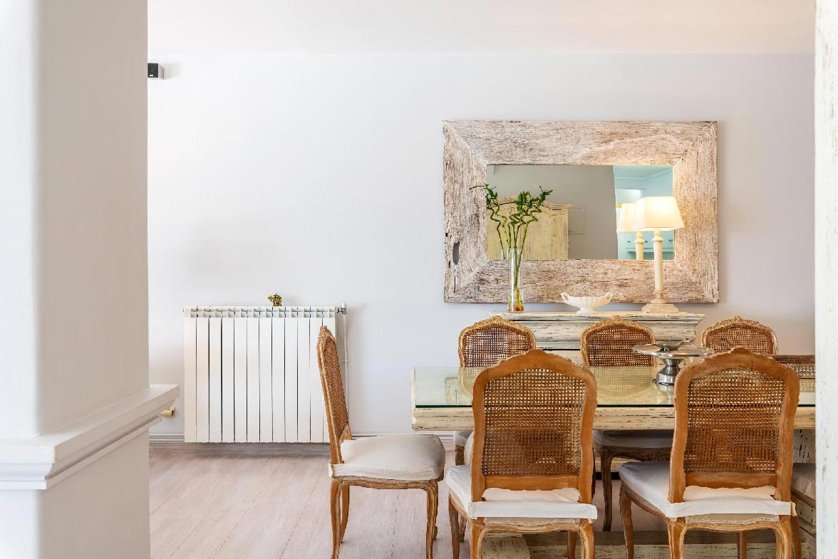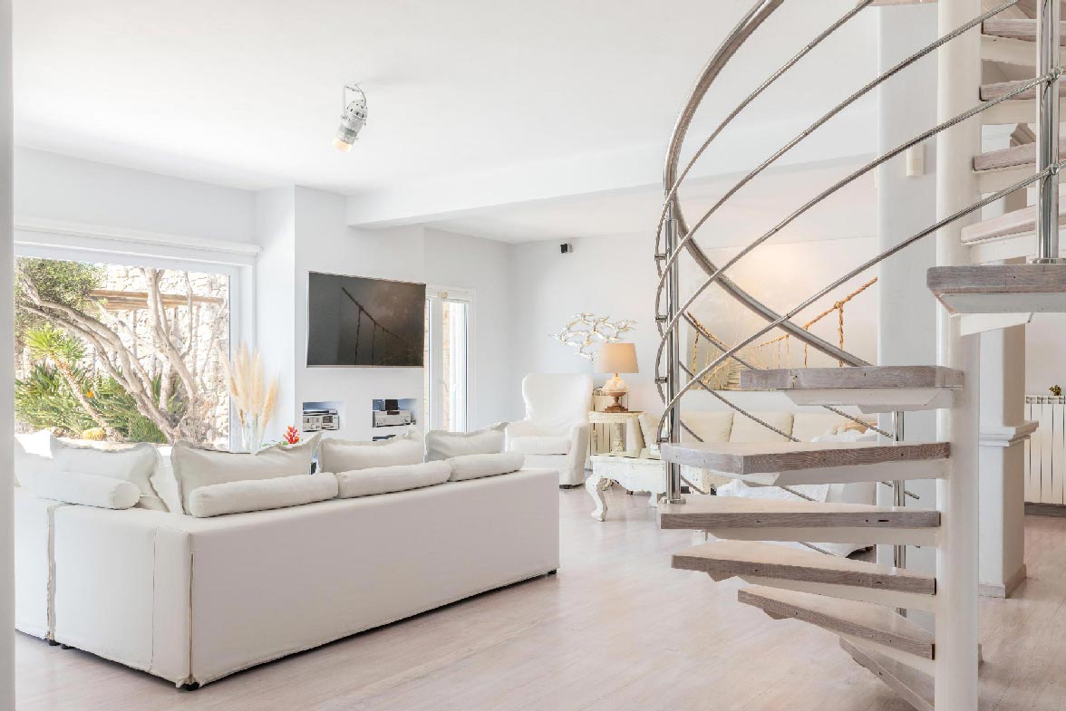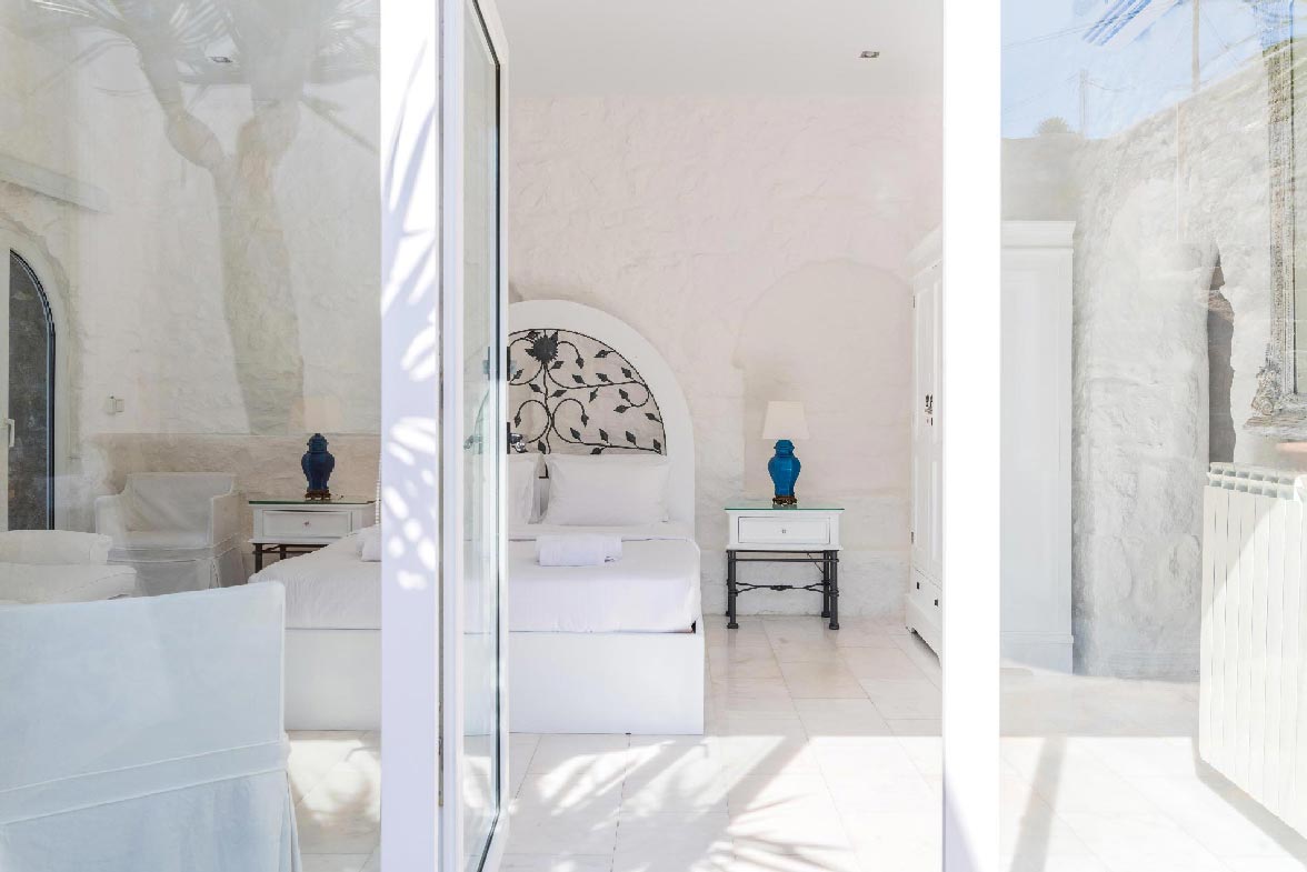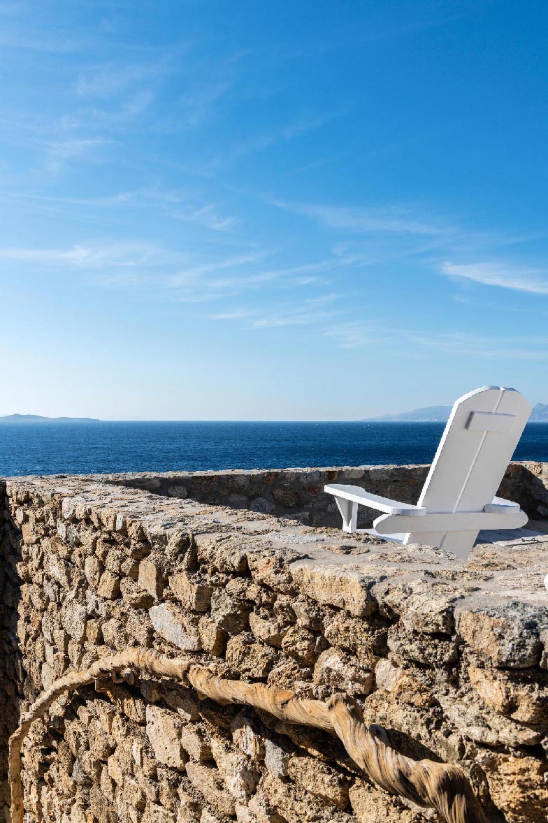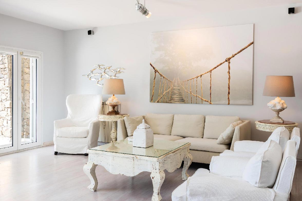 Villa Chrysa is located in Aleomandra area (near Ornos beach) is a modern luxurious sea front residence with some vintage elements that makes it unique. The Villa consists of 5 spacious en-suite bedrooms and can welcome up to 12 guests. 3 double bedrooms are in the main building where they offer unlimited spectacular views of the Aegean Sea and Delos Island. There are also 2 guest houses with their own independent entrance. The firsts guest house comes with 2 double beds and the second with one. The warm white Mykonian light enters from the spacious windows and bathes all the areas of the Villa.