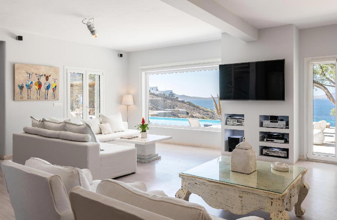 • The villa offers a huge living room of 93m2, with two seating areas that can easily host up to 15 people. The living room has a unique view to the Aegean Sea and Delos Island, while there is unique sunset view as well. It is equipped with a 60’ Smart TV and sound system. From the living room there is direct access to the pool area, the common WC and the kitchen.