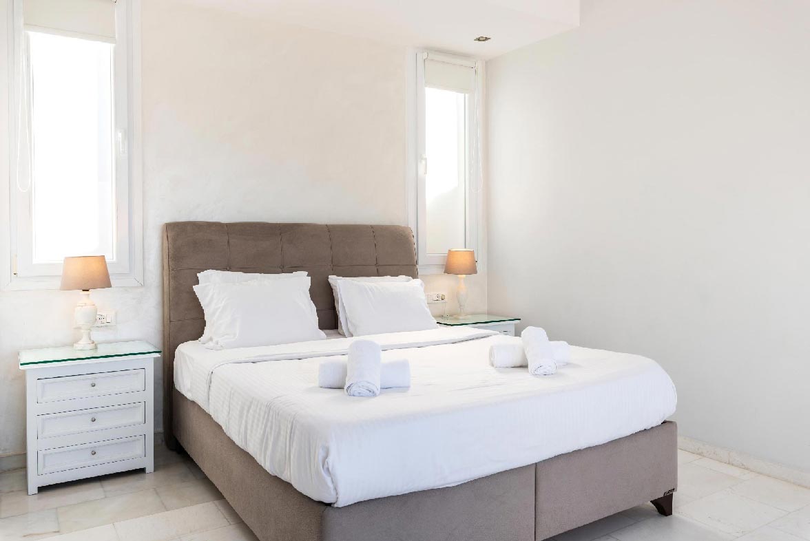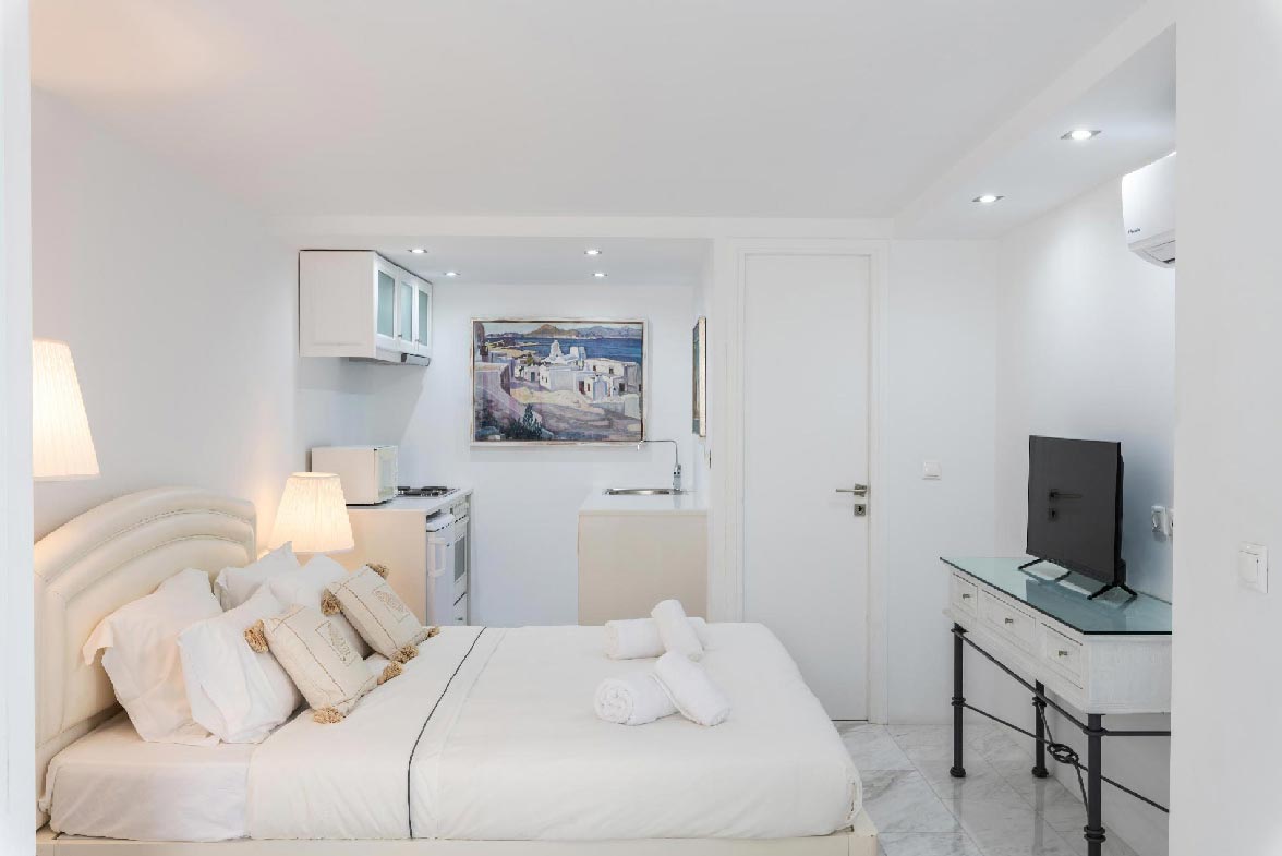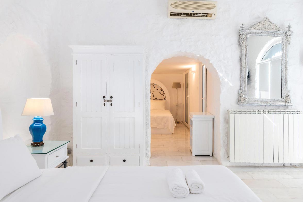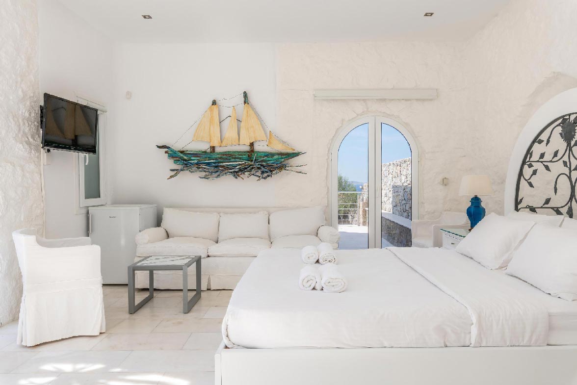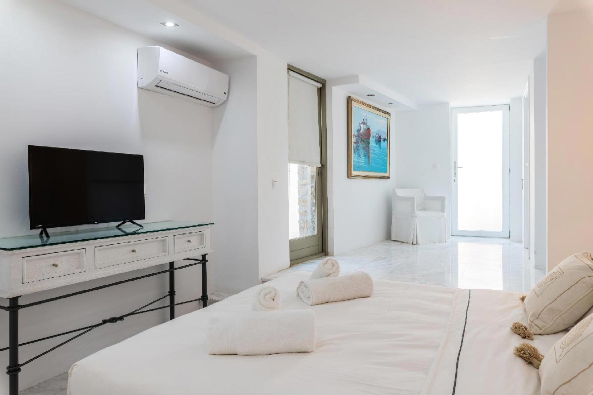 • 1 ensuite bedroom 22,4 m2. Access to the upstairs balcony. Seating area for 2 people. Northwest direction with View to Delos Island and the Aegean Sea, while the room offers unique sunset views. The room has a Queen Size bed with 4 pillows. The room is equipped with a TV 32’, hairdryer, air conditioning, toiletries and towels.