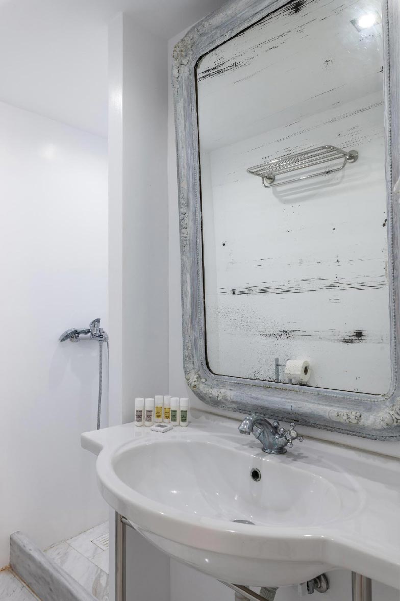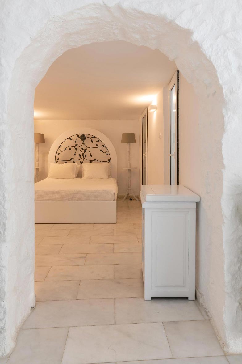 • 1 ensuite bedroom 24,6 m2. Access to the upstairs balcony. Seating area for 2 people. Northwest direction with View to Delos Island and the Aegean Sea, while the room offers unique sunset views. The room has an open bathroom with bathtub 1 Queen Size bed with 4 pillows. The room is equipped with a TV 32’, hairdryer, air conditioning, toiletries, and towels.