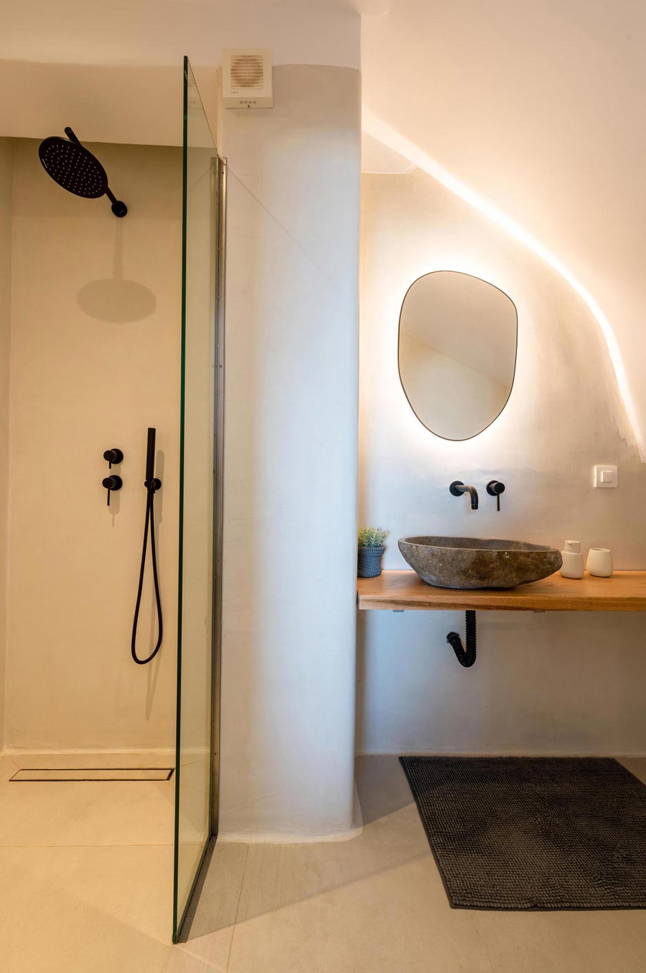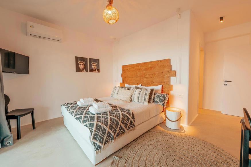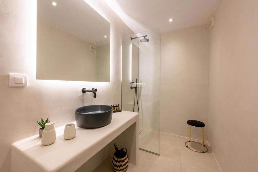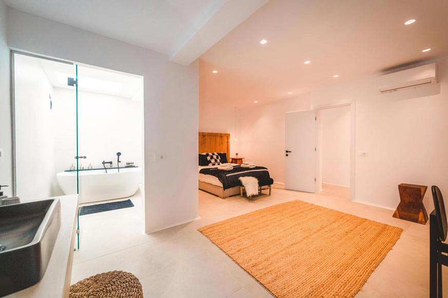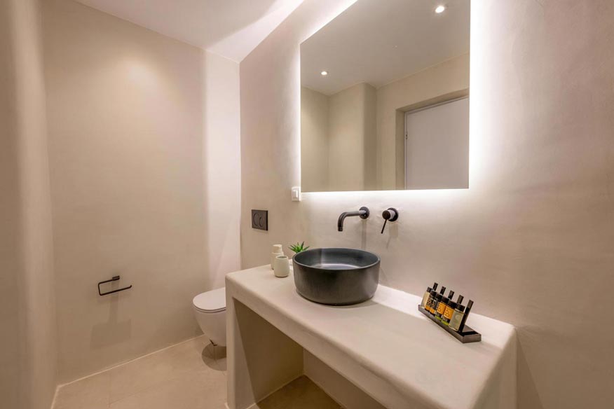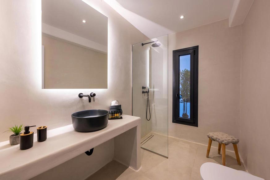 In the outdoor area, where the swimming pool dominates, there luxurious sunbeds, hanging swings, hammock, next to olive trees, with endless view of the Aegean blue waters, offering relaxation and well being. Also, in the same area, there are under the wooden pergola, a BBQ, a wood burning oven, a large dining table, an outdoor shower and WC.