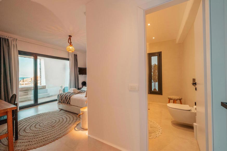 On the first level we find a fully equipped kitchen , a large dining table, a living room with TV Smart and Bluetooth audio system, all placed with a view of the sea. Moreover, on the same level, there is a WC and a balcony with view to the swimming pool and to the sea.