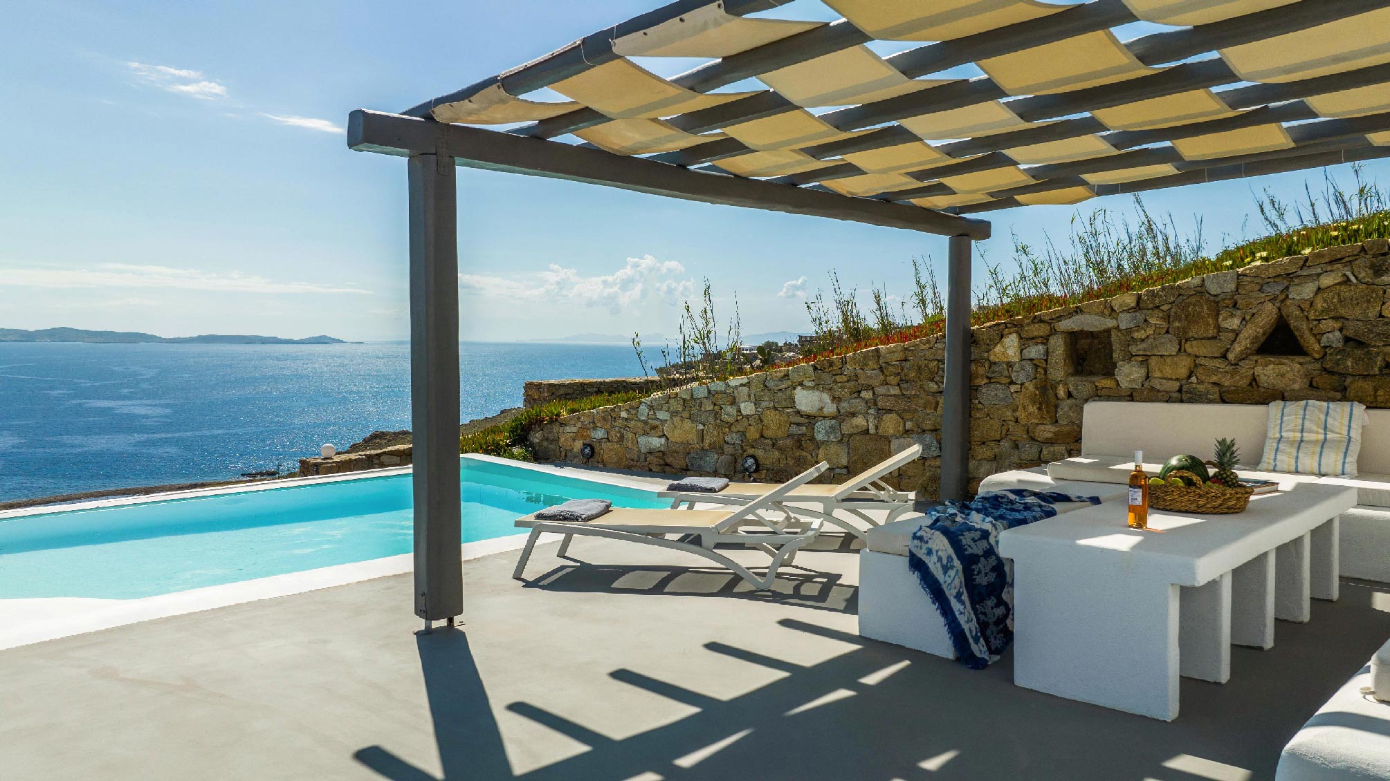 Influenced by a traditional tone, this cozy villa is the perfect gateway for families, couples or small group gatherings who want to combine tranquillity while being very close to the cosmopolitan Mykonos Chora. The villa consists of two levels, three bedrooms, a spacious living room and kitchen, and a lovely exterior space with a private pool and unique sunset views.