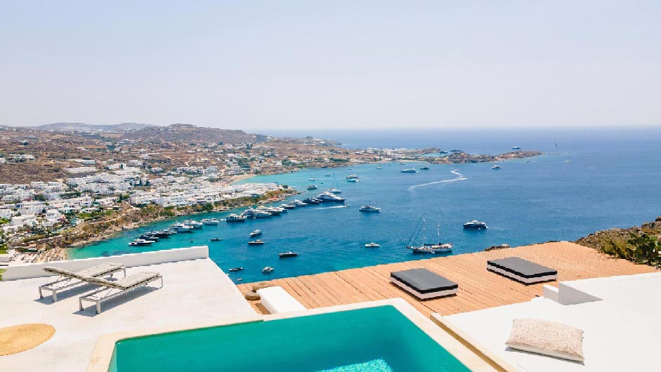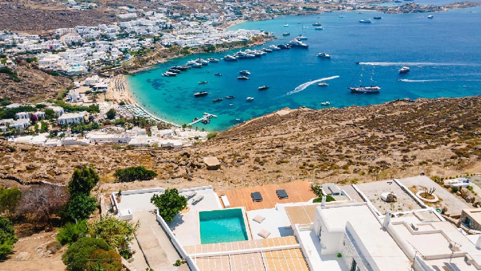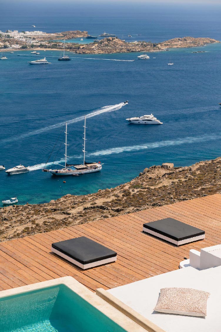 Set above Nammos, the villa shares the experience of the most cosmo-chic and wind protected part of Mykonos, Psarou bay and Nammos village. As a guest you are part of an energetic setting every night and day: fireworks, glamorous boats, turquoise waters, fantastic parties.