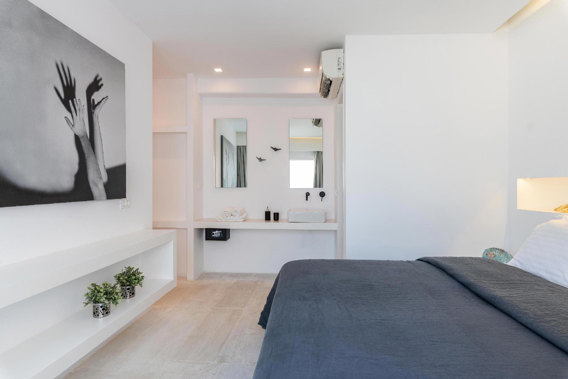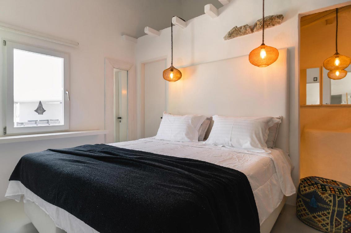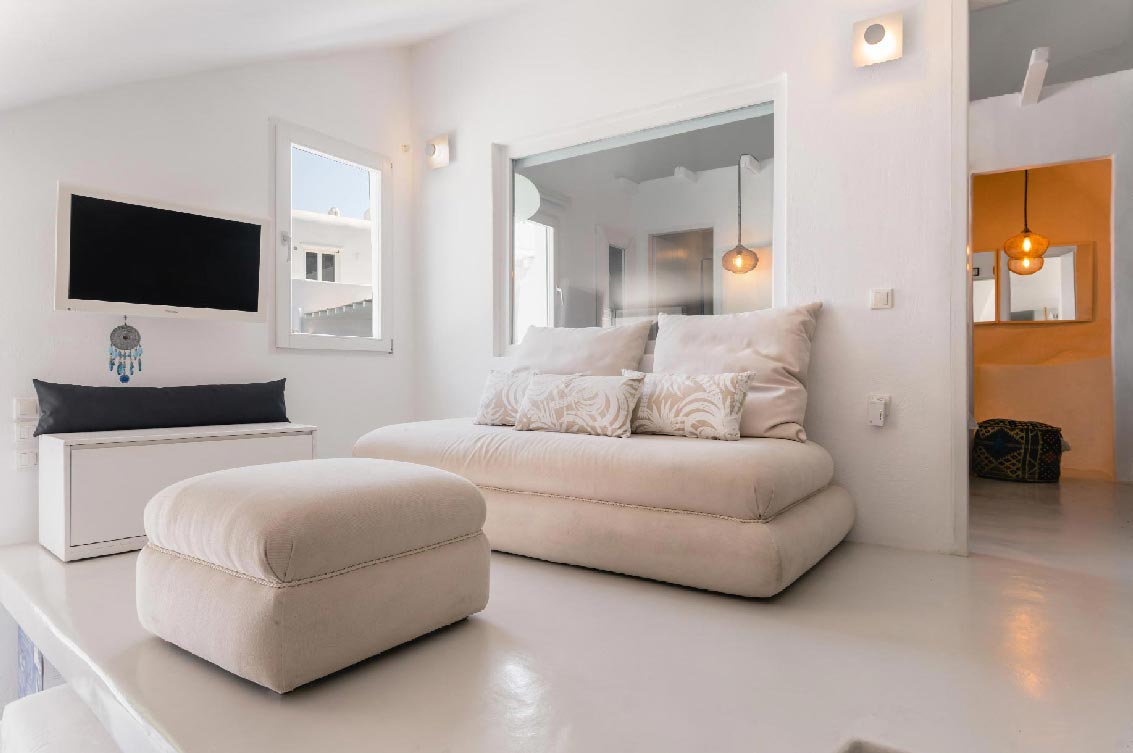 All three rooms exit to a veranda that offers a splendid view of the Aegean Sea, Psarou beach and islands at a distance