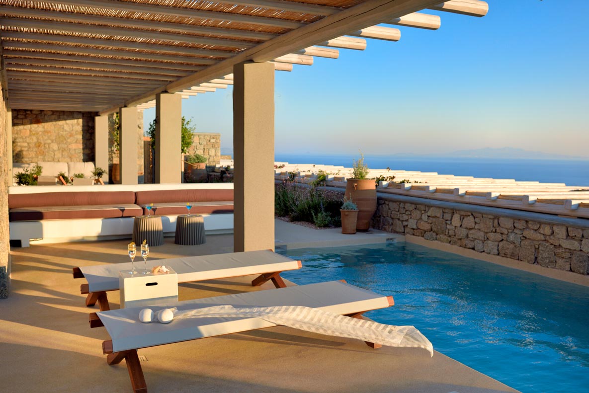 Luxurious private pool with jets. Party in the glamorous splendor of your palatial outdoor dining and lounge areas where under star-lit skies you will dance to dawn while making Mykonos summer memories that will never fade.