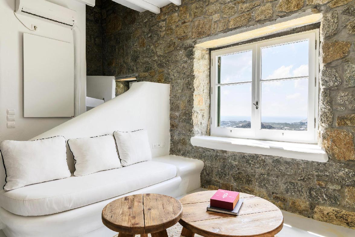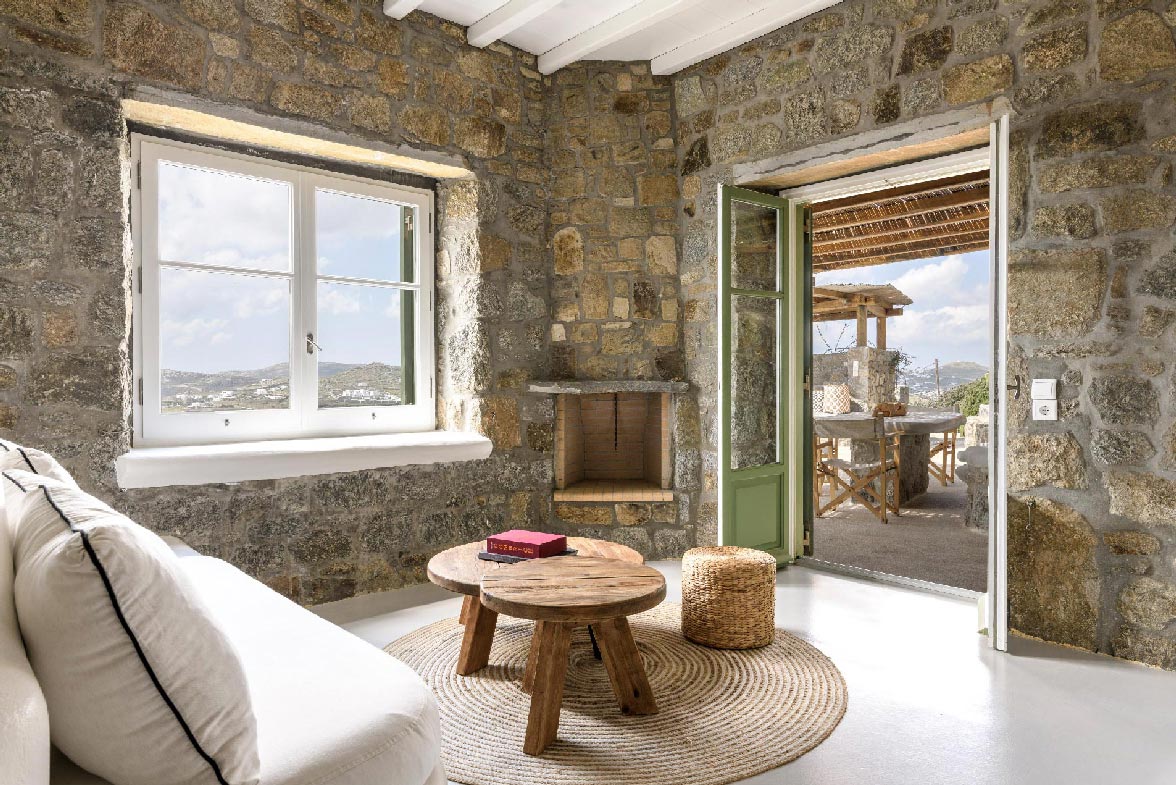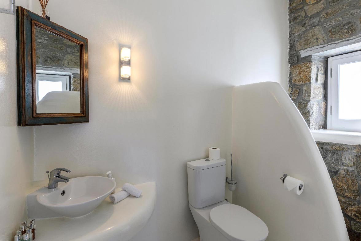 The property is a three-bedroom 134m2 villa, sleeping comfortably up to 6 guests. On the entrance floor there is an open plan kitchen and a living room with a fireplace while, on the upper floor there are two double en suite bedrooms. The guest house with the independent entrance can be found in the garden area. The outdoor area offers two unique sitting areas with a view of the Aegean Sea.Villa Niobe is about 5’ drive from the closest local market which is located in Ano Mera village. Mykonos town is approximately 15’ drive while, in maximum 20’ drive you can reach the farthest beach.