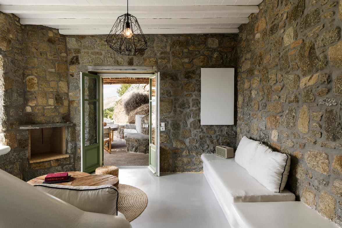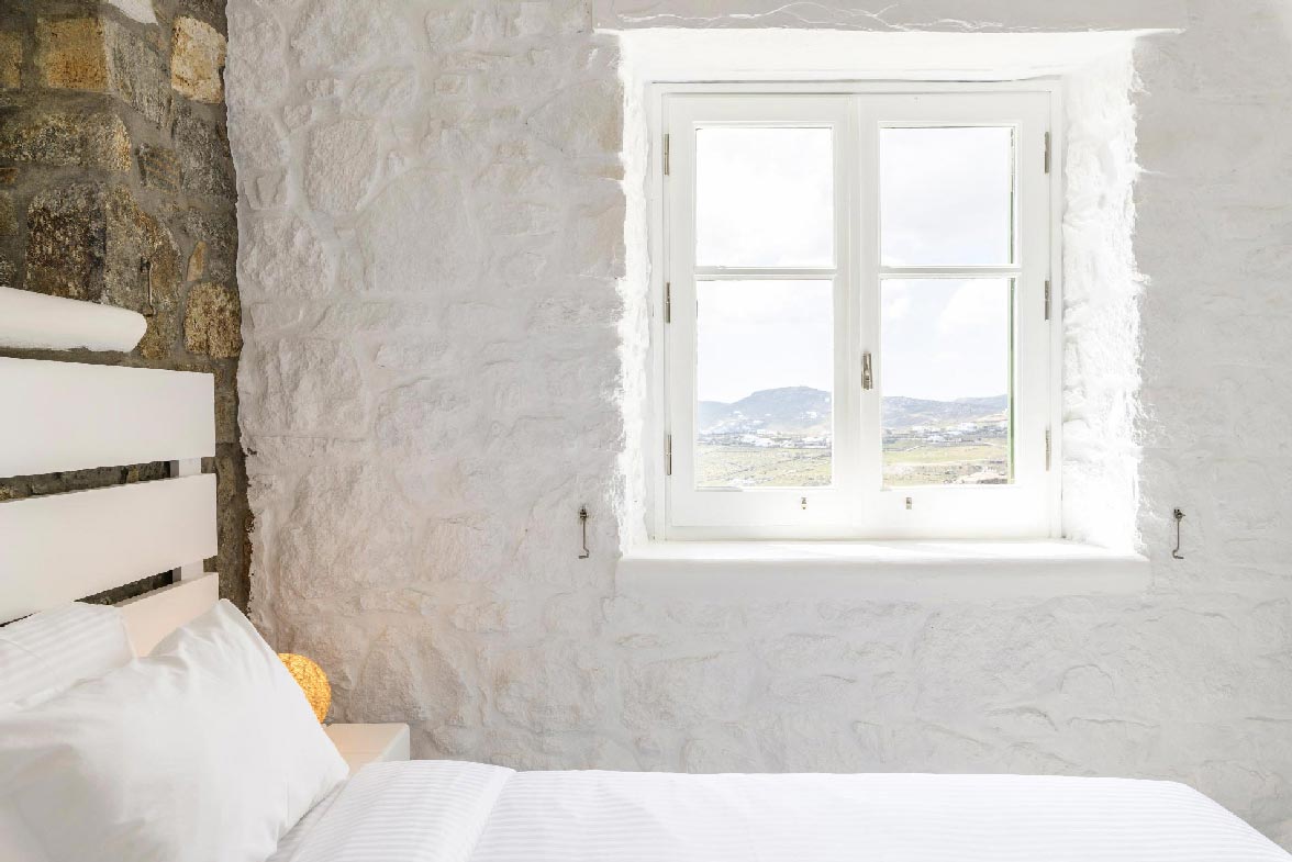 Villa Evania located in the southeastern part of Mykonos, very close to the famous beach of Kalafatis, this unique property basks in the Aegean sun and light. The villa has been built combining minimalistic whitewashed Cycladic elements and impressive dry-stone walls, while is decorated with great respect to the natural landscape