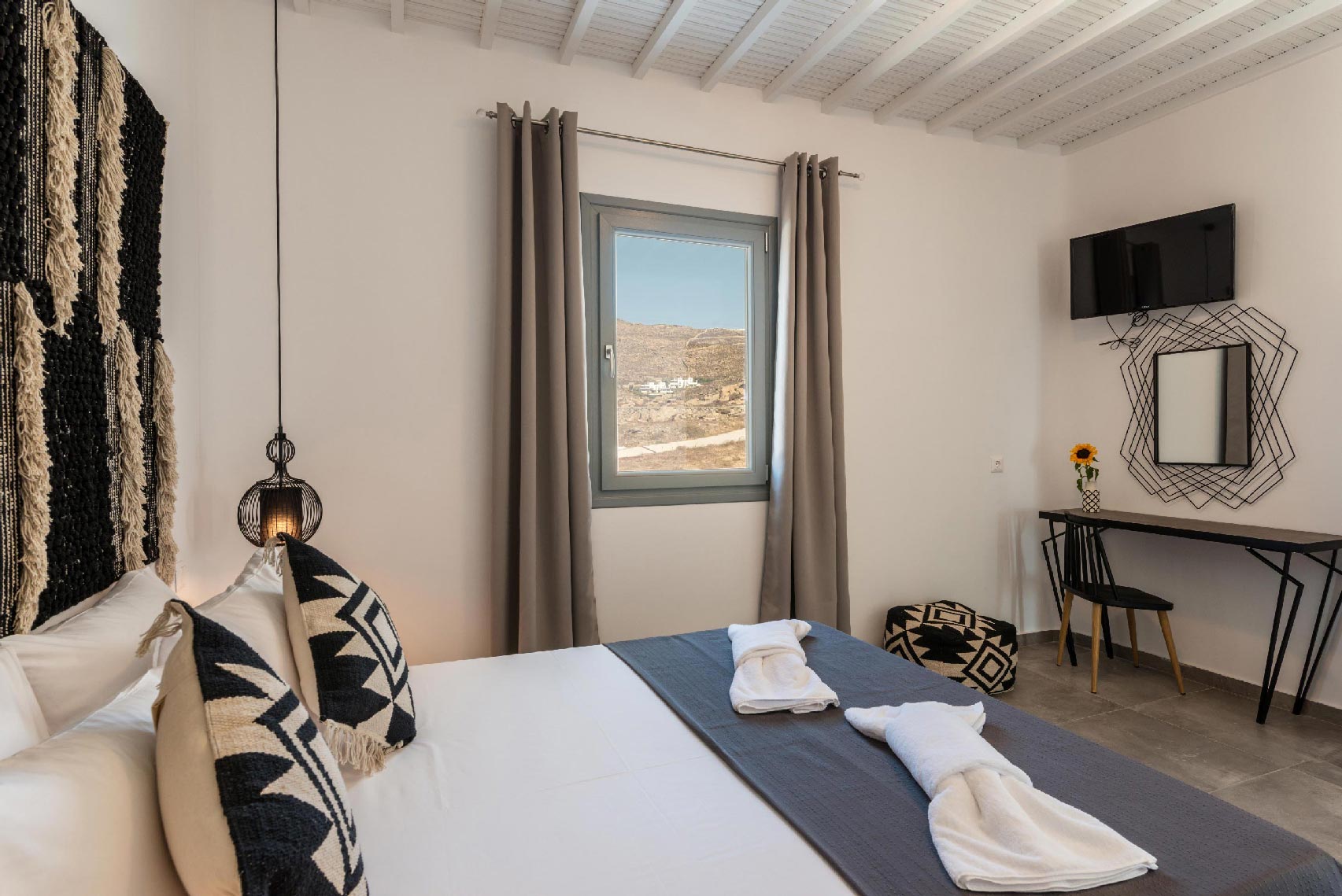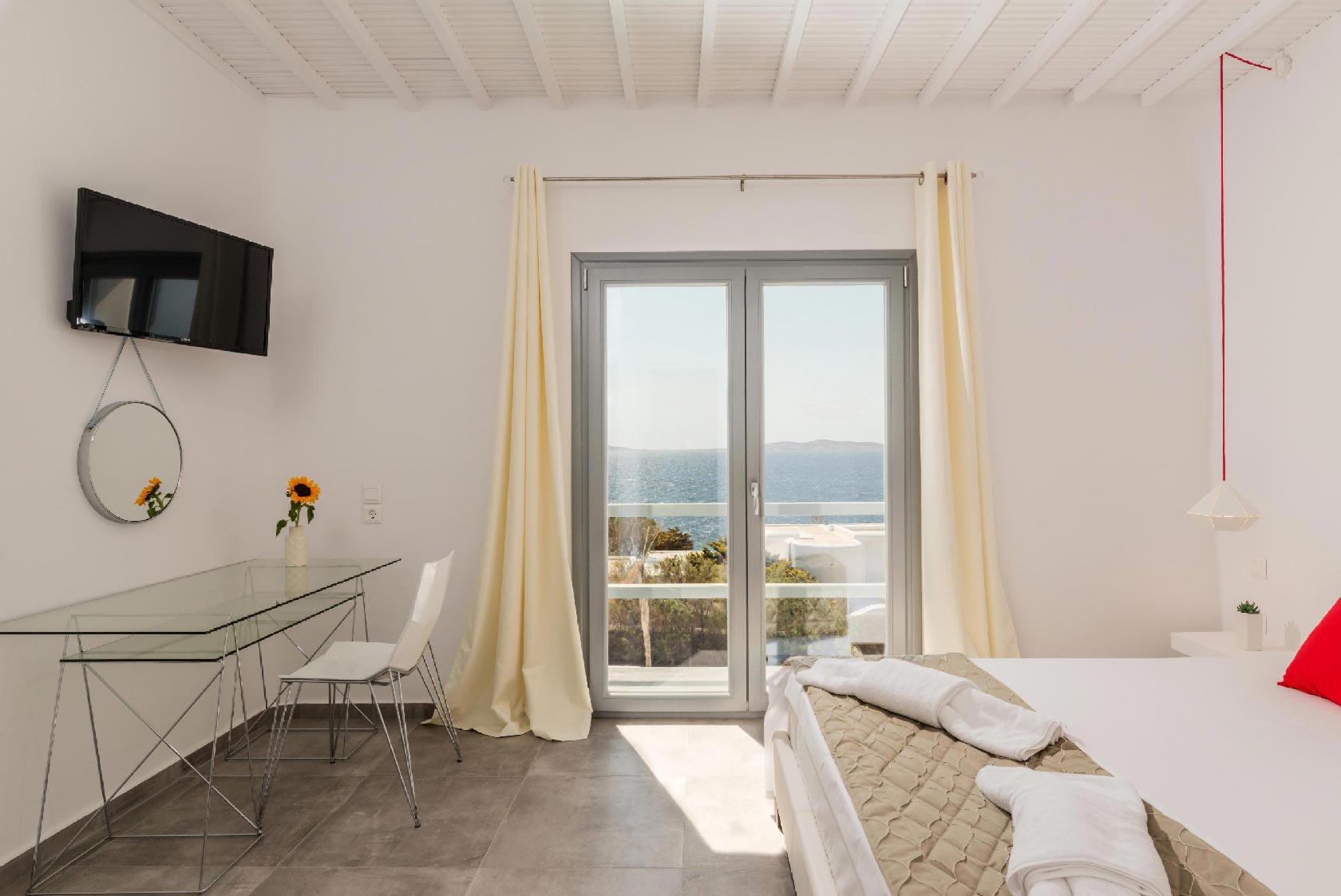 On the same level, there are two double bedrooms with 1 bathroom. The rooms are fully equipped with, a TV, Air conditioning, Safe Box, and closet. The one bedroom has a view to the back yard and the other one has sea & pool view.