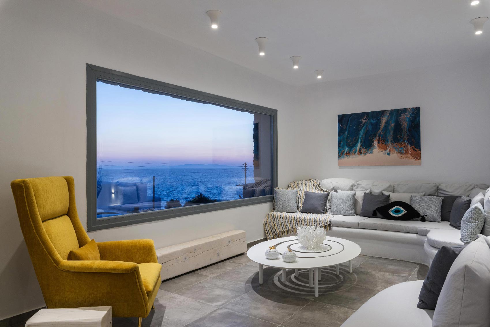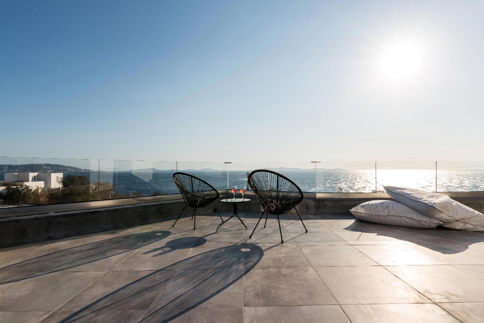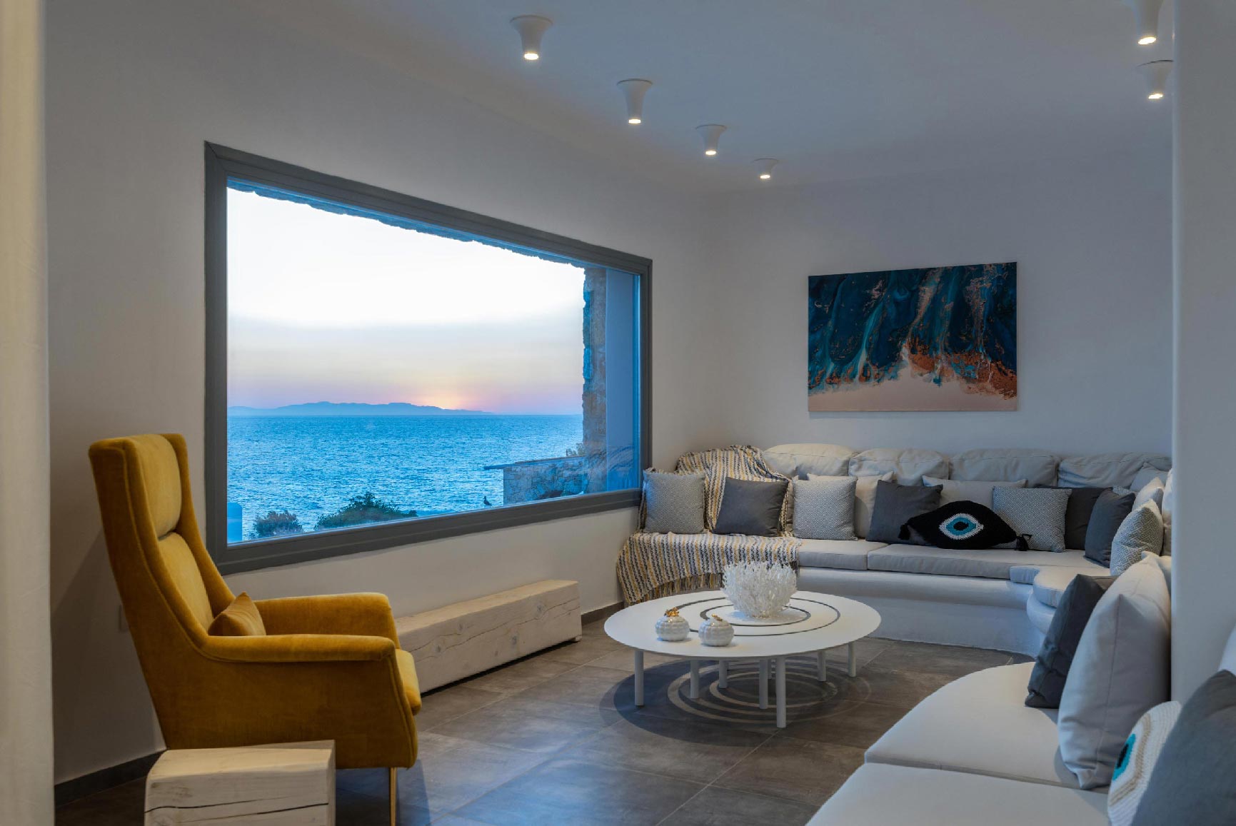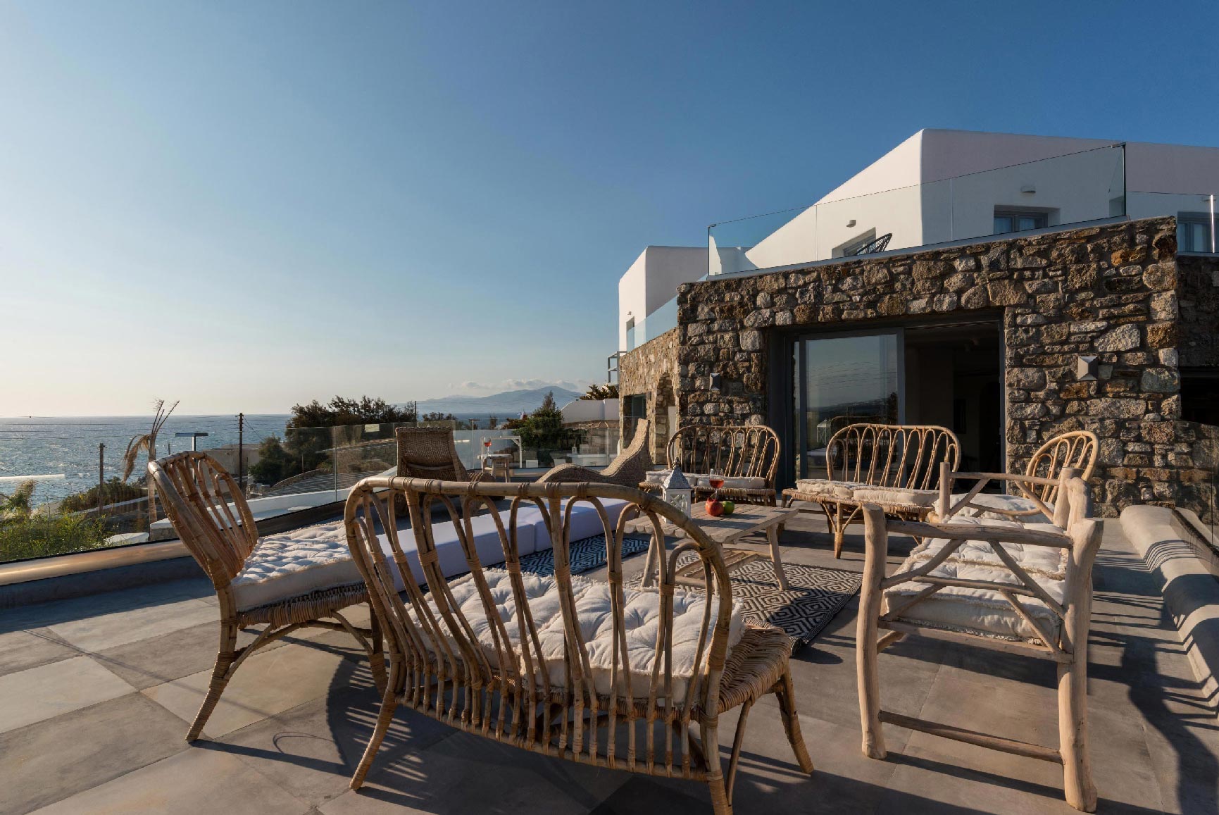 The villa is located at the Agios Stefanos area of Mykonos offering sunset and sea views. The villa consists of 7 fully equipped bedrooms with 6 bathrooms that may accommodate up to 14 guests. The interiors follow the white minimalist design with white surfaces and modern facilities.The exterior lounge and pool areas feature private pool with a sunset view, outdoors furniture and BBQ facilities.