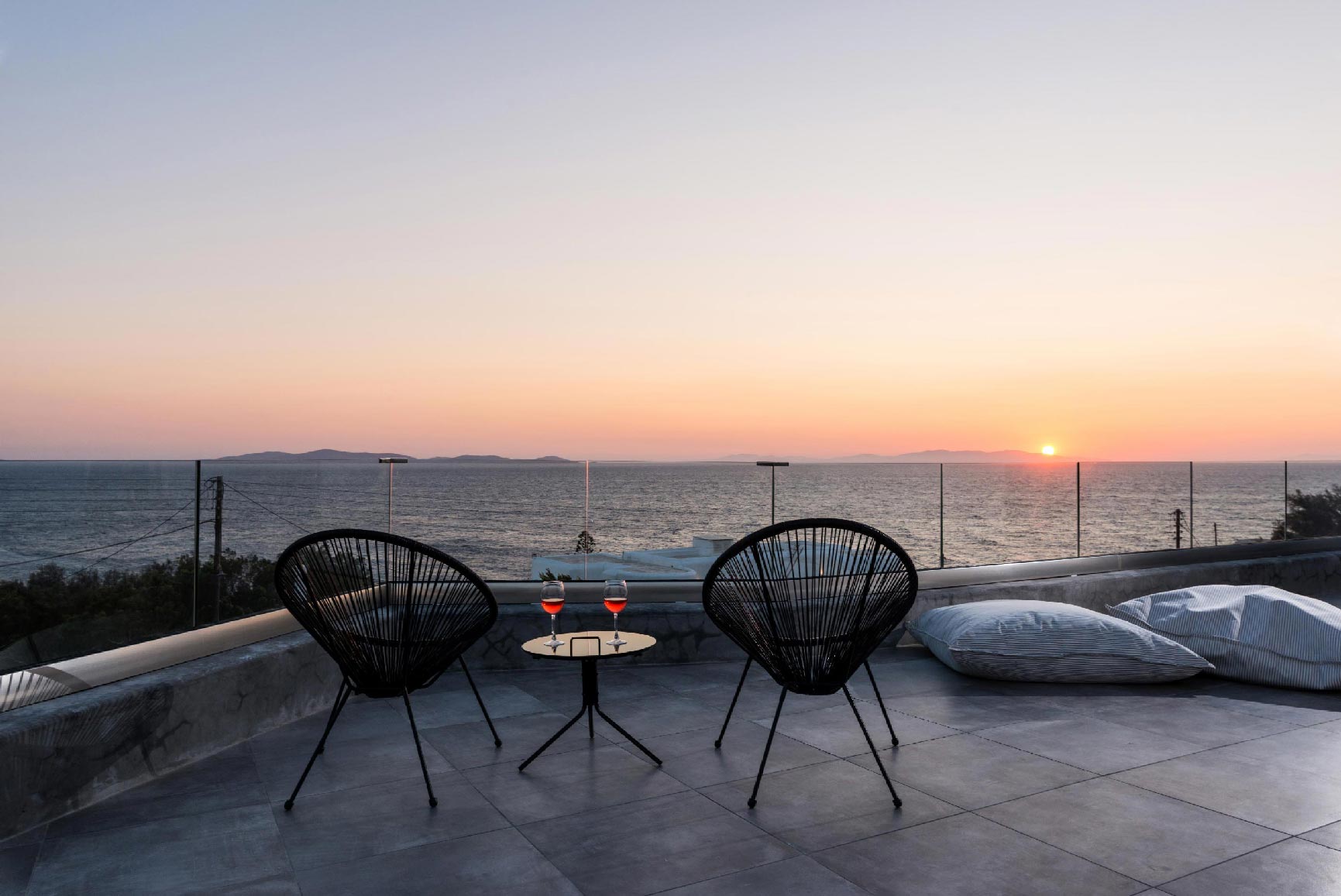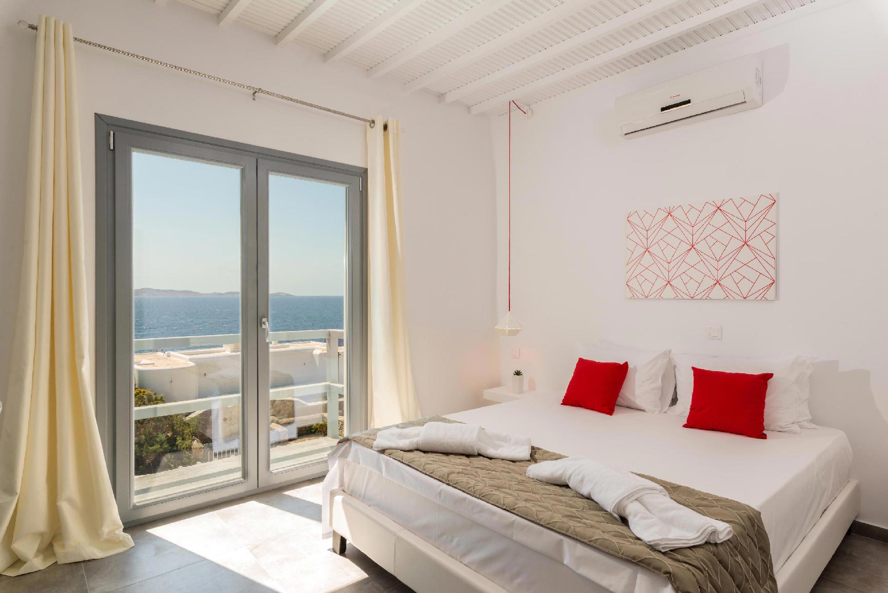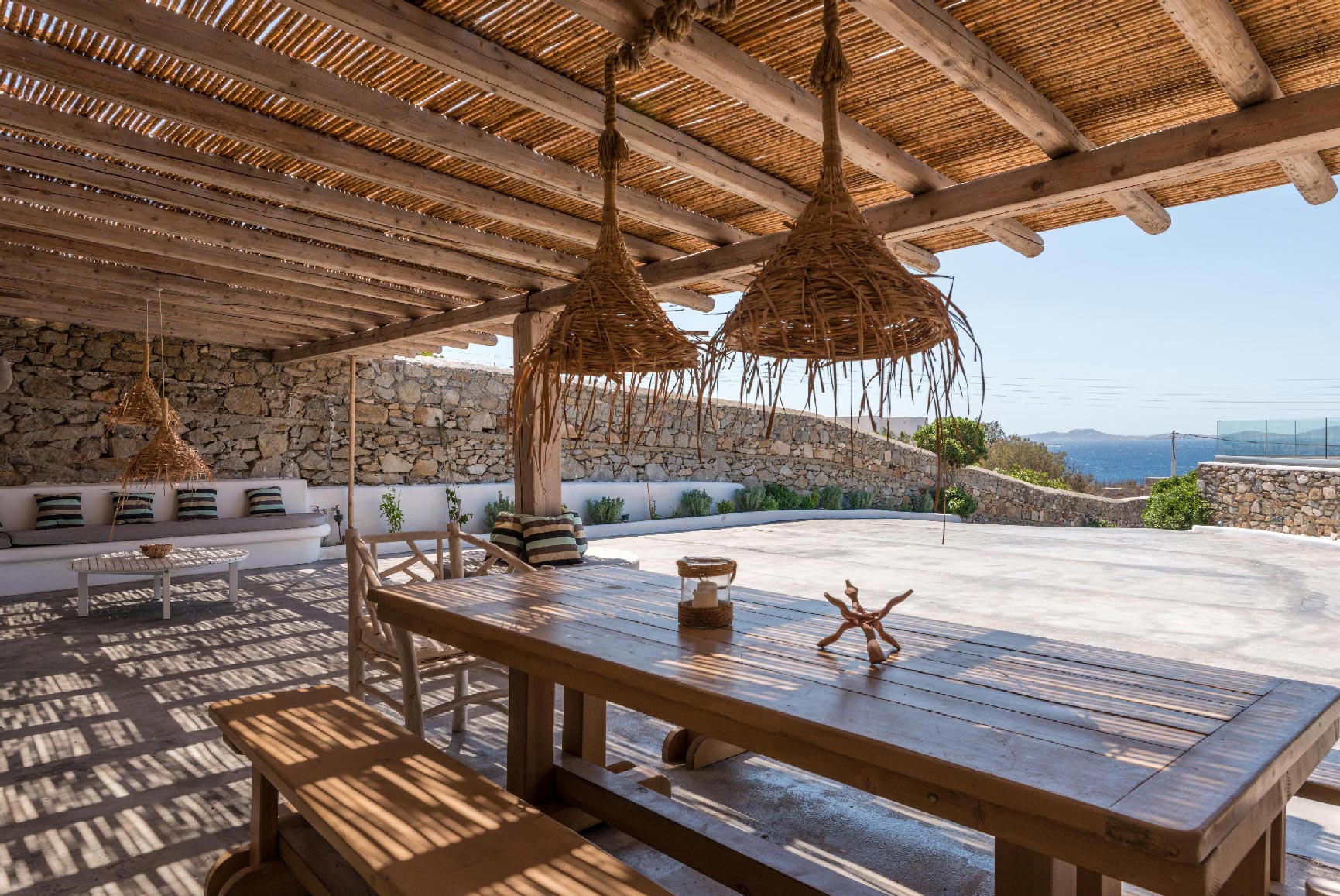 The villa is located at the Agios Stefanos area of Mykonos offering sunset and sea views. The villa consists of 7 fully equipped bedrooms with 6 bathrooms that may accommodate up to 14 guests. The interiors follow the white minimalist design with white surfaces and modern facilities.The exterior lounge and pool areas feature private pool with a sunset view, outdoors furniture and BBQ facilities.