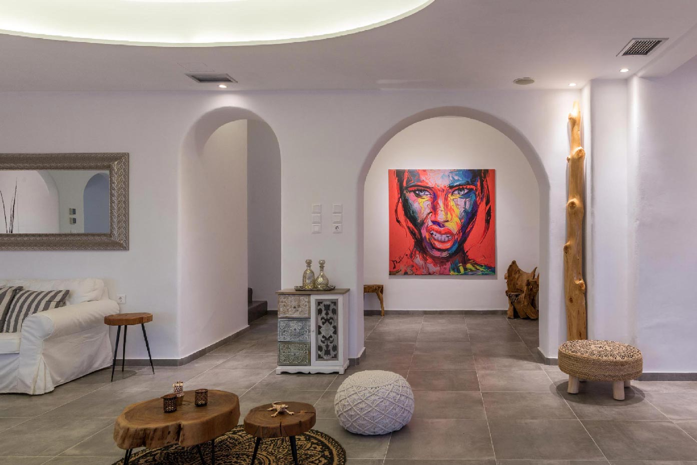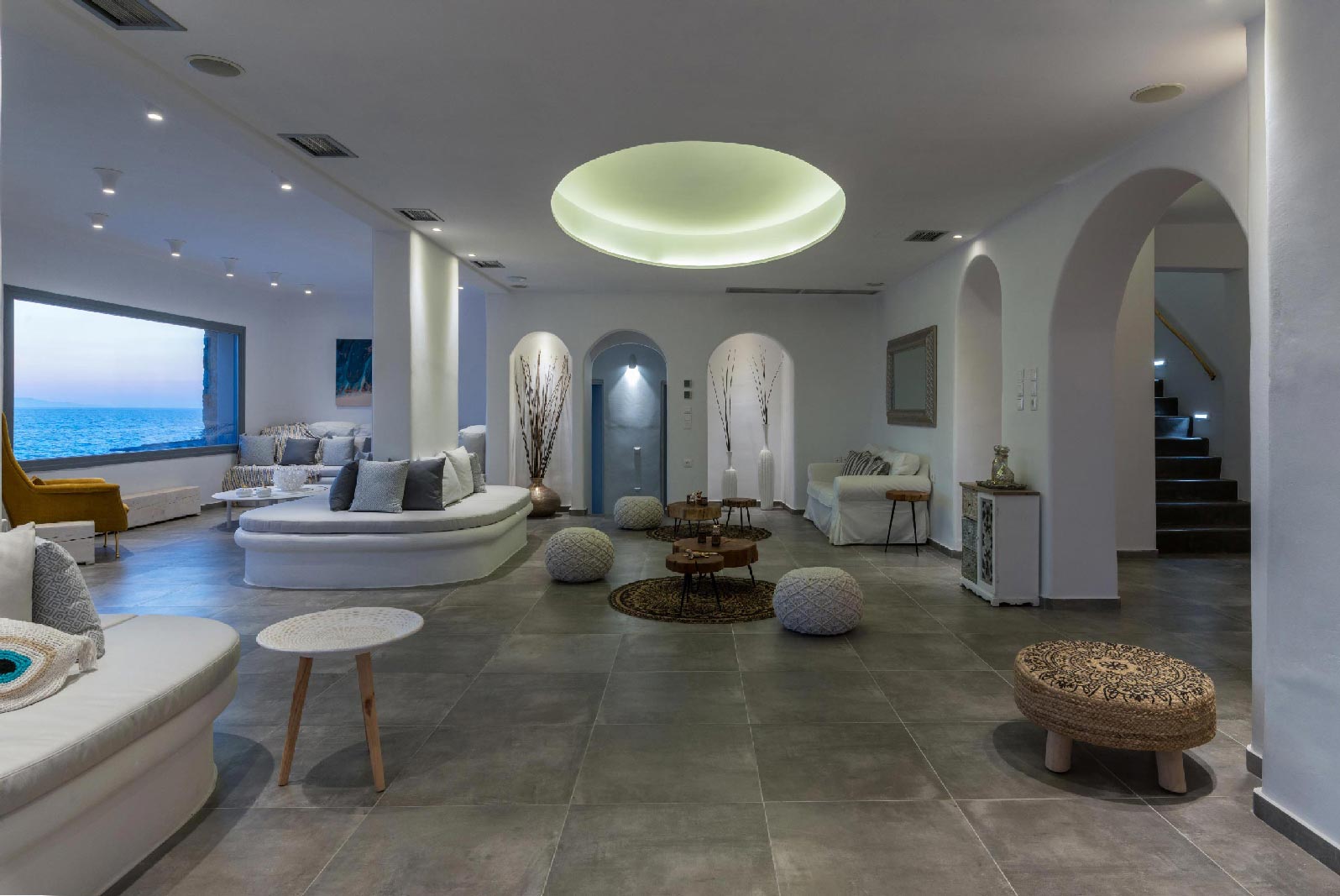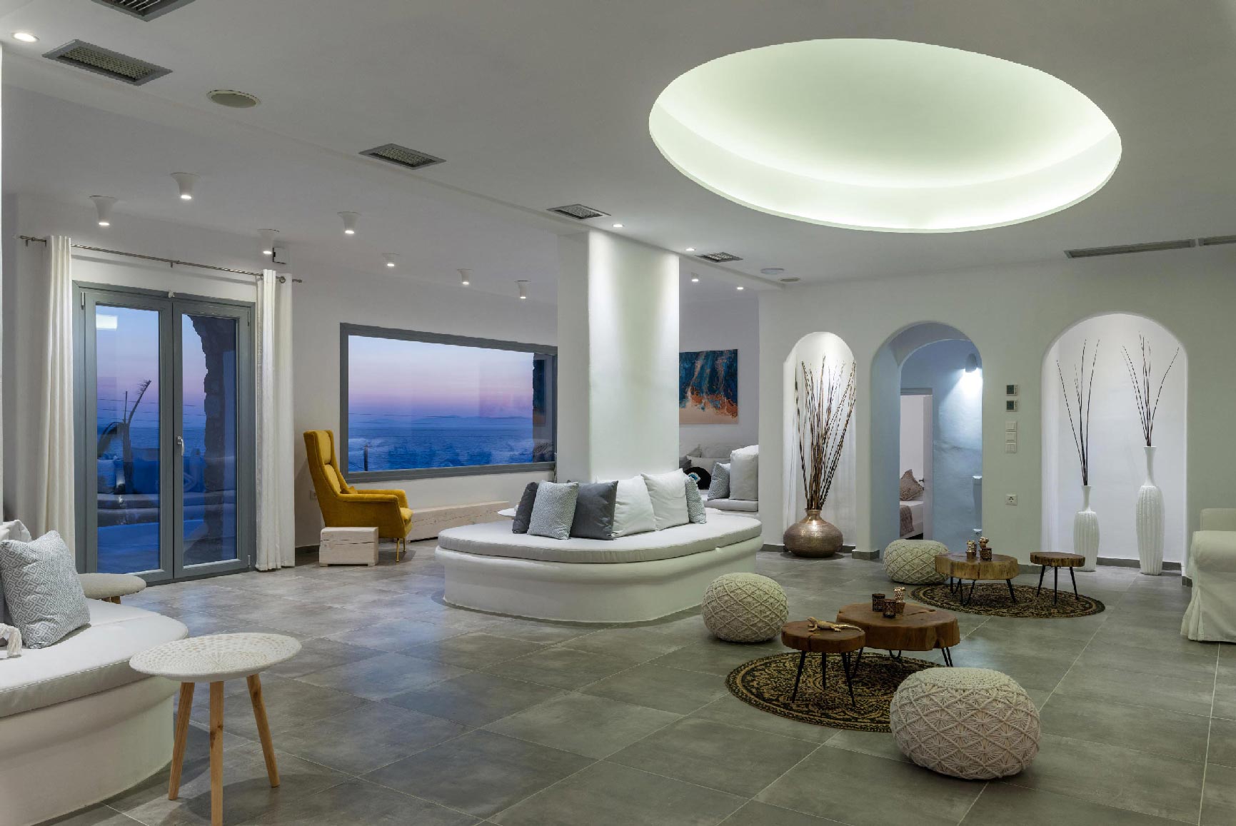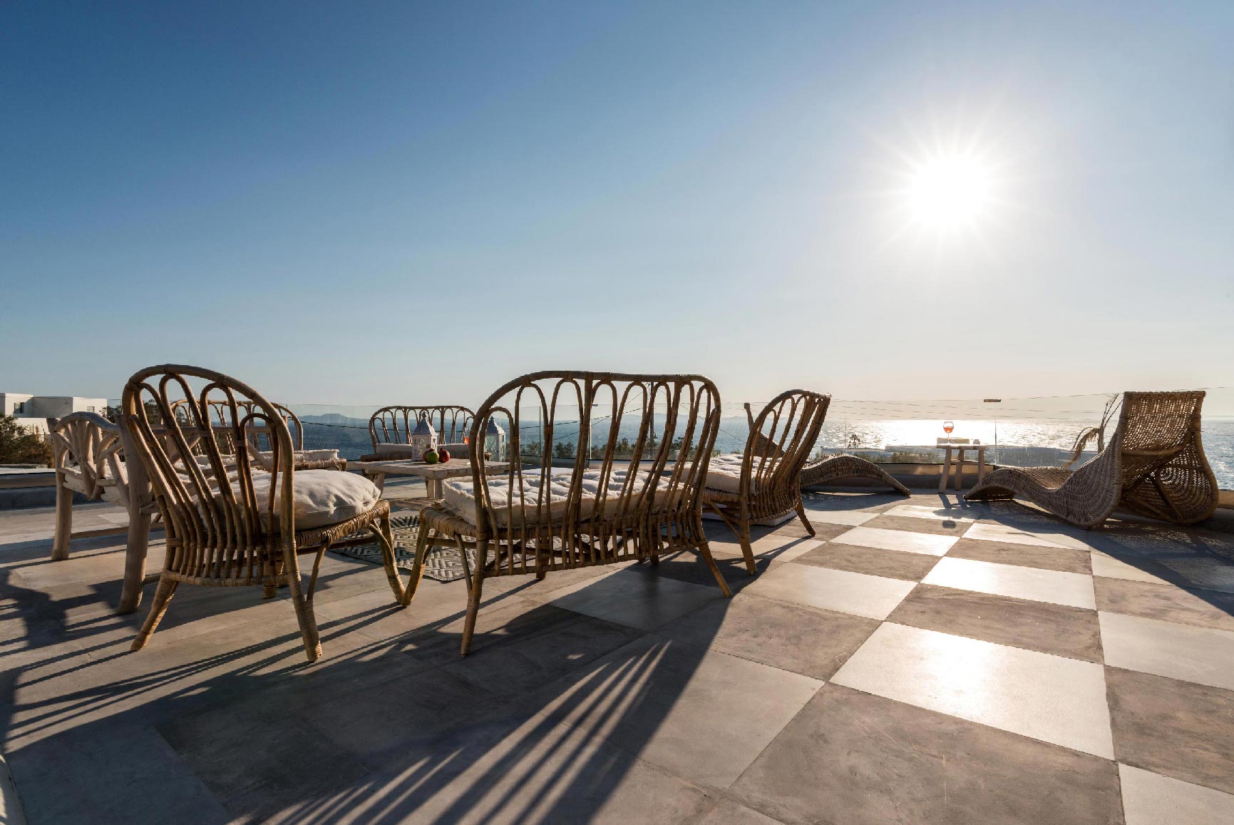 The villa is located at the Agios Stefanos area of Mykonos offering sunset and sea views. The villa consists of 7 fully equipped bedrooms with 6 bathrooms that may accommodate up to 14 guests. The interiors follow the white minimalist design with white surfaces and modern facilities.The exterior lounge and pool areas feature private pool with a sunset view, outdoors furniture and BBQ facilities.