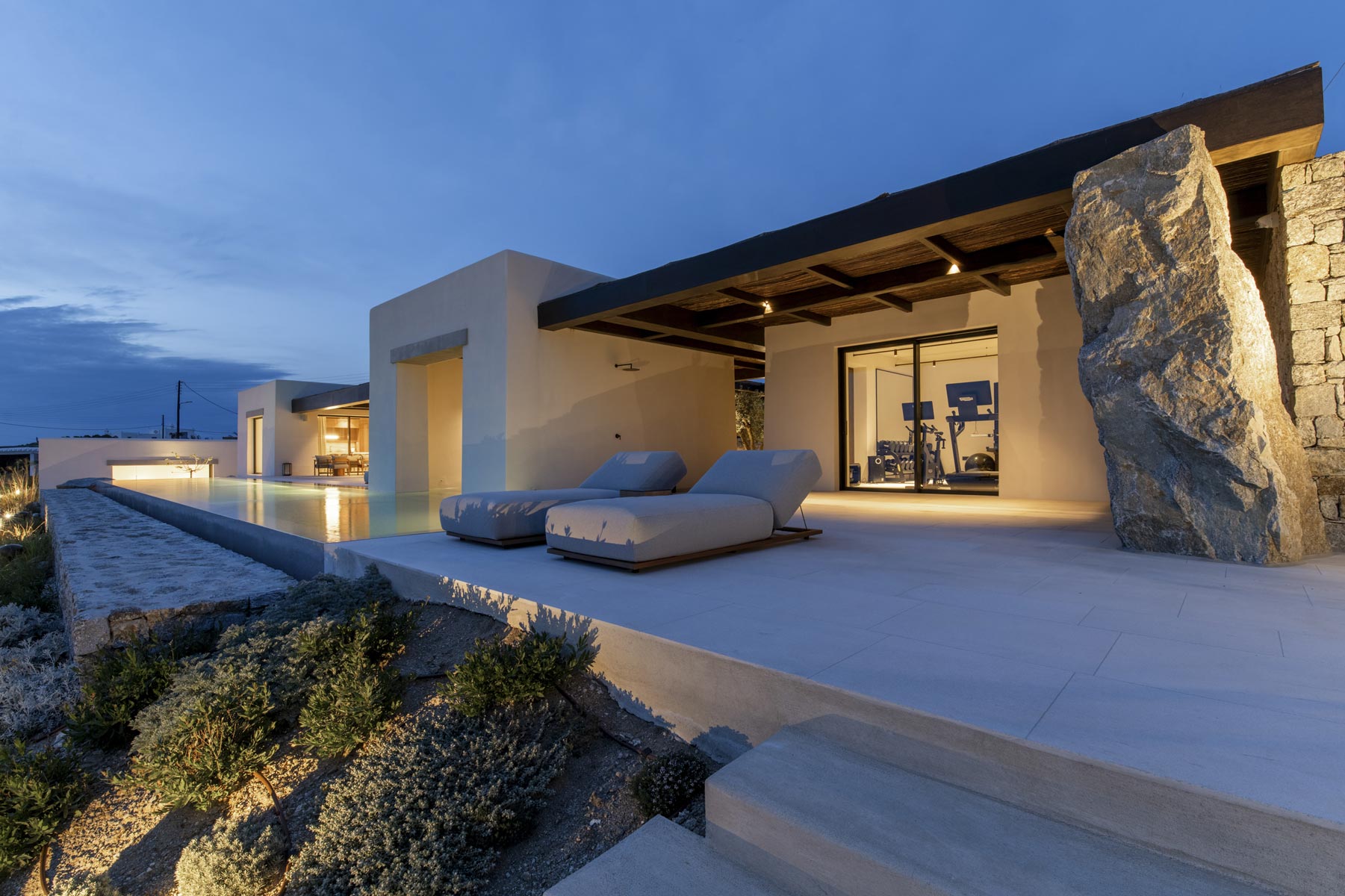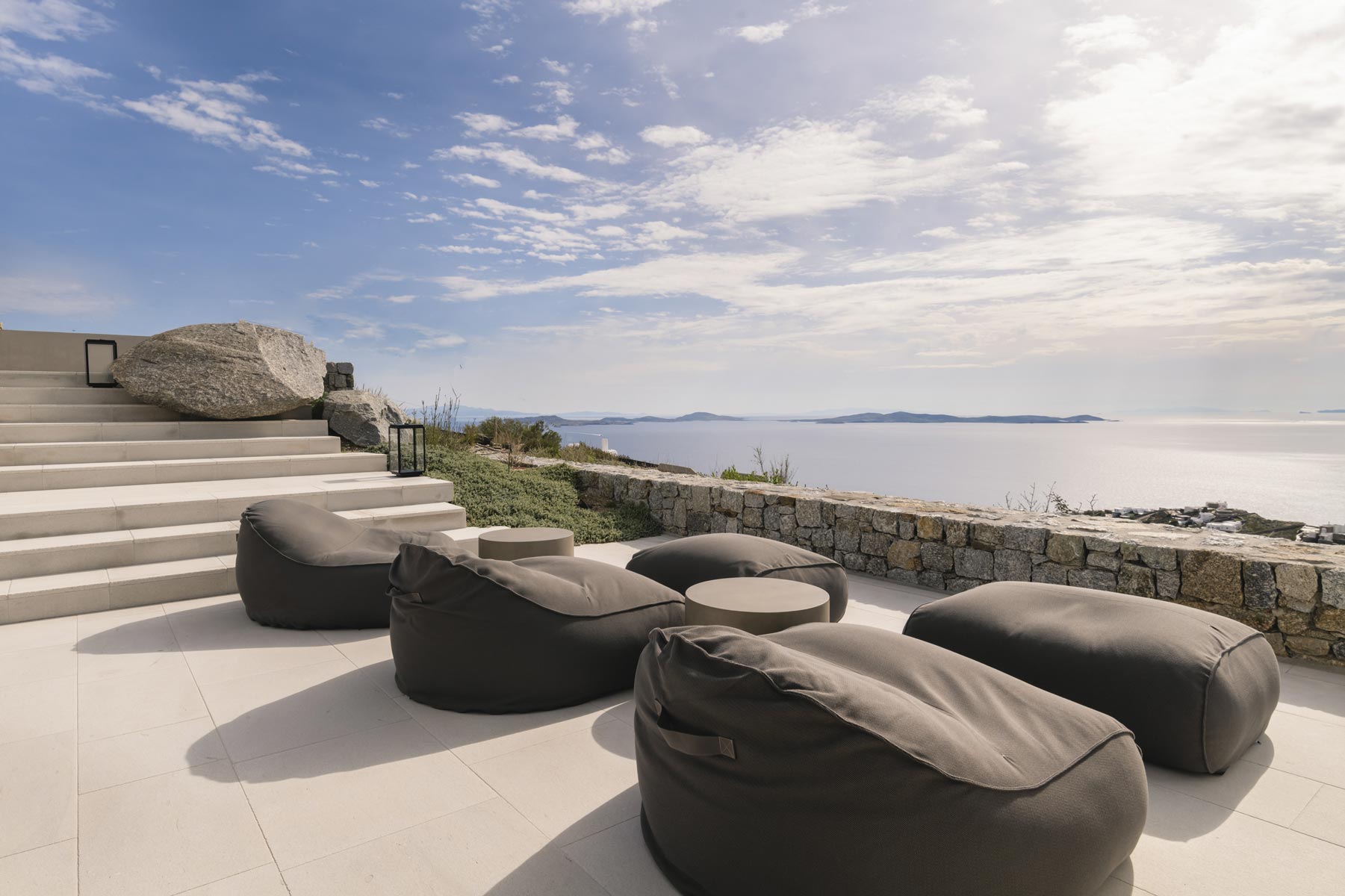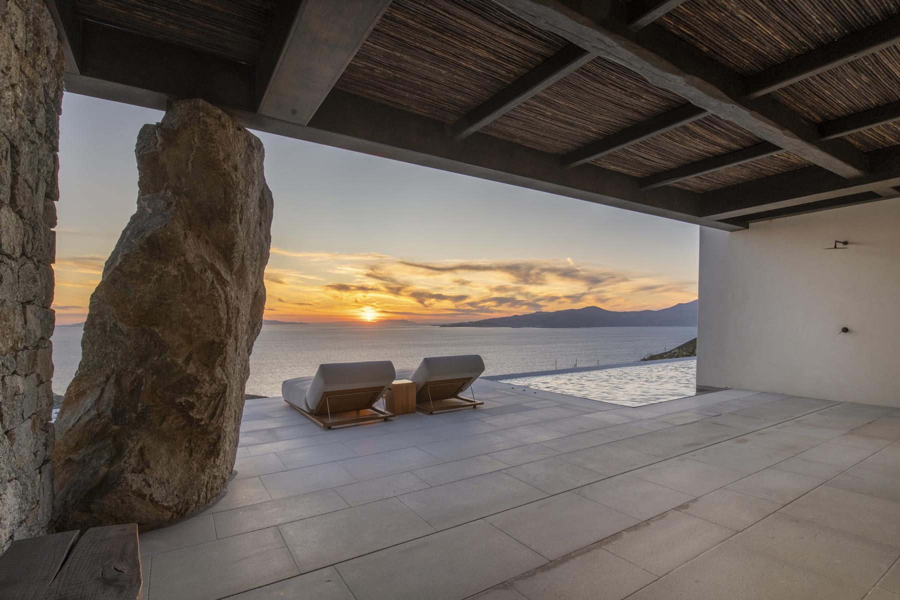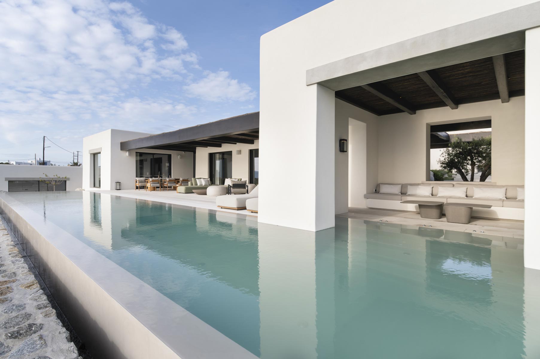 The villa’s main level features a fully equipped kitchen with direct access to the outdoor dining space, an elegant living room with views toward Delos, a professional-grade chef’s kitchen, and a guest WC. An impressive 94 m² infinity pool overlooks the sea, flanked by furnished terraces, a shaded pergola lounge, and multiple al fresco dining zones.