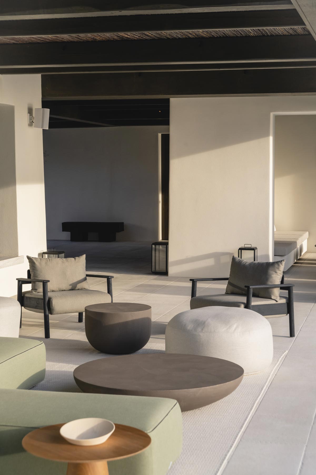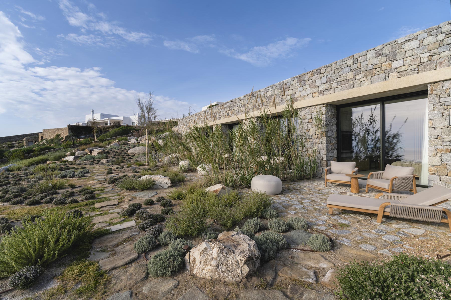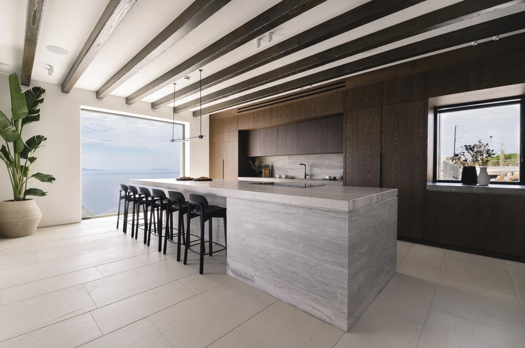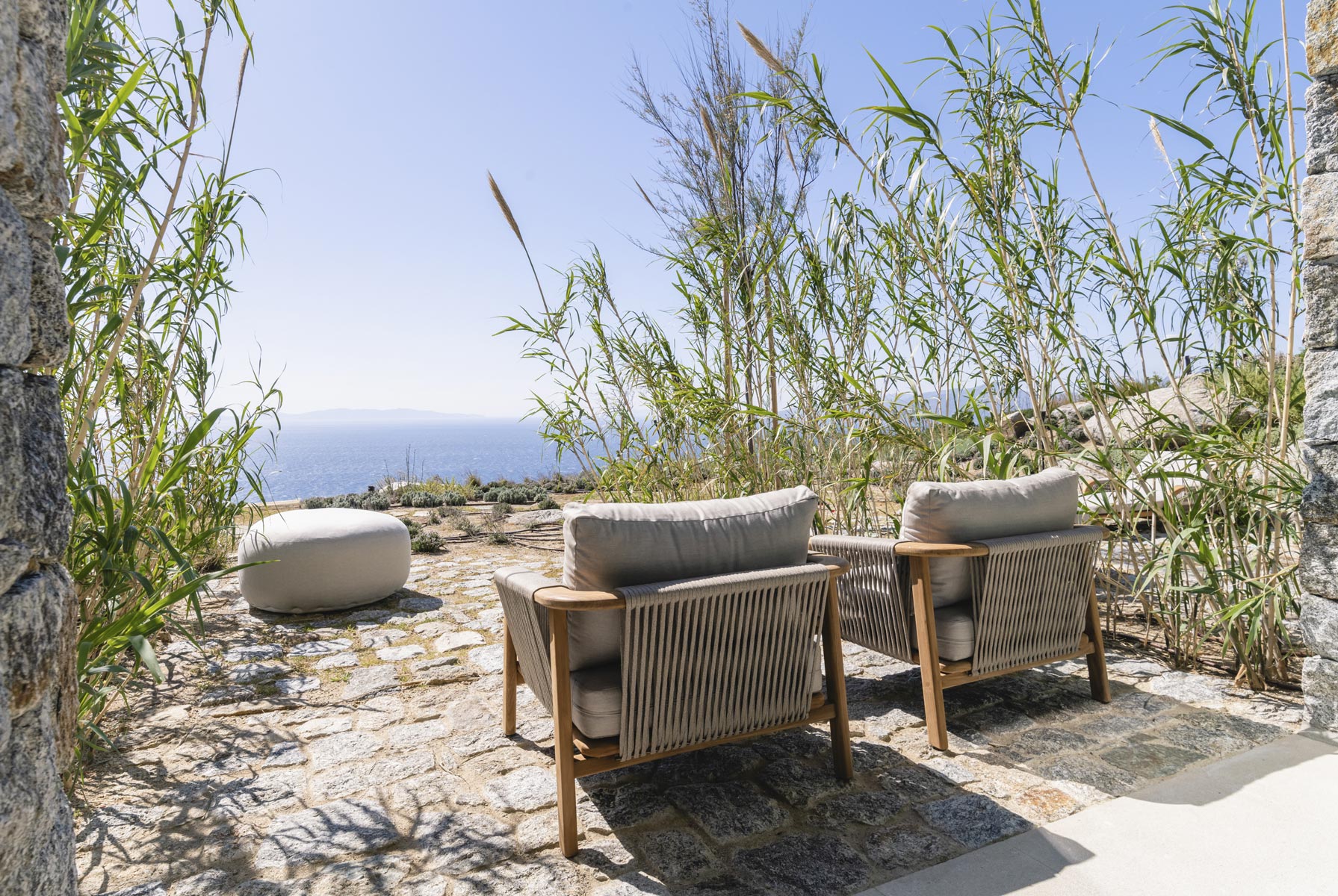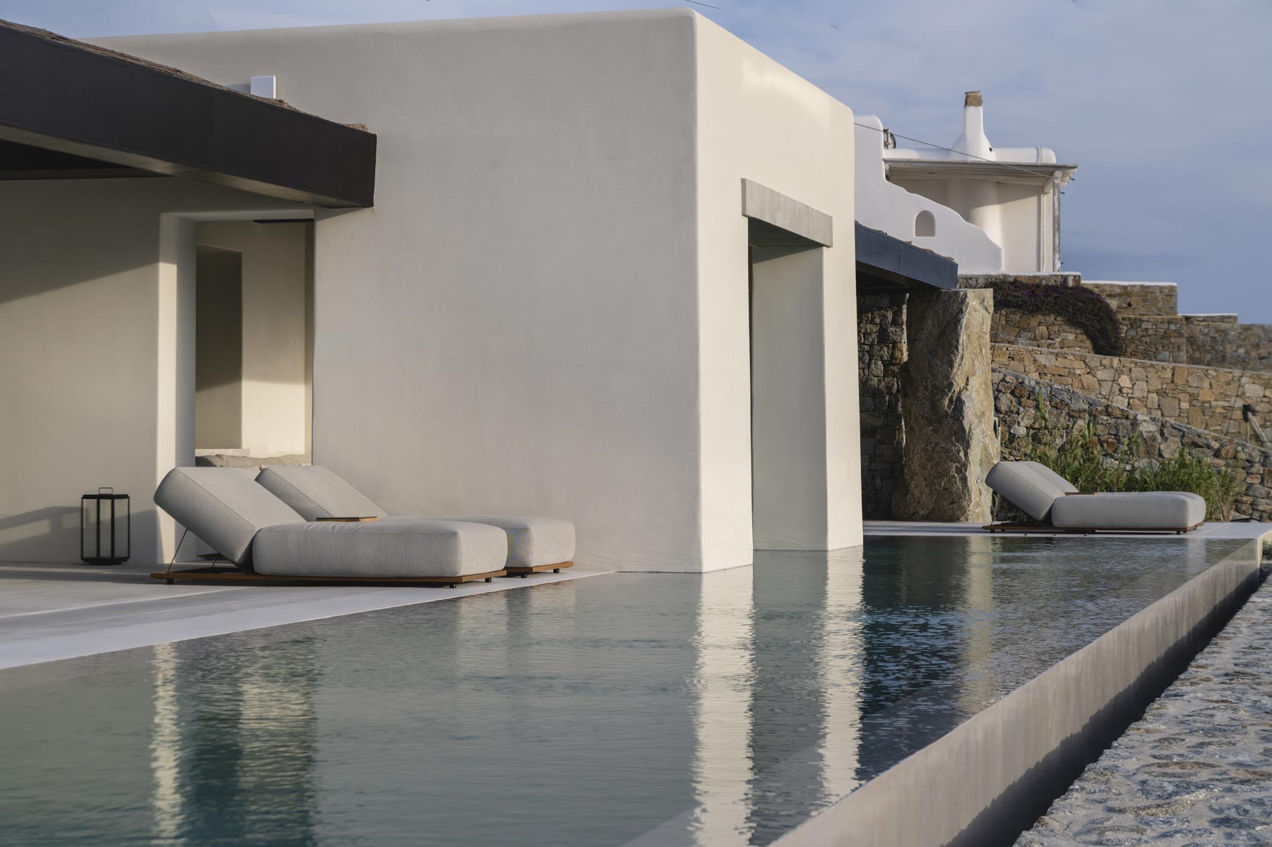 The villa’s main level features a fully equipped kitchen with direct access to the outdoor dining space, an elegant living room with views toward Delos, a professional-grade chef’s kitchen, and a guest WC. An impressive 94 m² infinity pool overlooks the sea, flanked by furnished terraces, a shaded pergola lounge, and multiple al fresco dining zones.