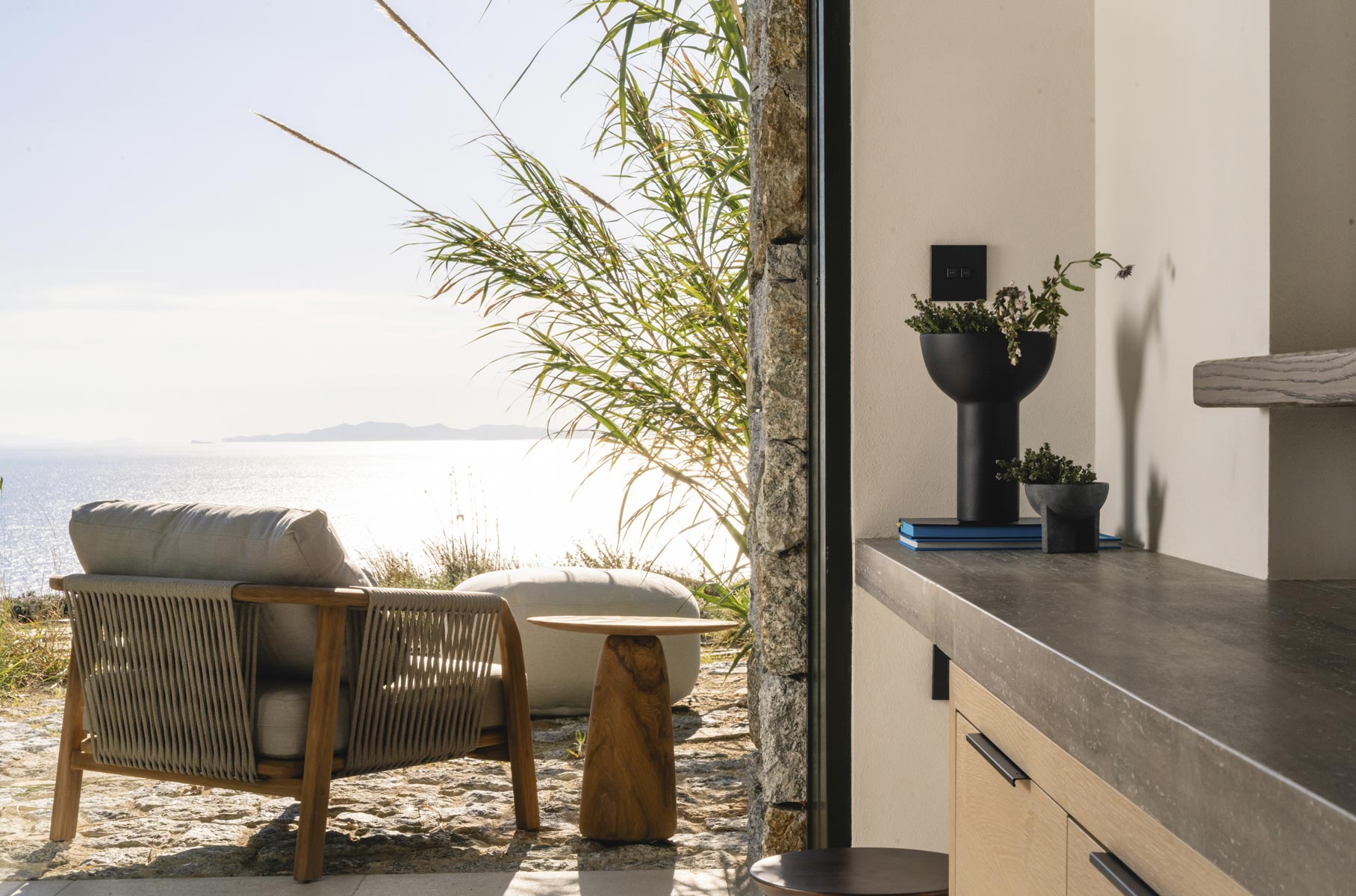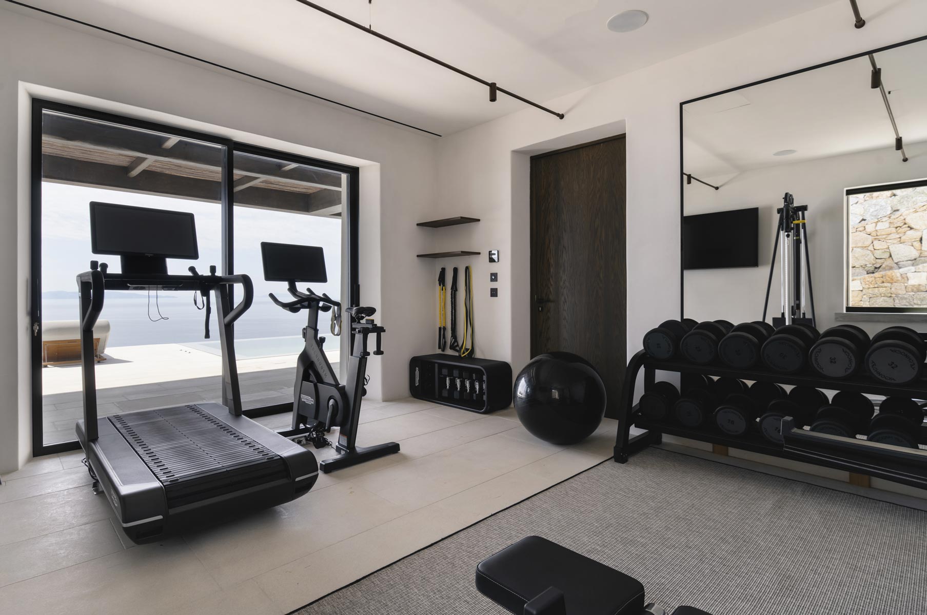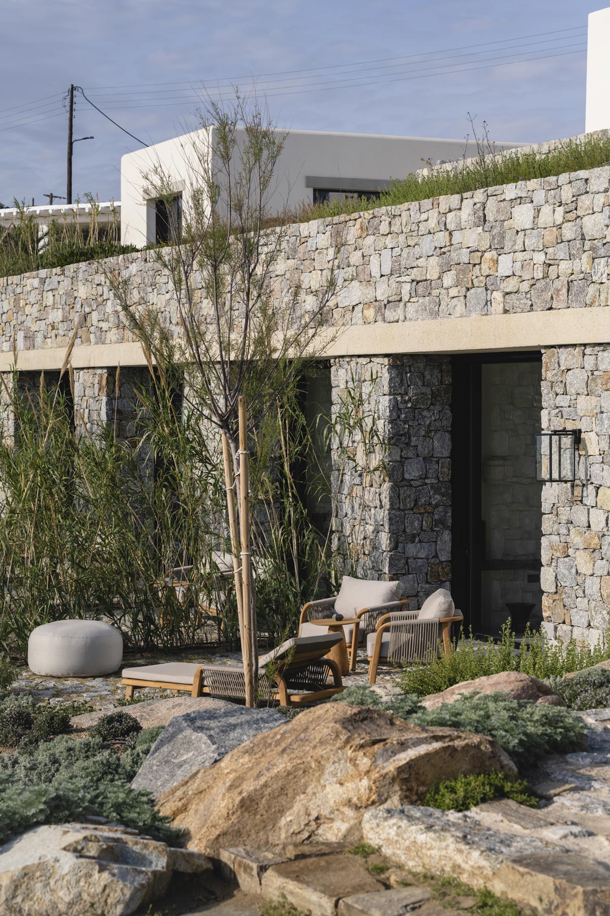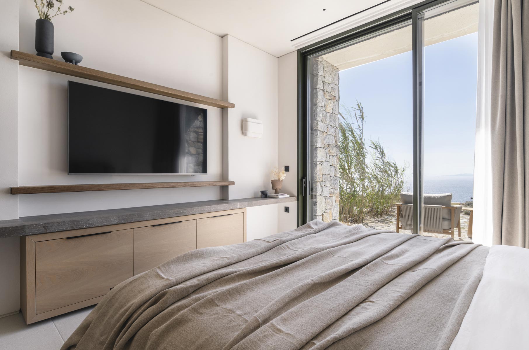 The villa’s main level features a fully equipped kitchen with direct access to the outdoor dining space, an elegant living room with views toward Delos, a professional-grade chef’s kitchen, and a guest WC. An impressive 94 m² infinity pool overlooks the sea, flanked by furnished terraces, a shaded pergola lounge, and multiple al fresco dining zones.
