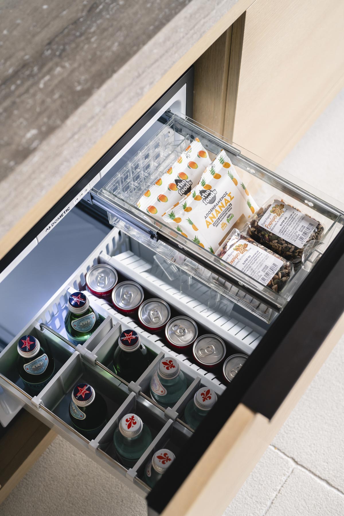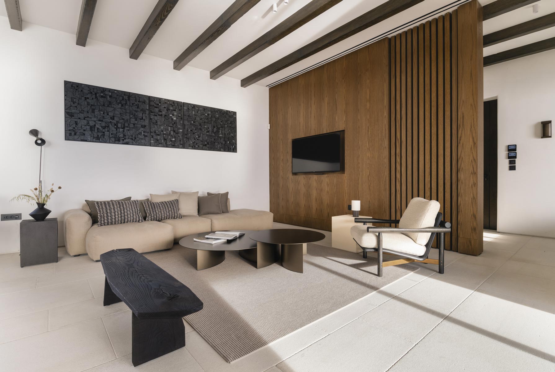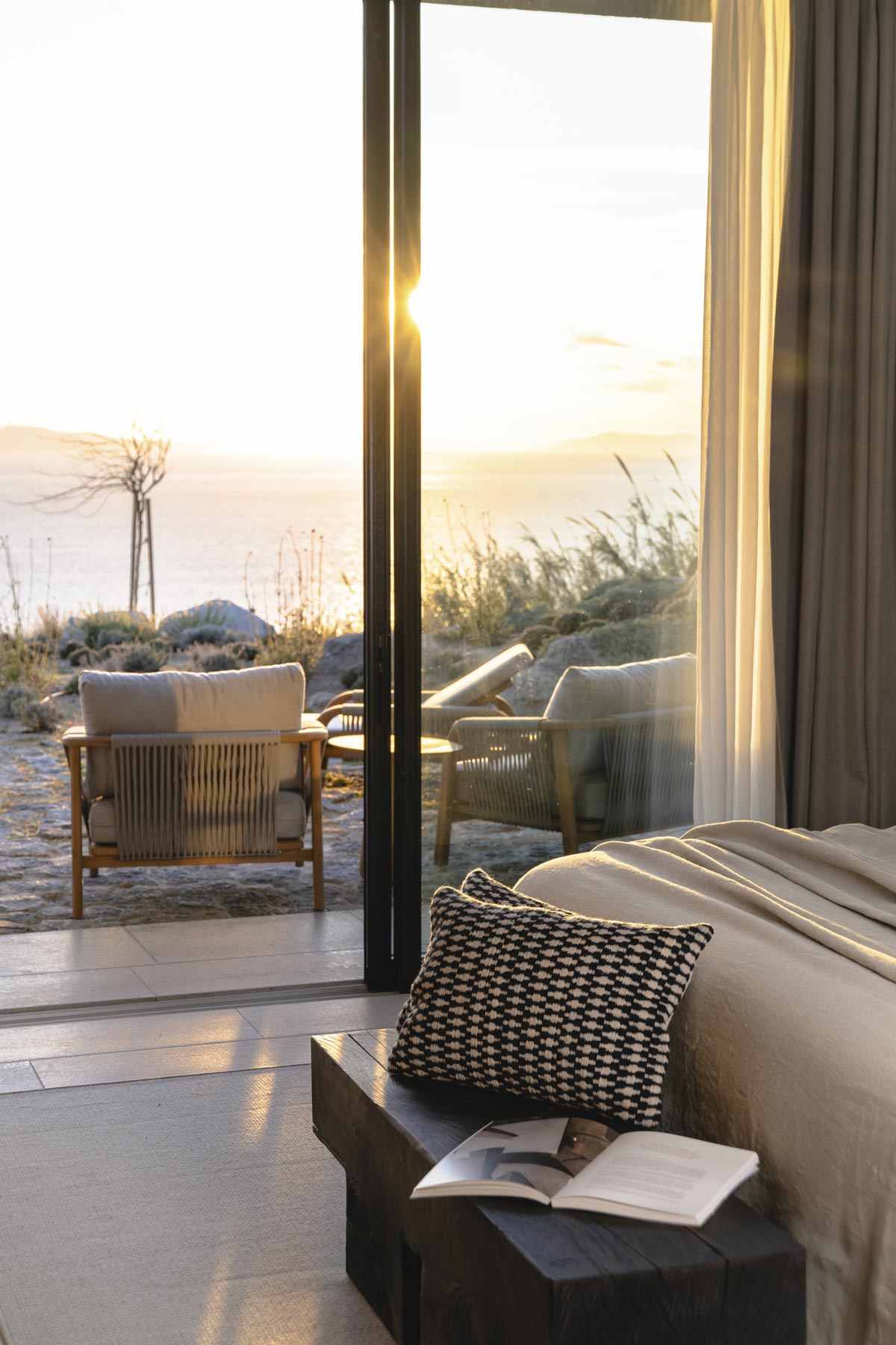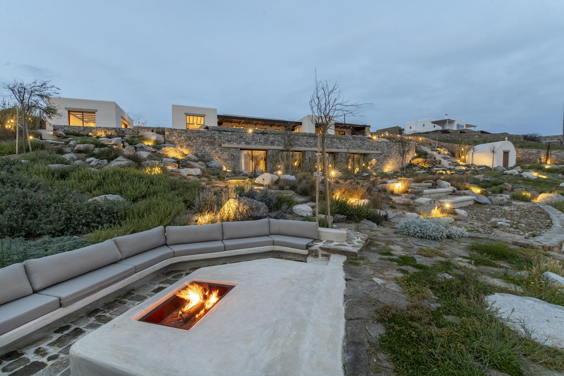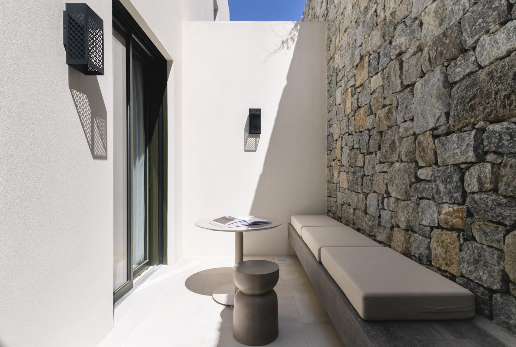 The villa’s main level features a fully equipped kitchen with direct access to the outdoor dining space, an elegant living room with views toward Delos, a professional-grade chef’s kitchen, and a guest WC. An impressive 94 m² infinity pool overlooks the sea, flanked by furnished terraces, a shaded pergola lounge, and multiple al fresco dining zones.