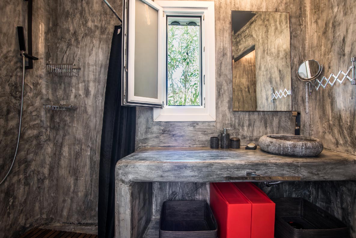 One master bedroom with queen size bed and en-suite bathroom with shower Living room leading out onto a terrace with pergola-covered lounge area