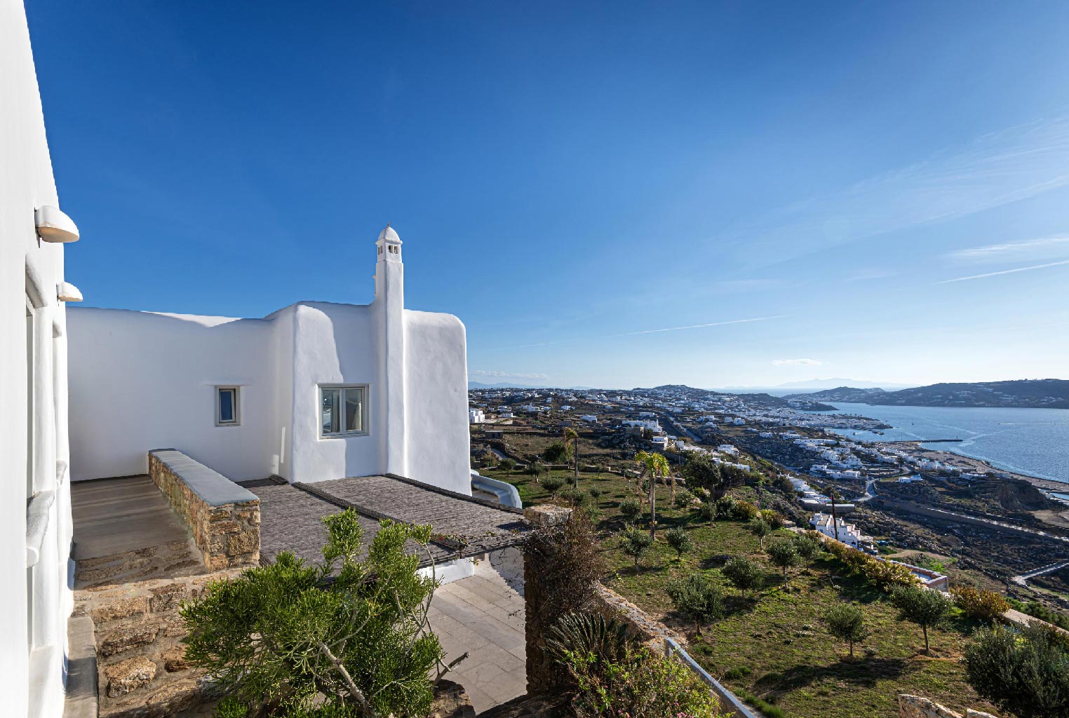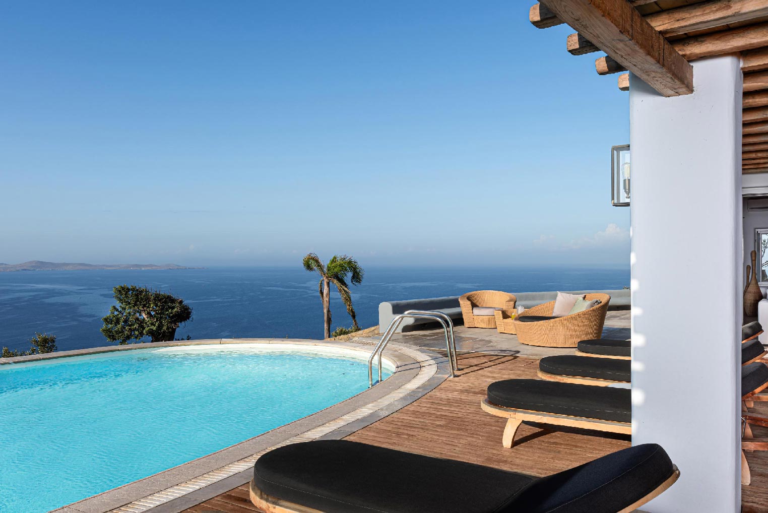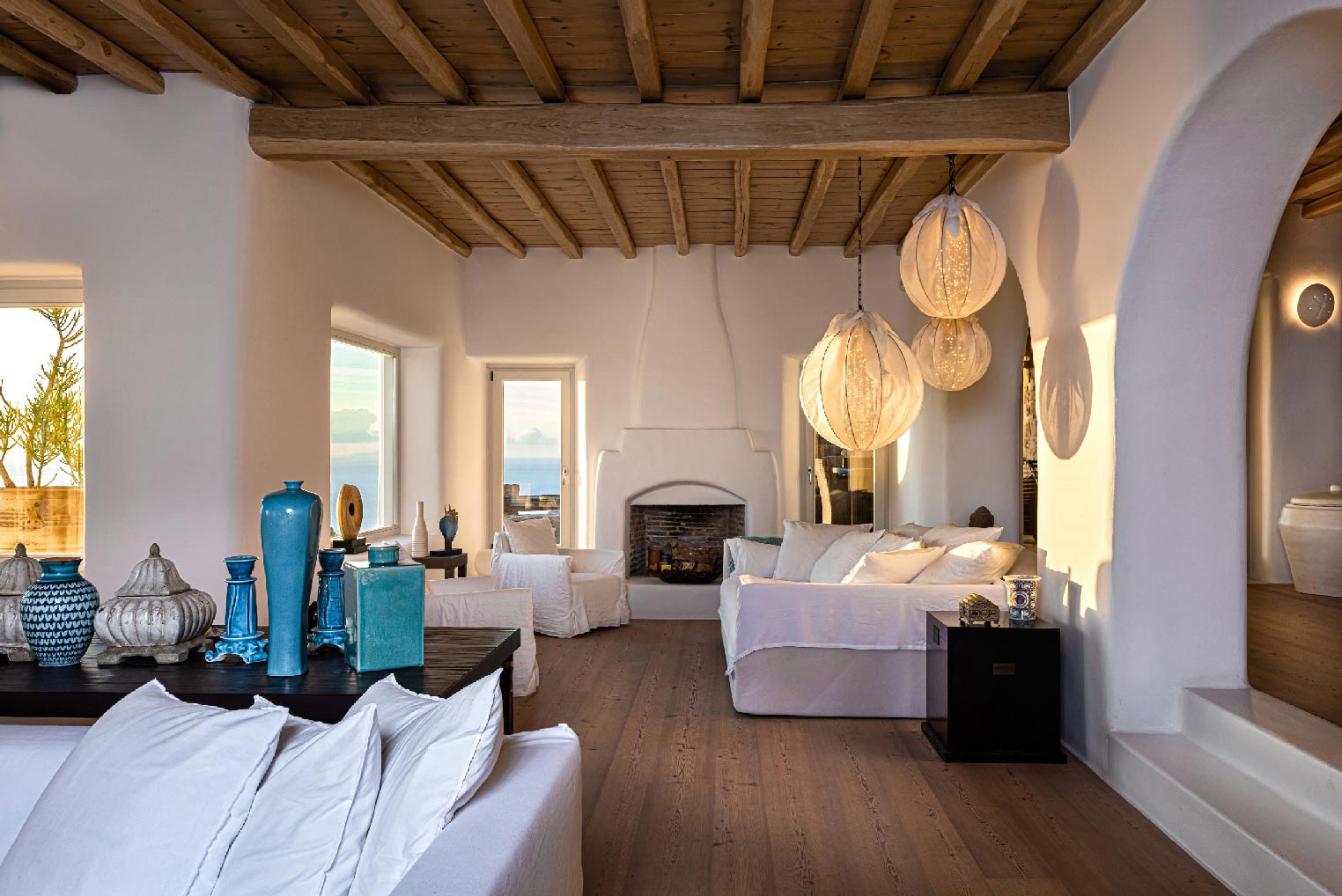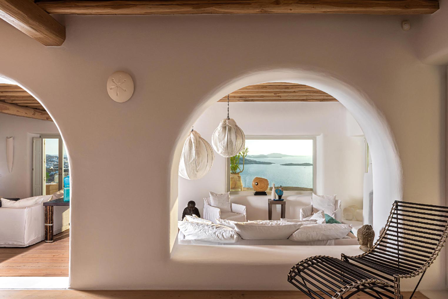 Nestled in idyllic Tourlos, above the port of Mykonos and just a five-minute drive from Mykonos Town, Villa Gaias is a private luxury estate surrounded by the island’s cosmopolitan vibes, world-famous restaurants, and vibrant social life.The villa’s unique style epitomizes the traditional Cycladic architecture complemented with modern touches, creating a cozy and laid-back luxury retreat. The villa opens into ample bright spaces with all-white walls, wooden floors and ceilings, large windows with stunning vistas, exquisite décor, and state-of-the-art furniture — the perfect place to withdraw and relax after a full day exploring Mykonos’ treasures.