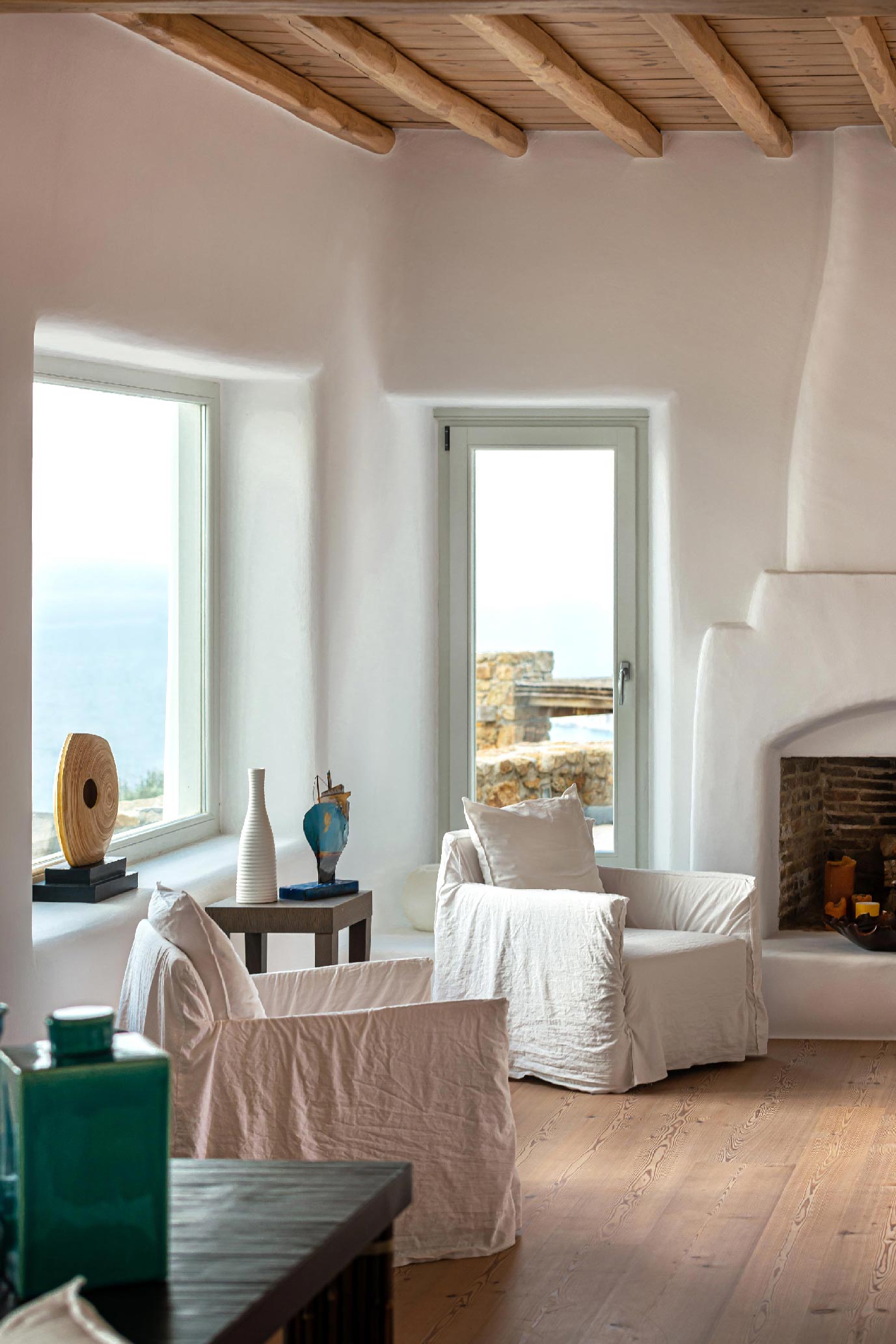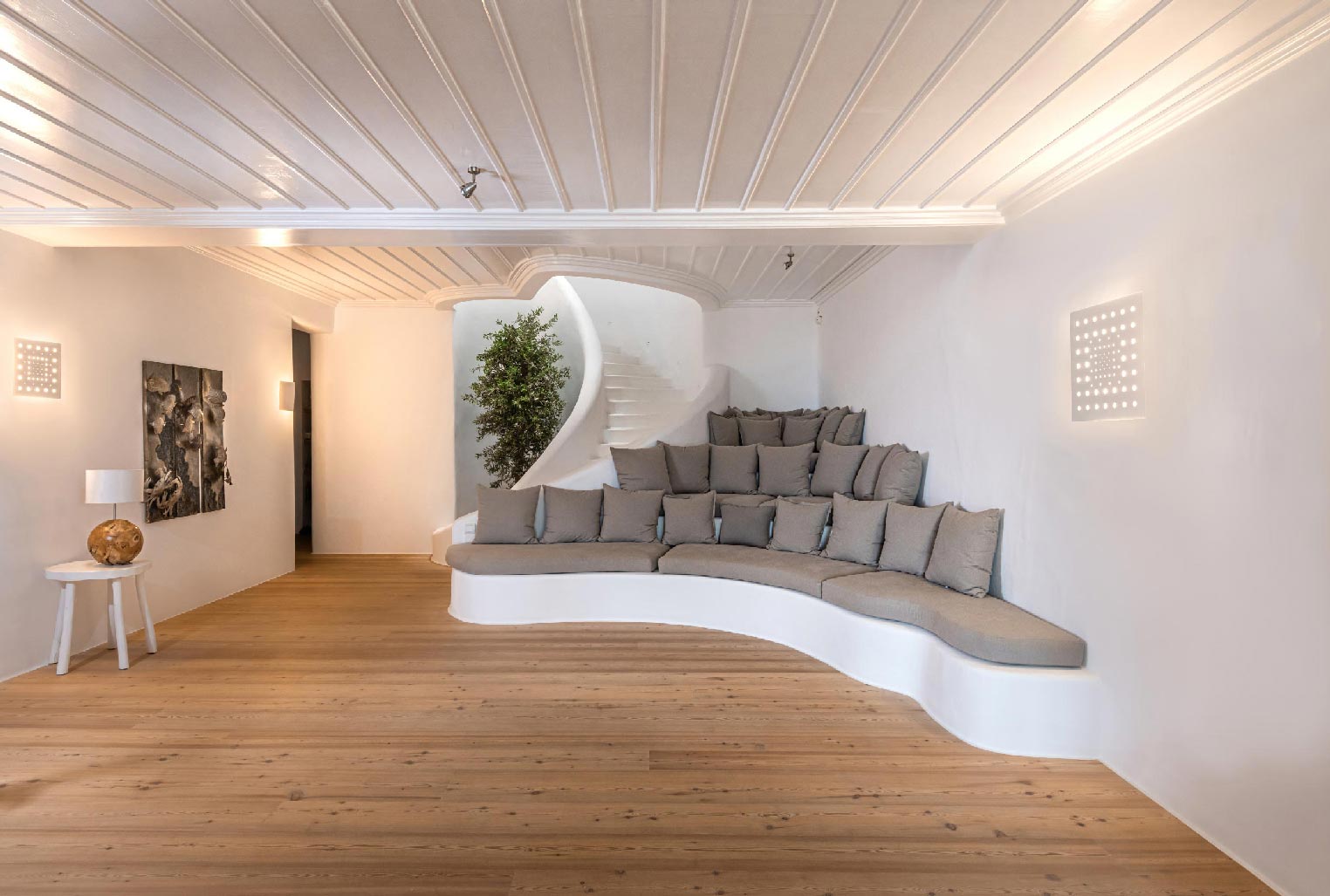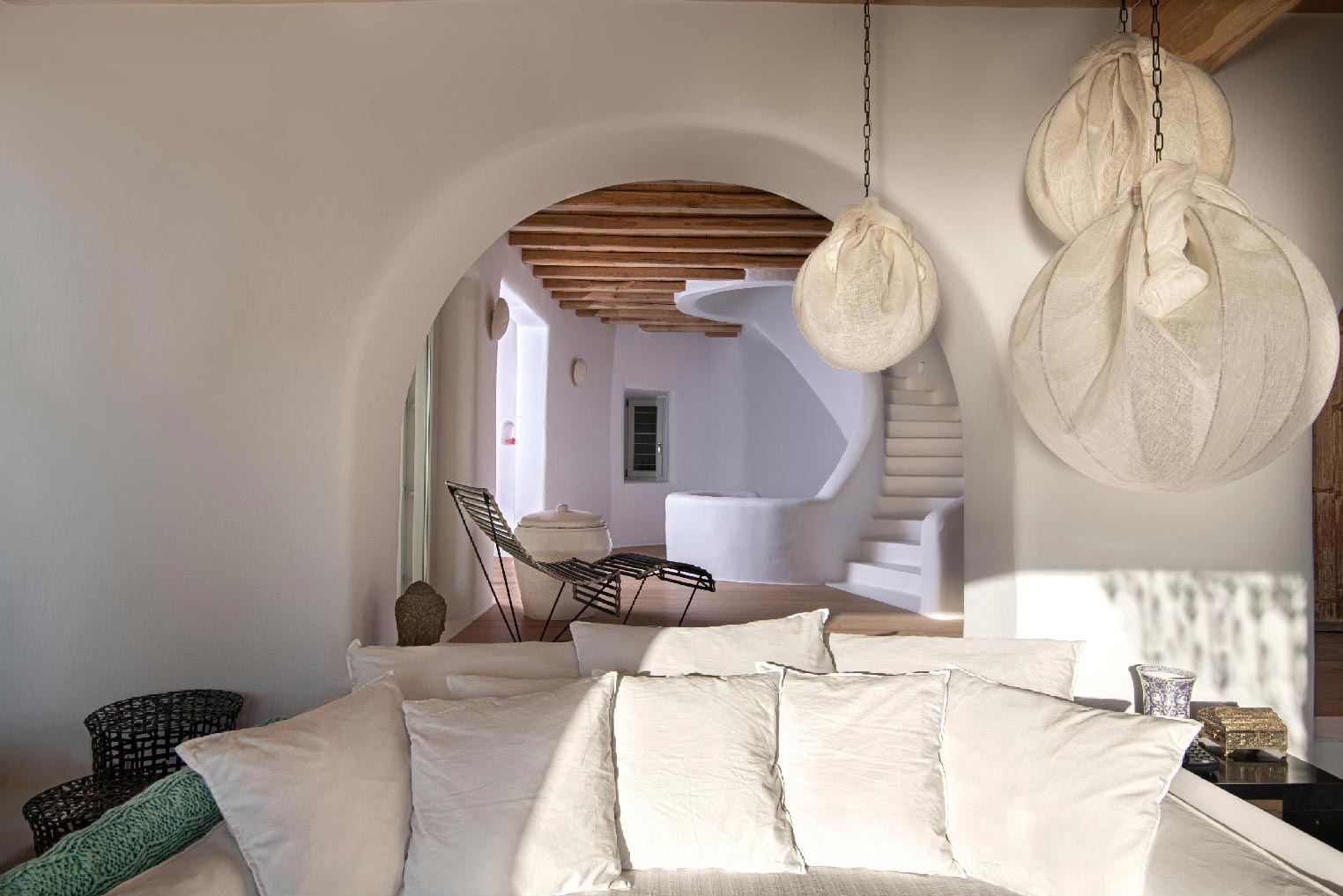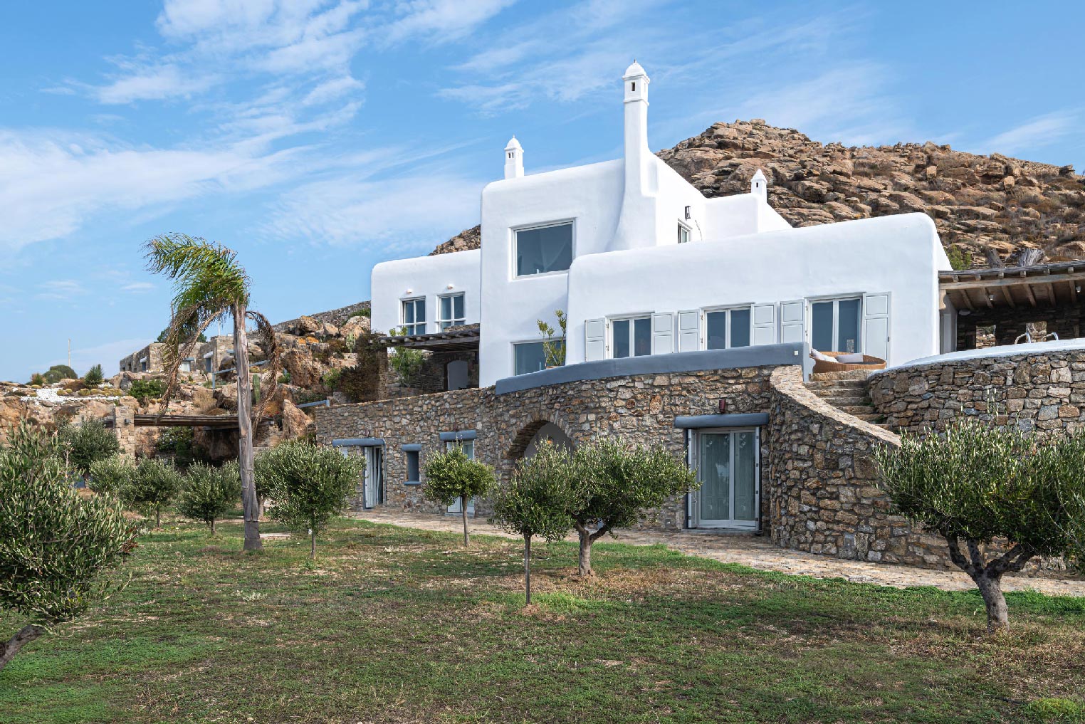 Nestled in idyllic Tourlos, above the port of Mykonos and just a five-minute drive from Mykonos Town, Villa Gaias is a private luxury estate surrounded by the island’s cosmopolitan vibes, world-famous restaurants, and vibrant social life.The villa’s unique style epitomizes the traditional Cycladic architecture complemented with modern touches, creating a cozy and laid-back luxury retreat. The villa opens into ample bright spaces with all-white walls, wooden floors and ceilings, large windows with stunning vistas, exquisite décor, and state-of-the-art furniture — the perfect place to withdraw and relax after a full day exploring Mykonos’ treasures.