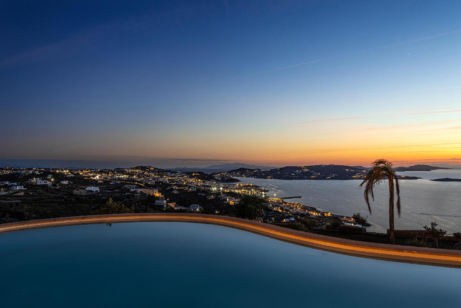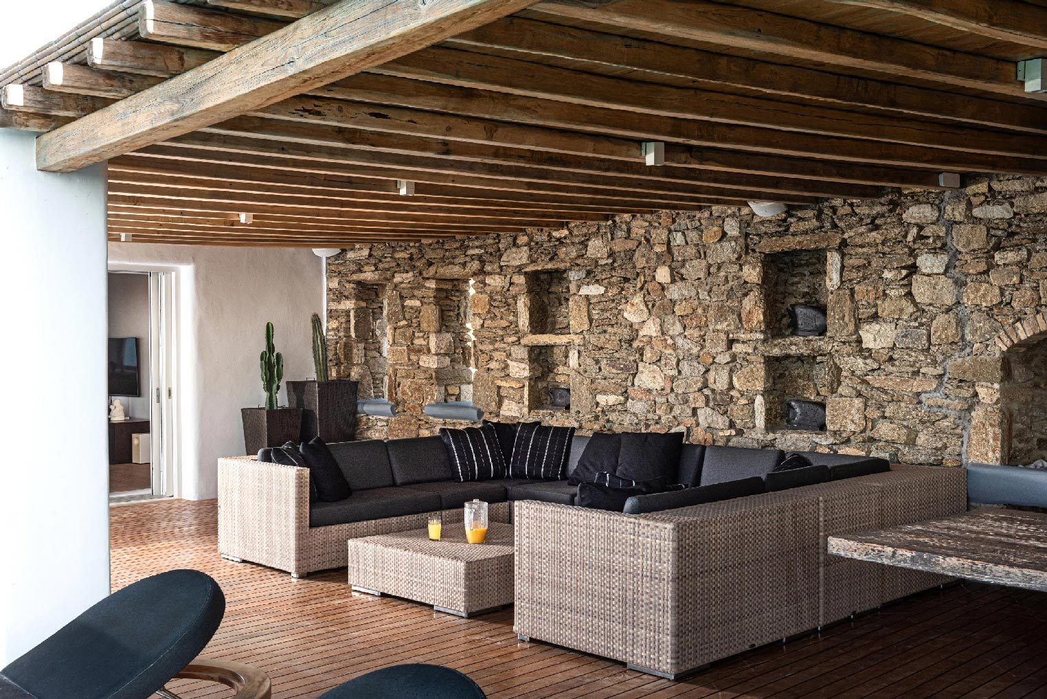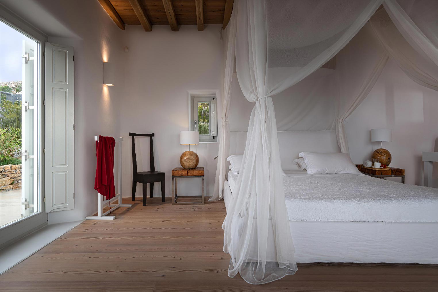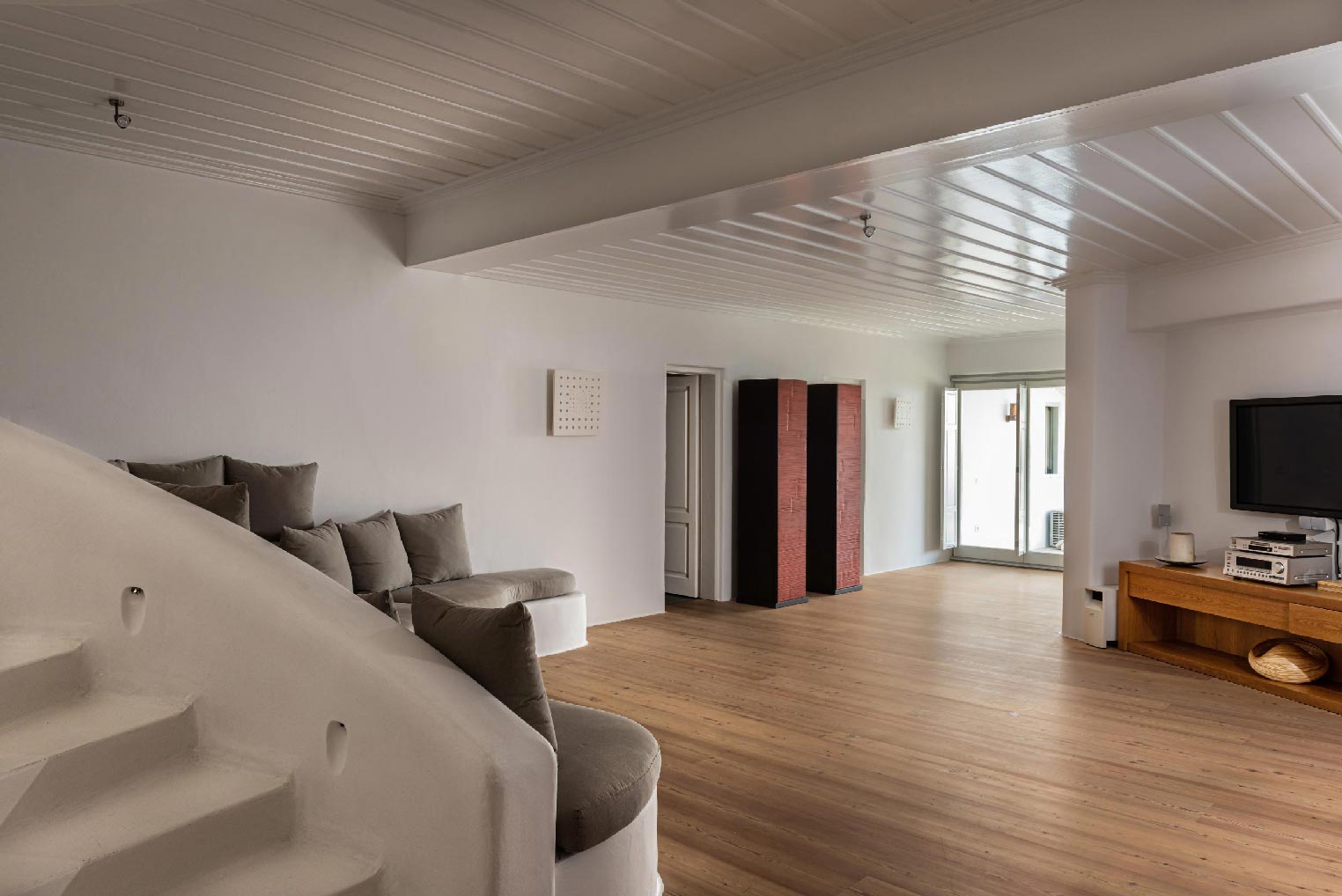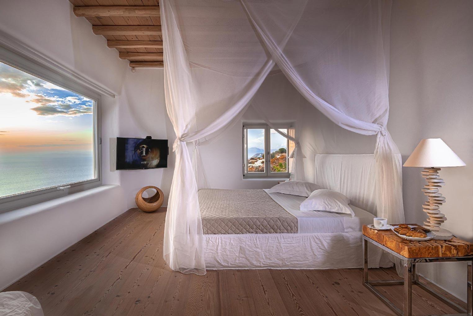 Nestled in idyllic Tourlos, above the port of Mykonos and just a five-minute drive from Mykonos Town, Villa Gaias is a private luxury estate surrounded by the island’s cosmopolitan vibes, world-famous restaurants, and vibrant social life.The villa’s unique style epitomizes the traditional Cycladic architecture complemented with modern touches, creating a cozy and laid-back luxury retreat. The villa opens into ample bright spaces with all-white walls, wooden floors and ceilings, large windows with stunning vistas, exquisite décor, and state-of-the-art furniture — the perfect place to withdraw and relax after a full day exploring Mykonos’ treasures.